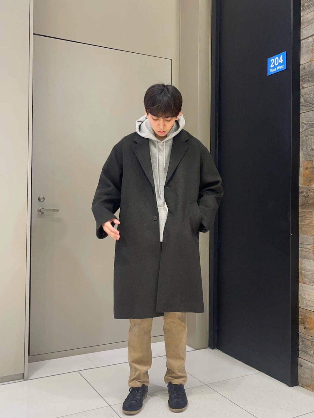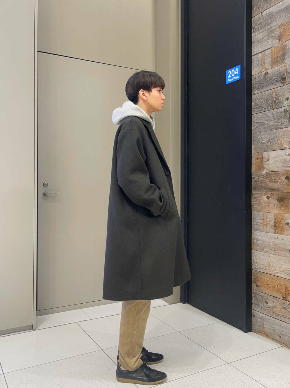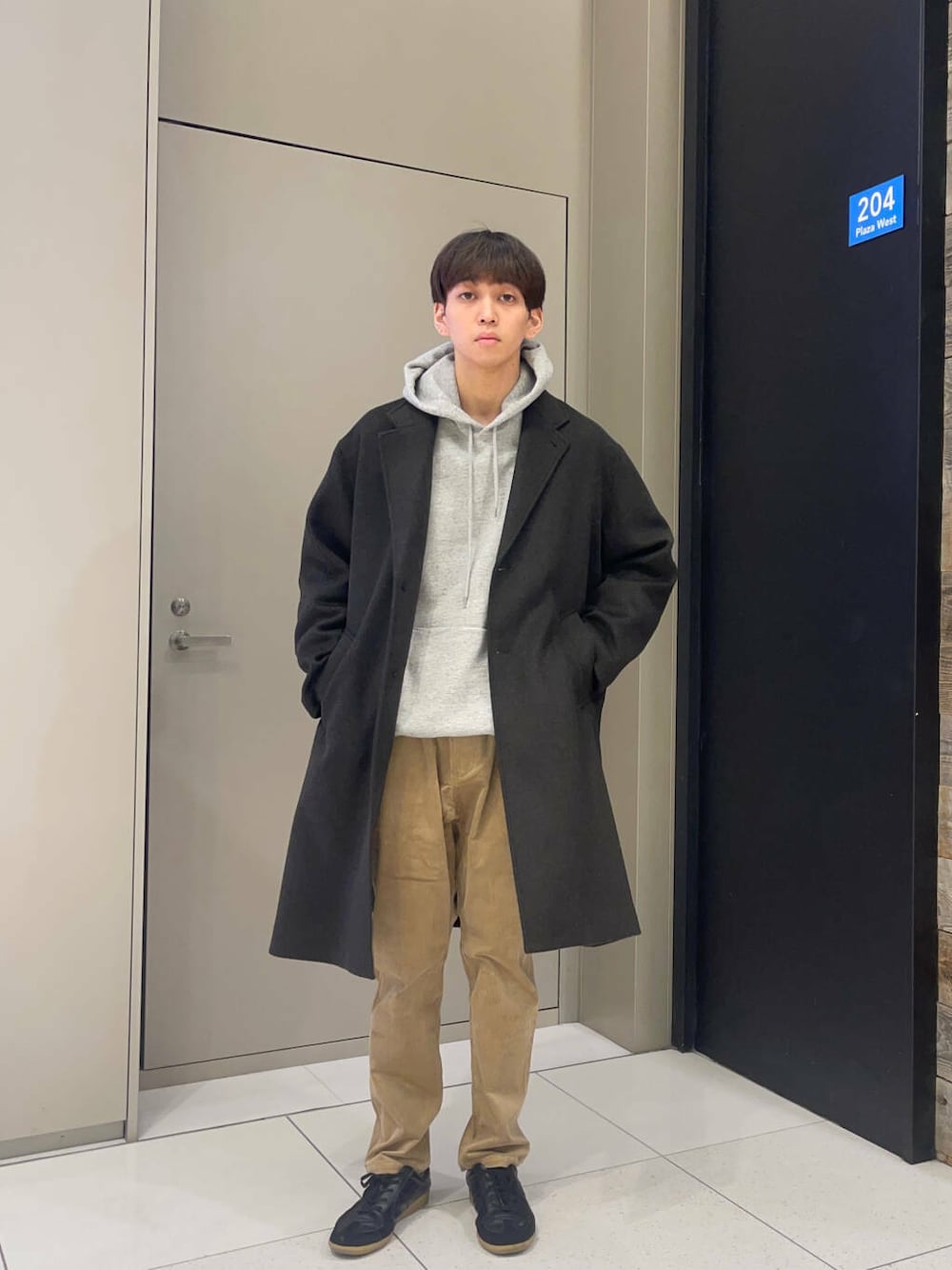 綺麗めなコートにパーカーにコーデュロイパンツを合わせ綺麗めカジュアルスタイルにしてるところがポイントです!