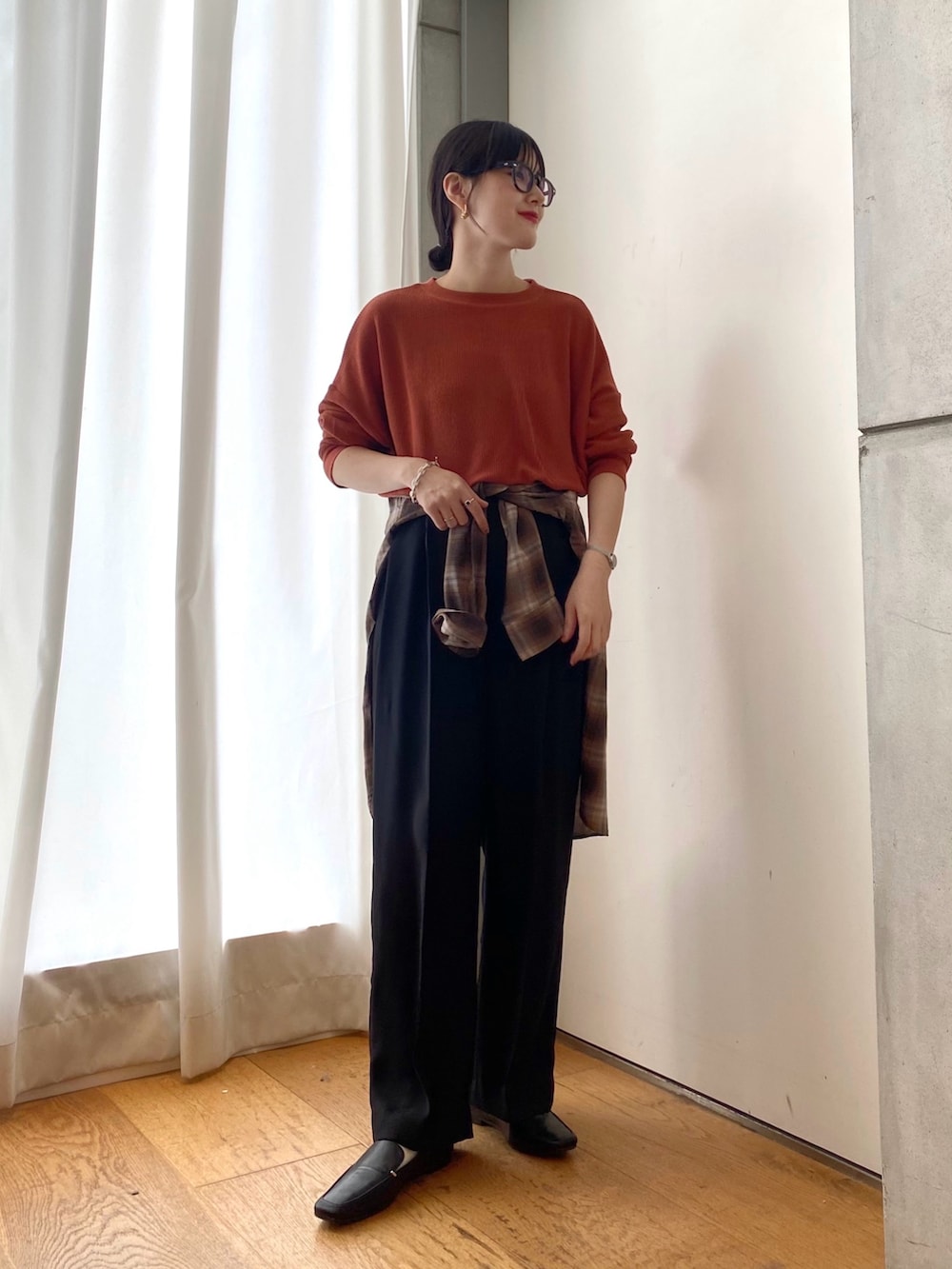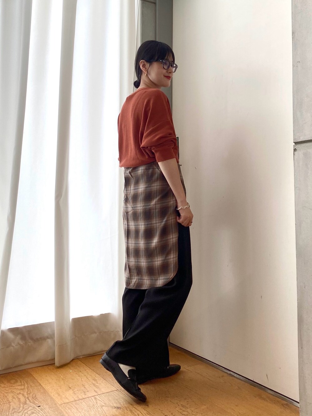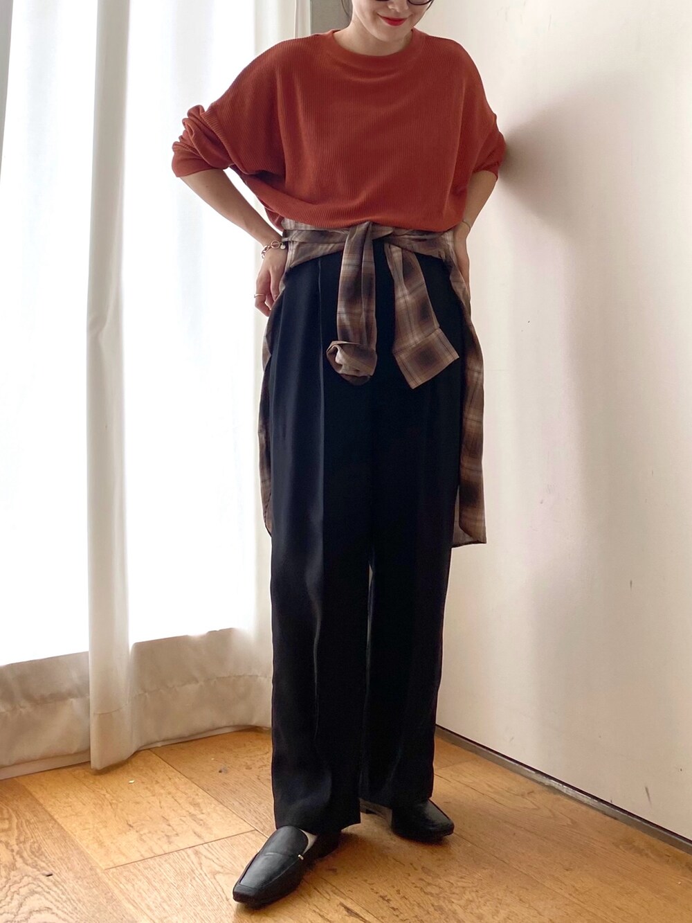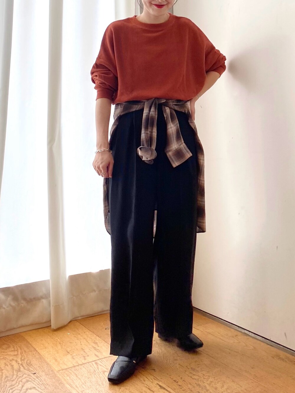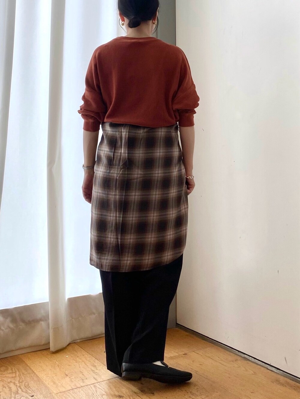 チェックシャツを腰巻きしてアクセントにしました!