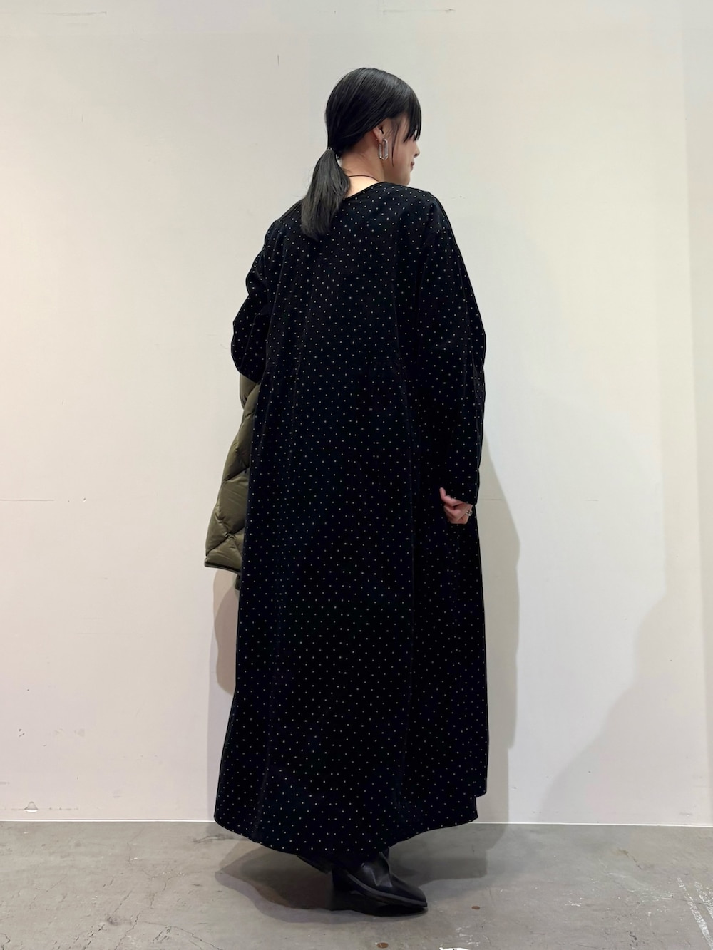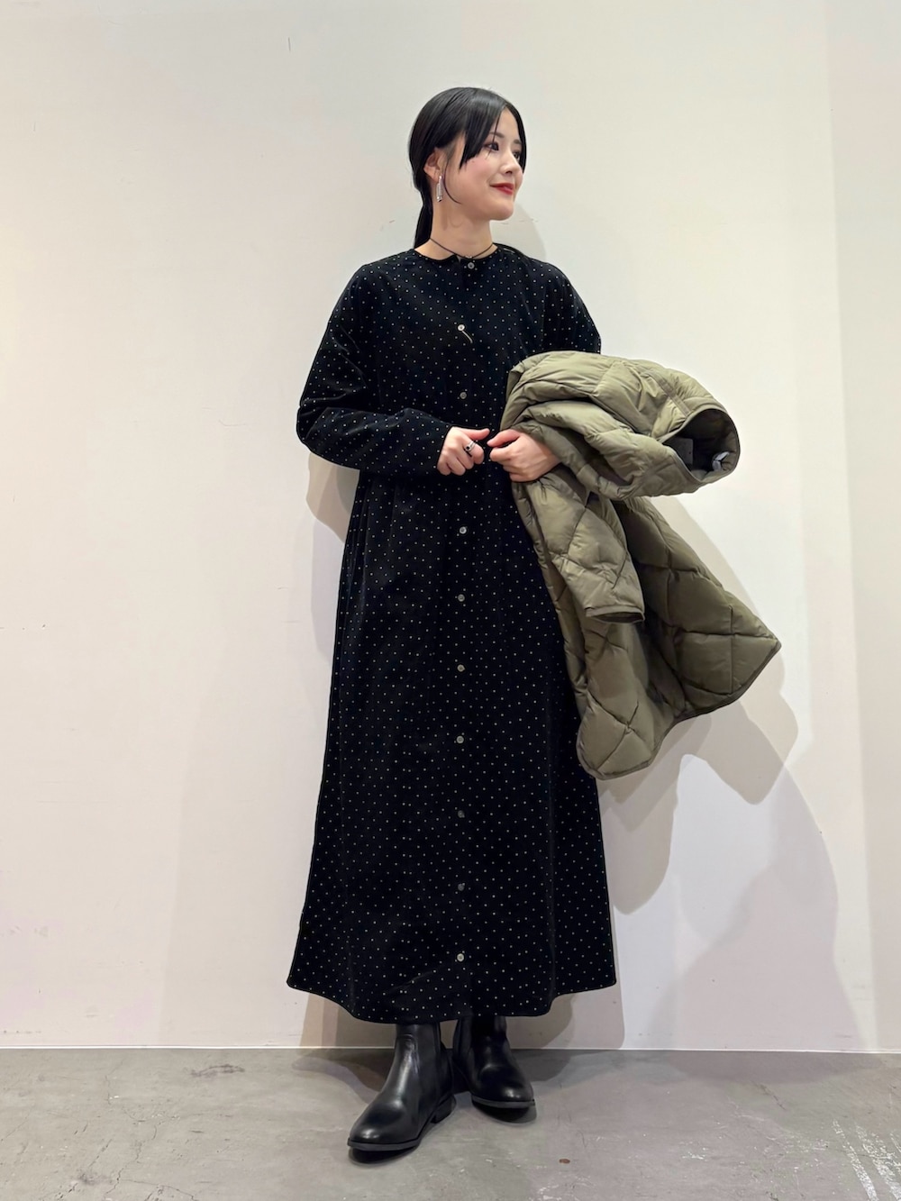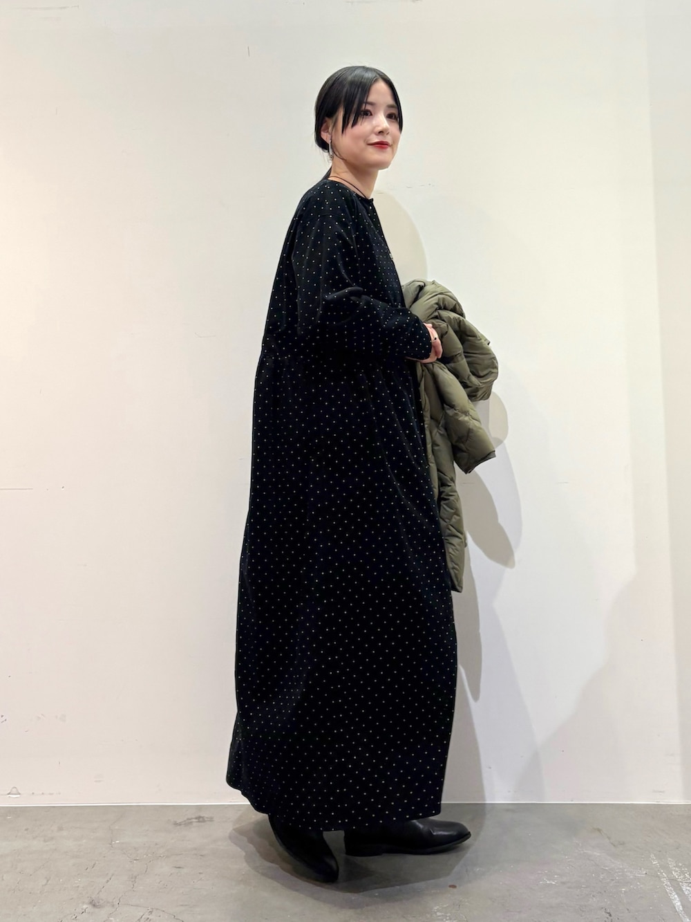 ワンピースは小さめのドットがさりげなく、普段柄物を着ない方にもおすすめです◎
