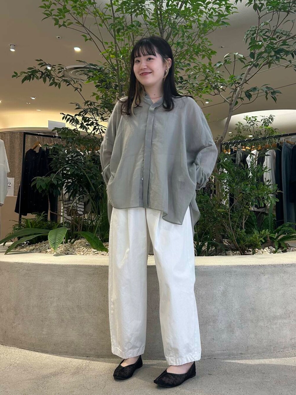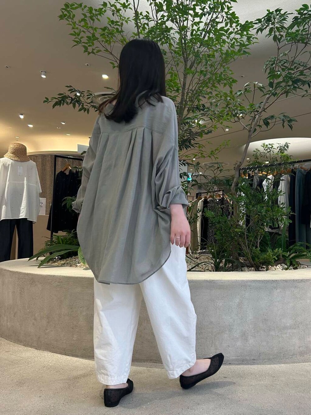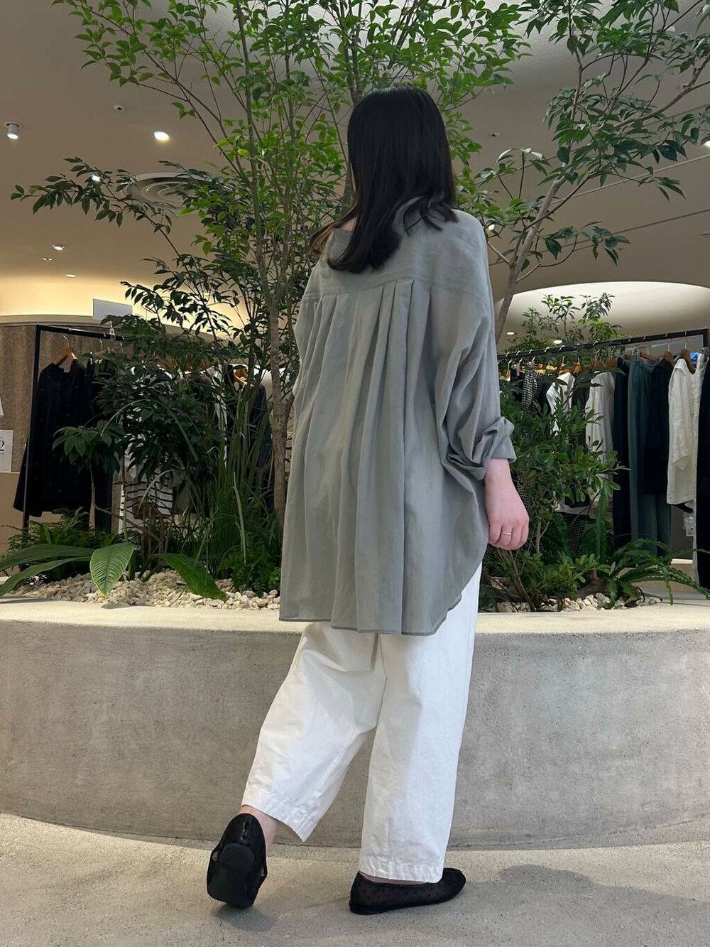 SAGEカラーが秋を感じるワイドシャツは、シアー感が爽やかで、涼しく着ていただけます✨バックタックが入っていて、さりげなくふわっと揺れるシルエットがすごく綺麗で爽やかです🧊後ろ身頃は長めで、お尻までしっかり隠してくれます!✨