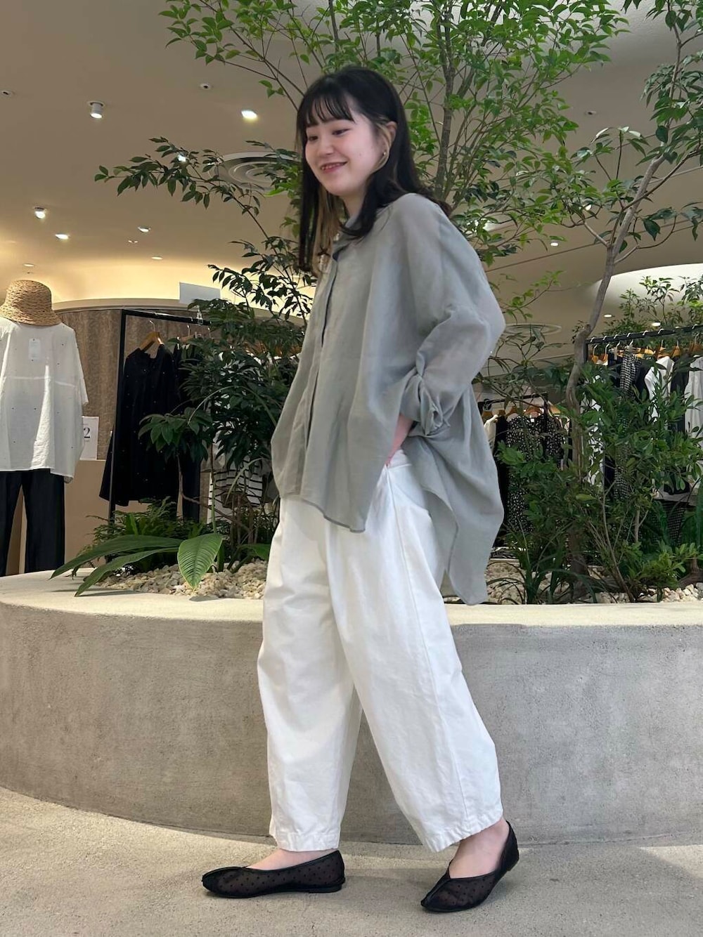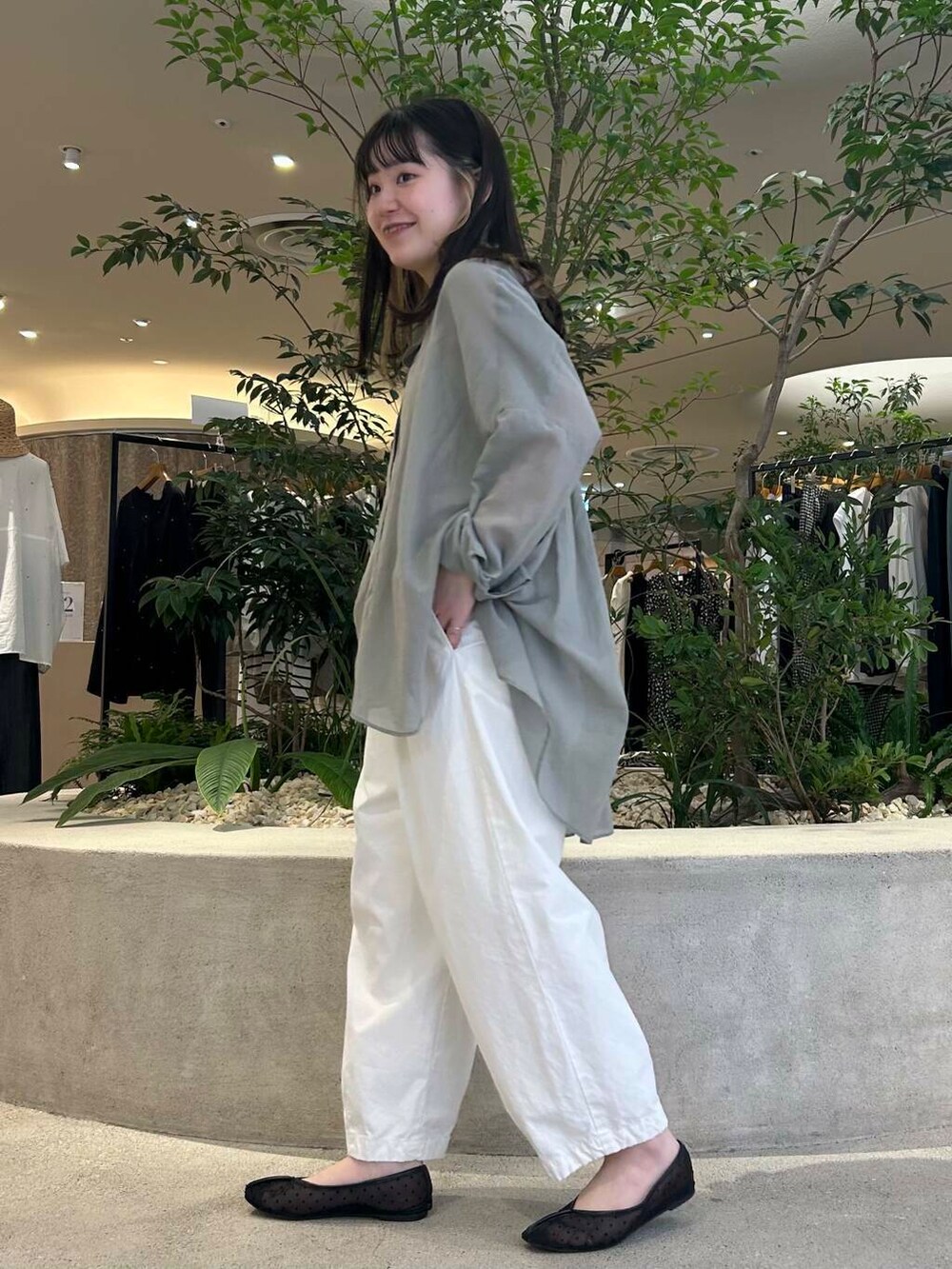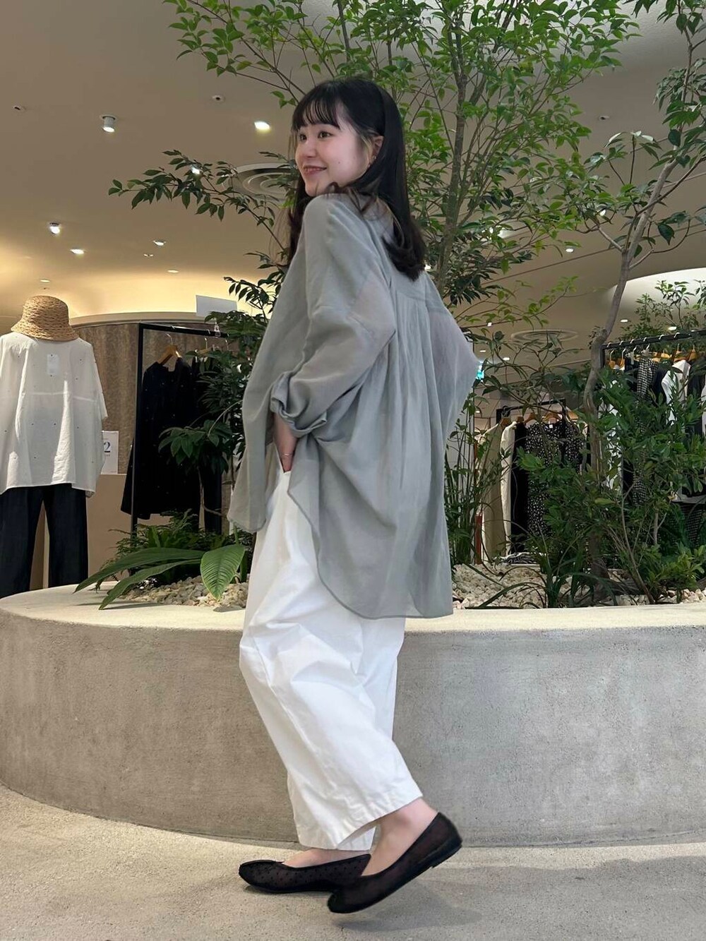 SAGEカラーが秋を感じるワイドシャツは、シアー感が爽やかで、涼しく着ていただけます✨バックタックが入っていて、さりげなくふわっと揺れるシルエットがすごく綺麗で爽やかです🧊後ろ身頃は長めで、お尻までしっかり隠してくれます!✨