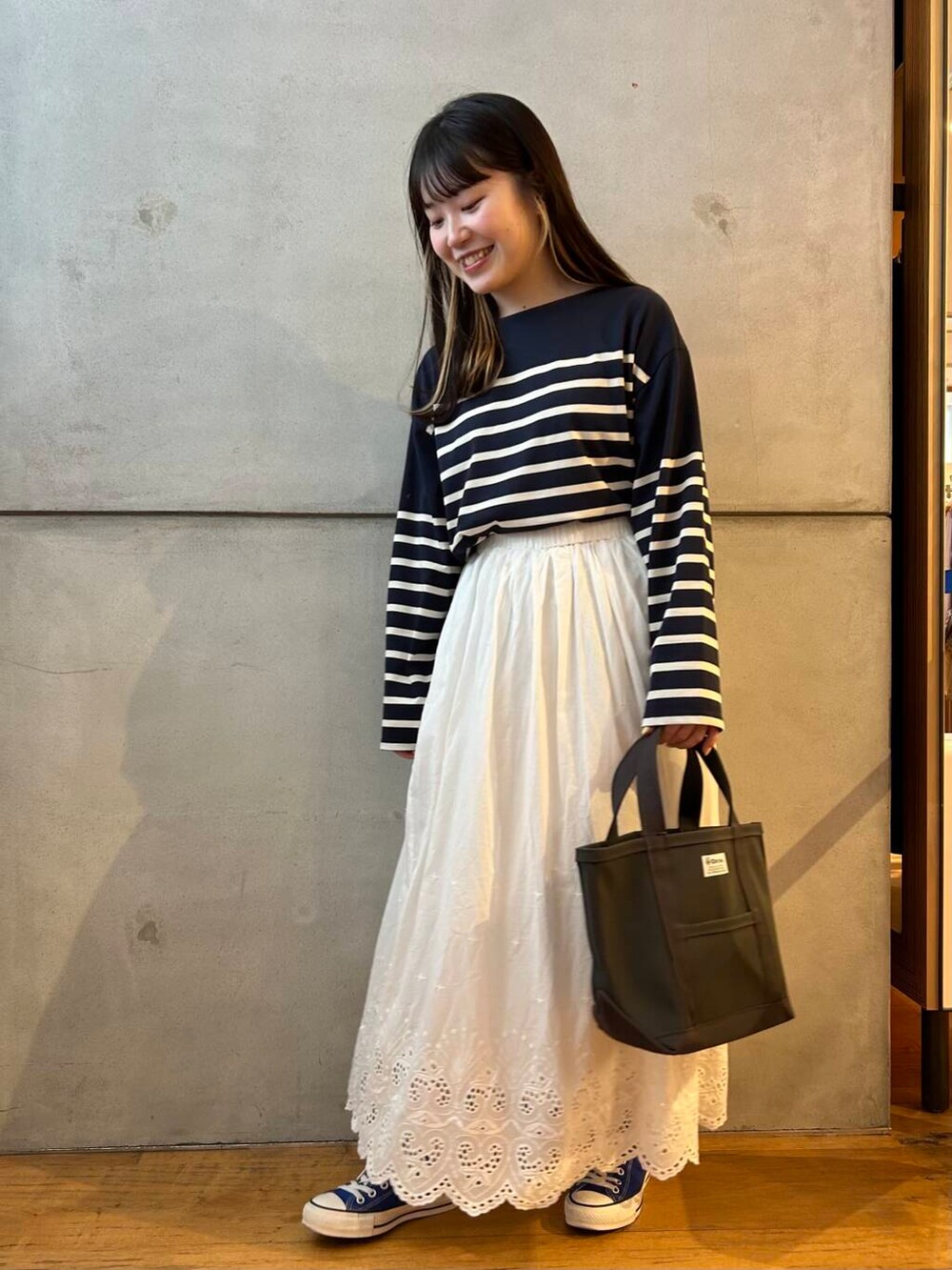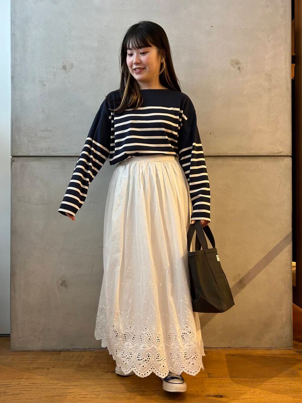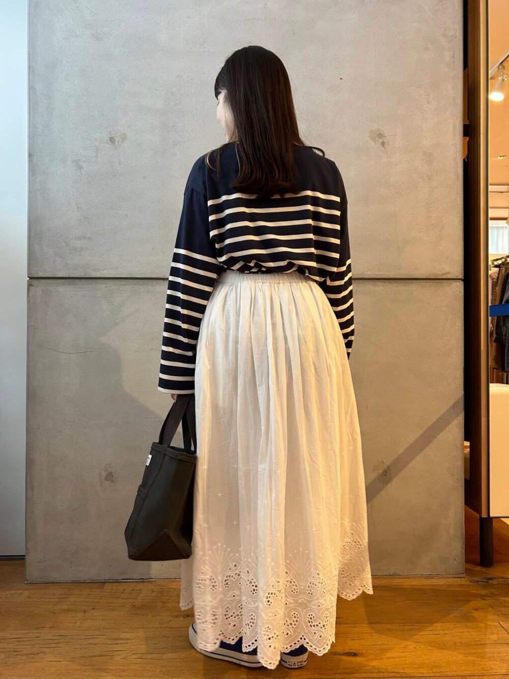 ボーダーはカジュアルになりがちですが、レーススカートを合わせることで可愛らしさがプラスされてお出かけコーデにぴったり🫶🏻