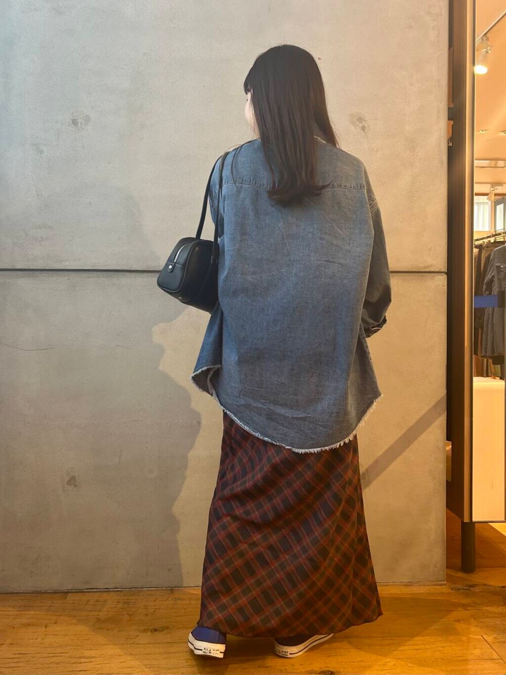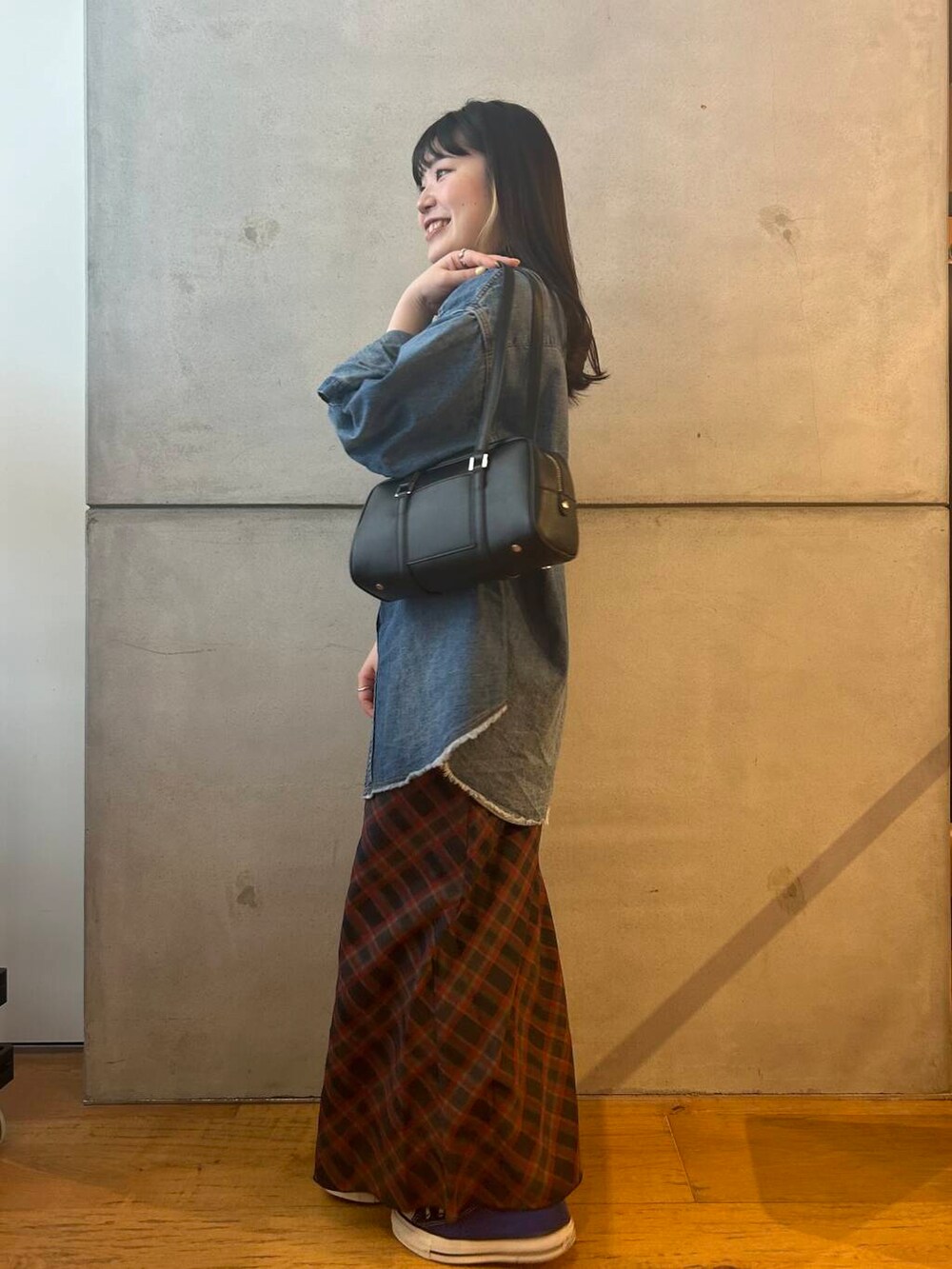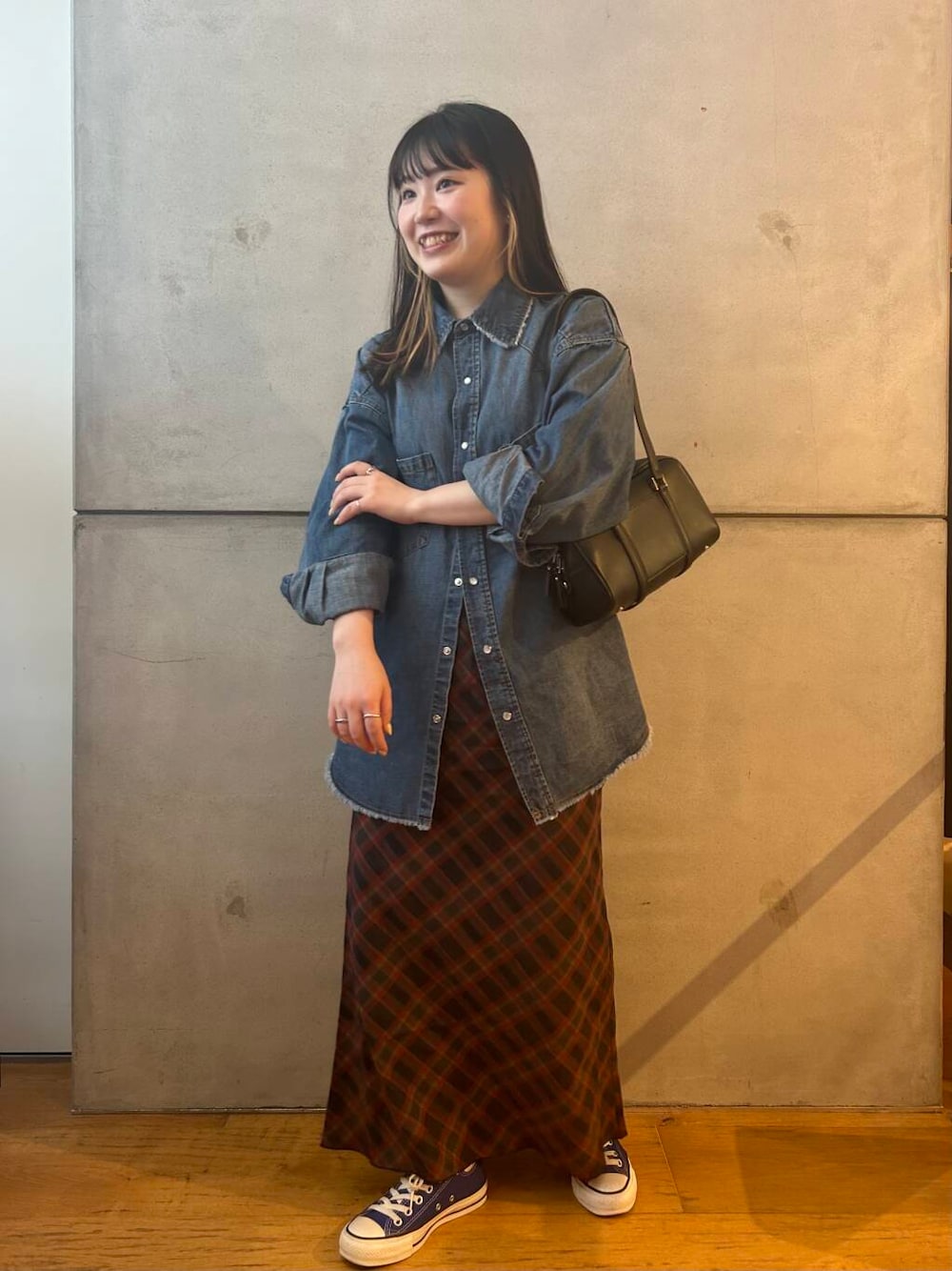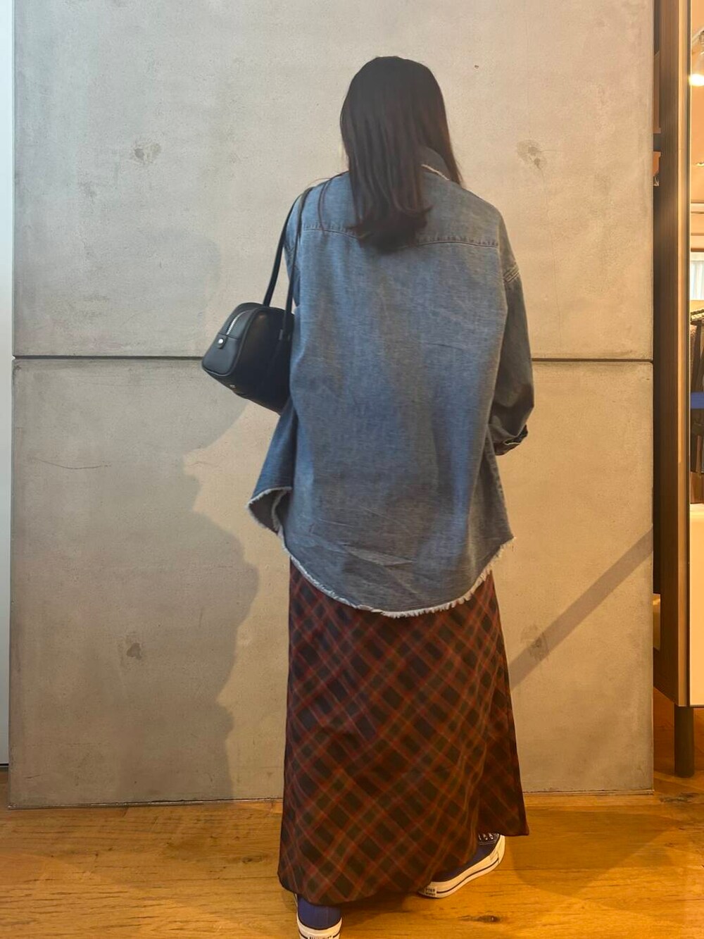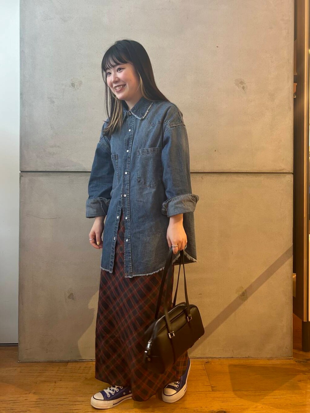 襟と裾のフリンジが可愛いデニムシャツは、羽織でも一枚でも着られて重宝します✨低身長さんはボタンを全部開けたり、下3つ程開けるスタイリングがバランスよく見えておすすめです🫶🏻