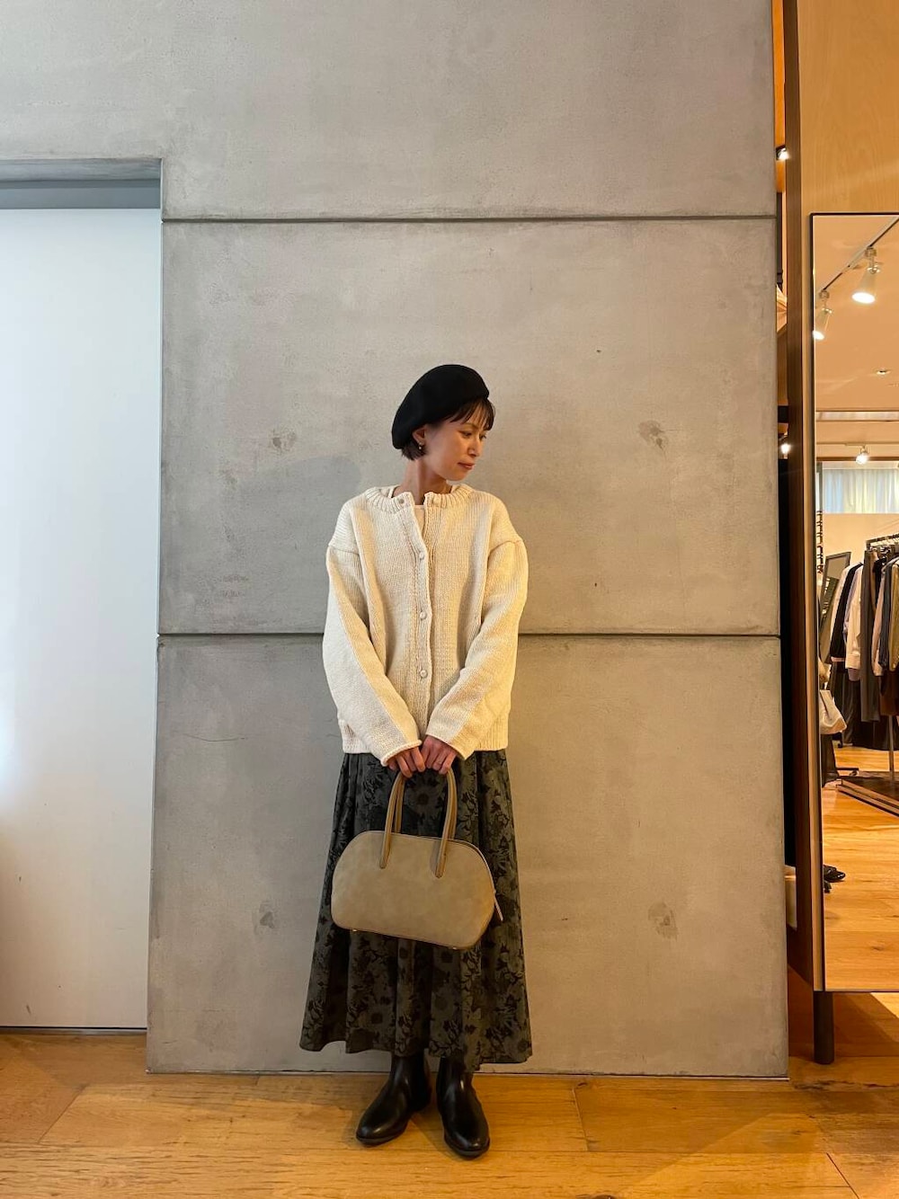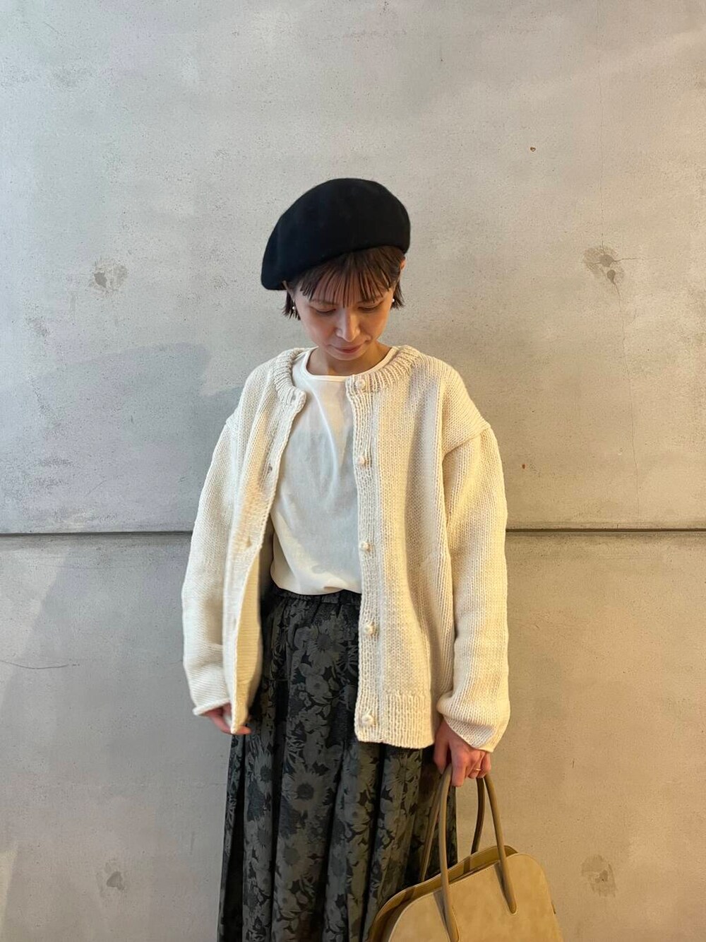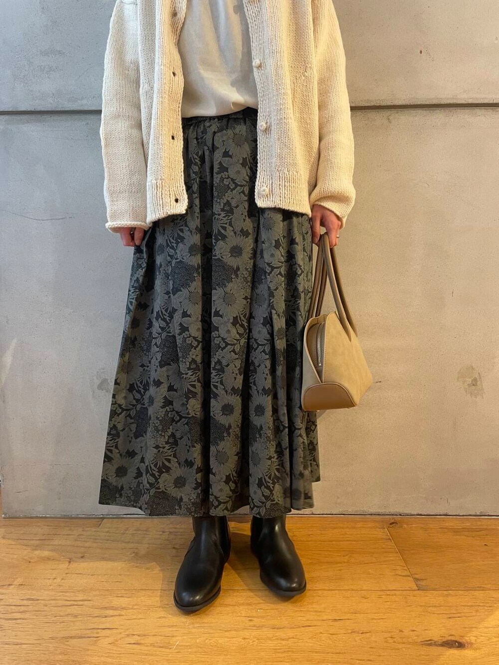 ペルークルーカーディガンは毛100%で暖かく、毛並みも柔らかいので着心地もよく軽いので羽織りやすいです。パンツに合わせて着て頂いても、カジュアル感になり、冬おすすめのニットになってます。スカートの柄も落ち着いたカラーなので、ブラックやダークグレーなのどモノトーンの、トップスや赤青などのビビットなカラーに合わせてもおすすめです‼︎