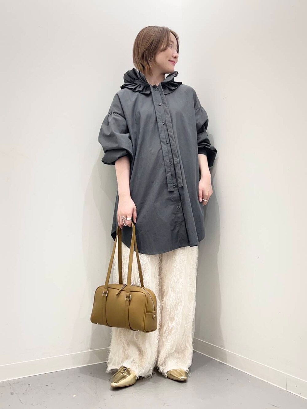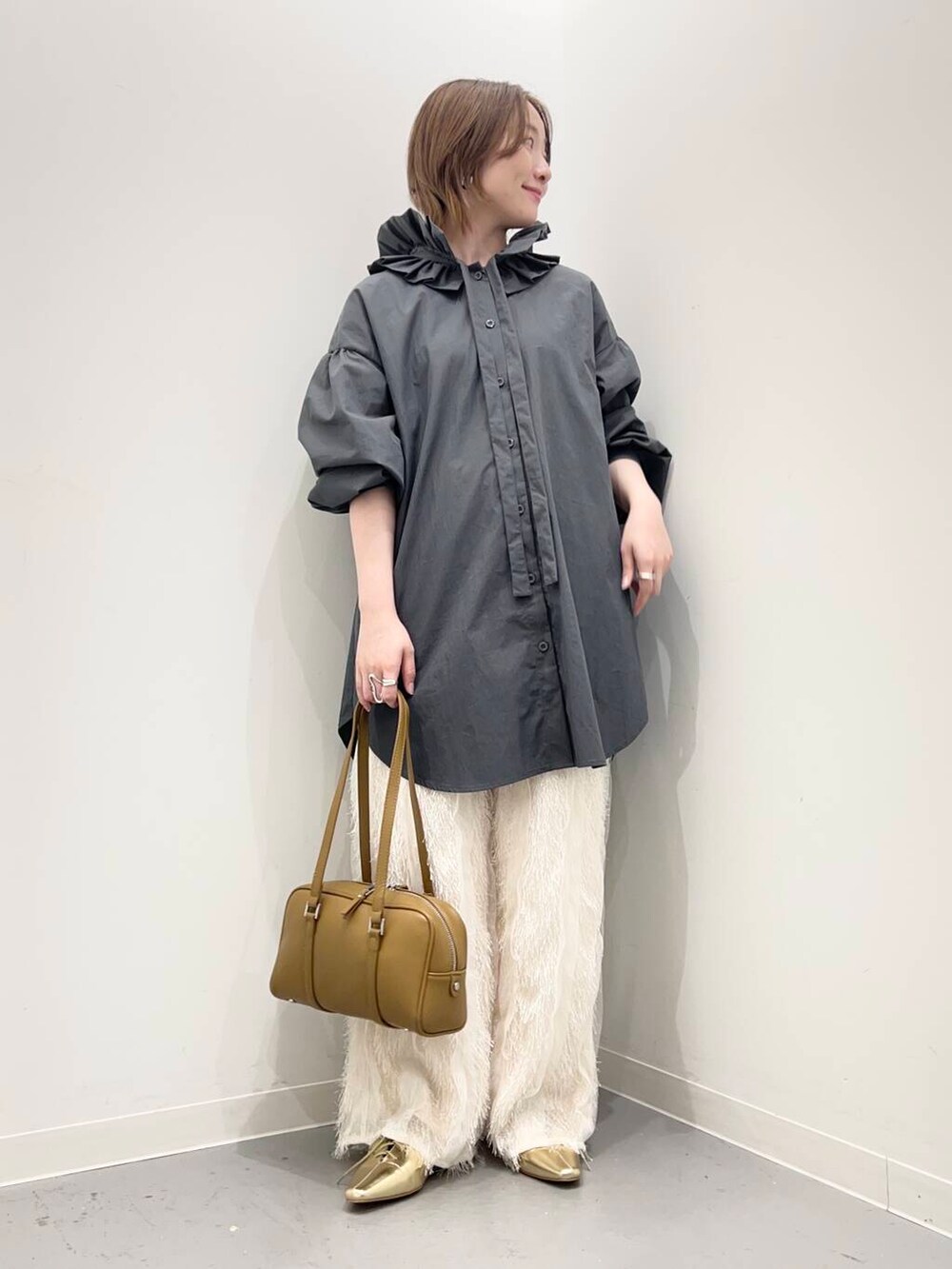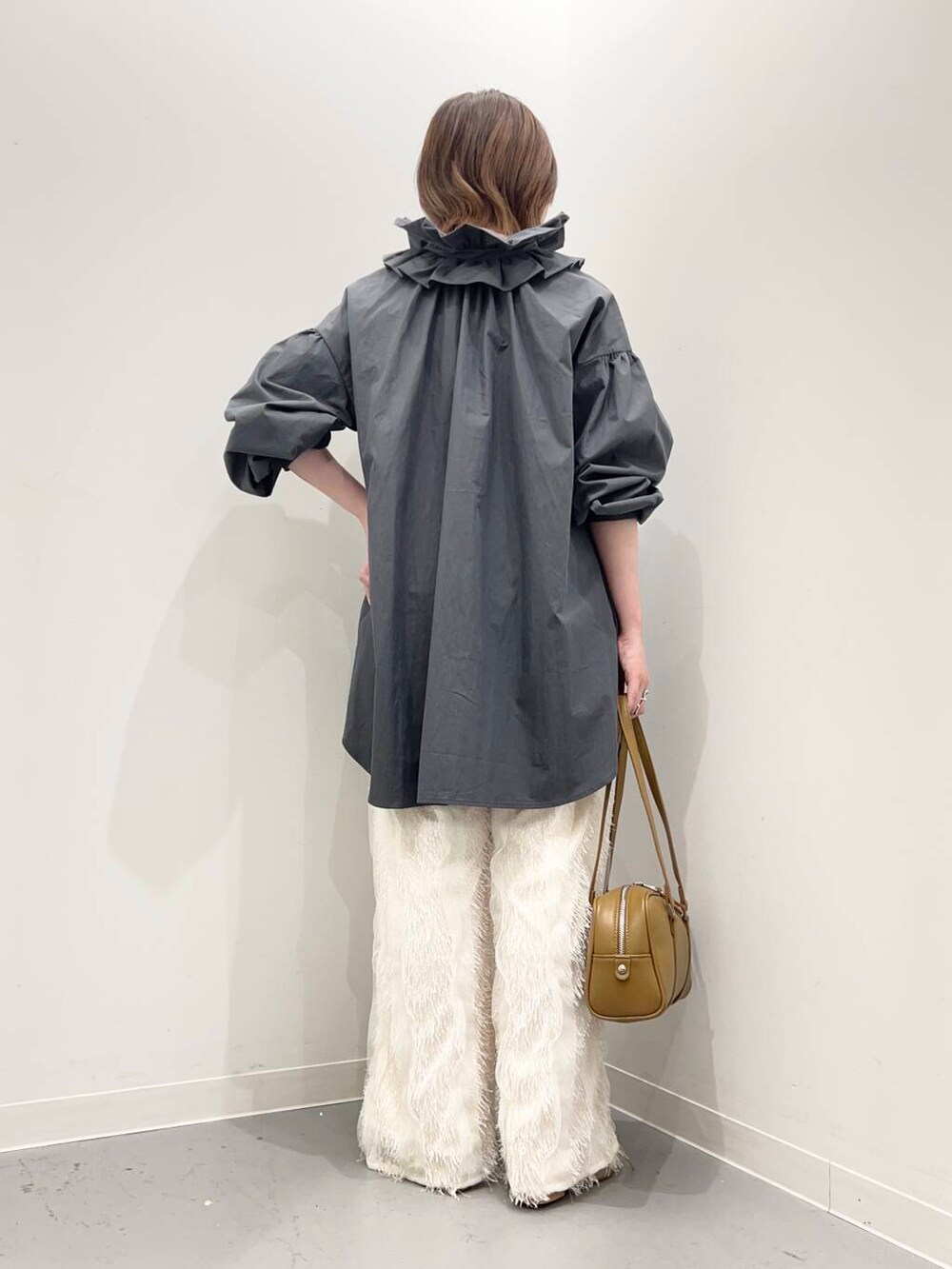 スタンドネックになったフリルがかわいいシャツは、チュニック丈で腰回りをカバーしてくれるアイテムです◎