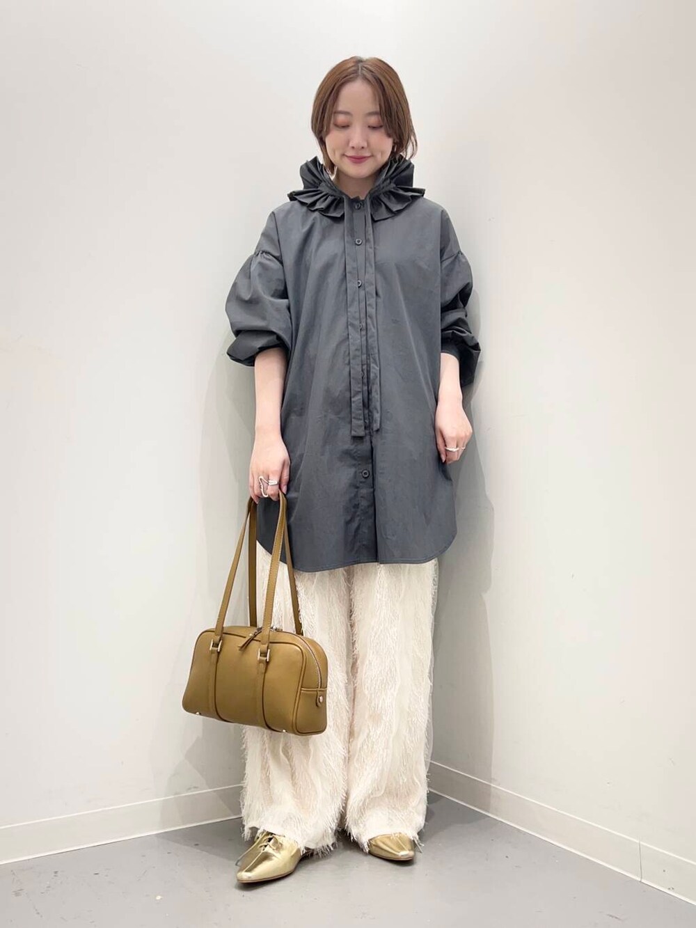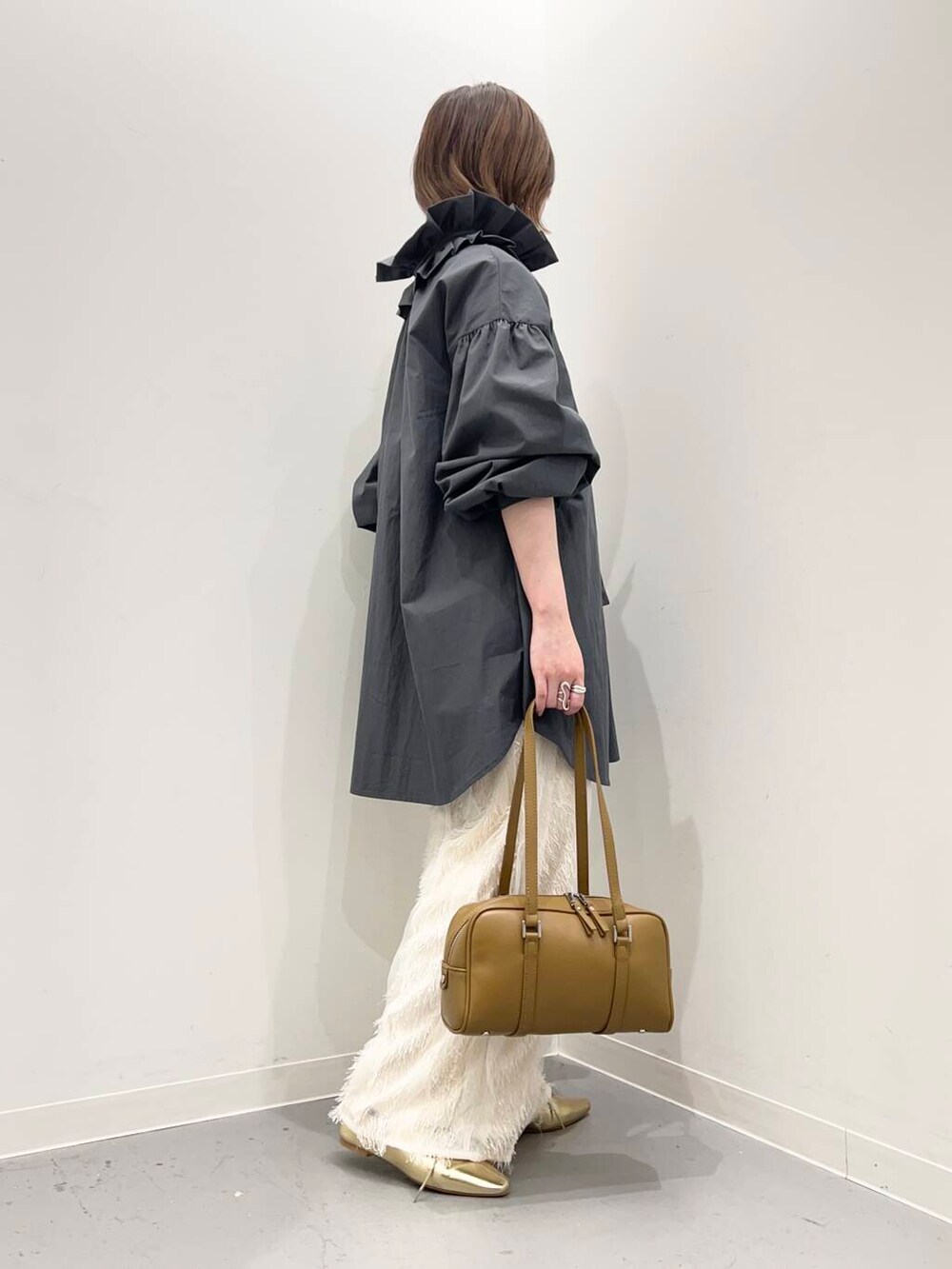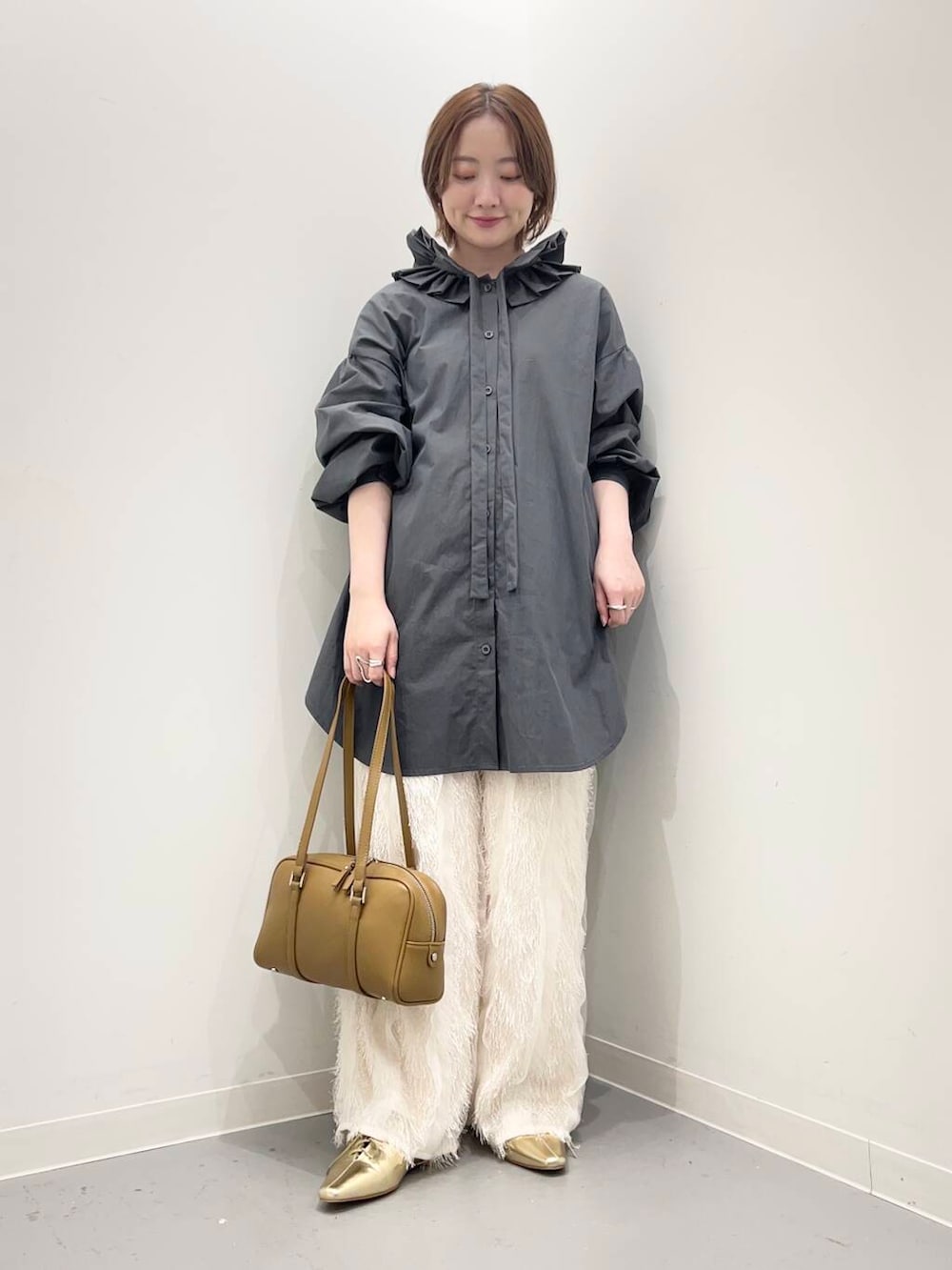 スタンドネックになったフリルがかわいいシャツは、チュニック丈で腰回りをカバーしてくれるアイテムです◎