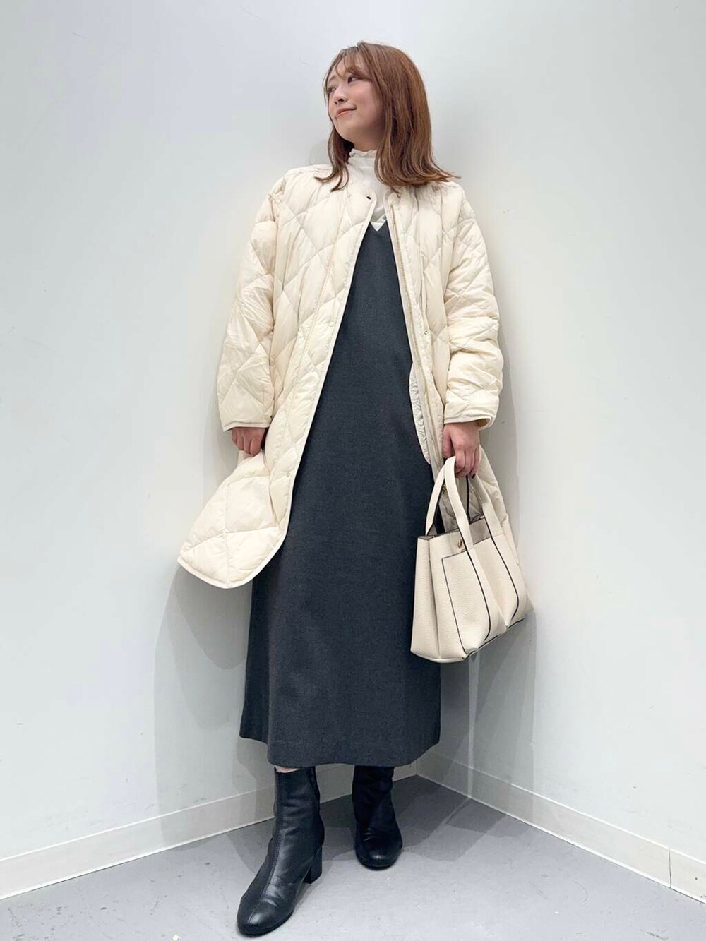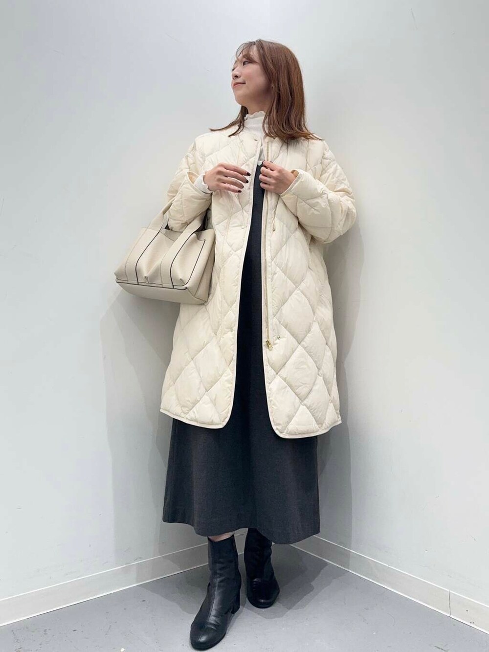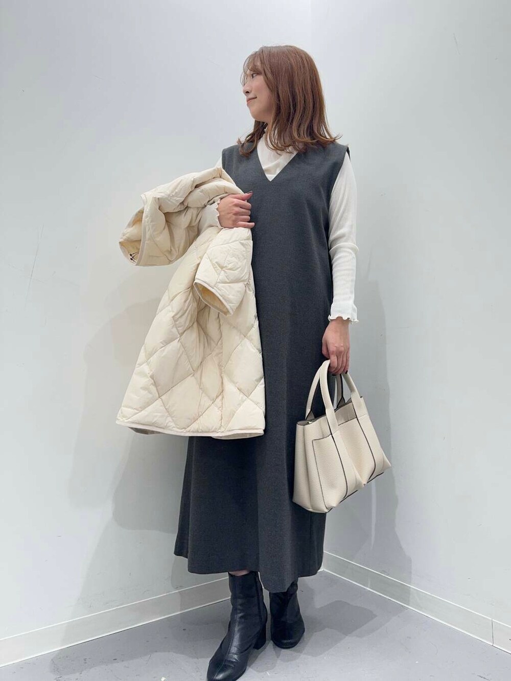 ゆったりとしたサイズ感で中に厚手のニットを