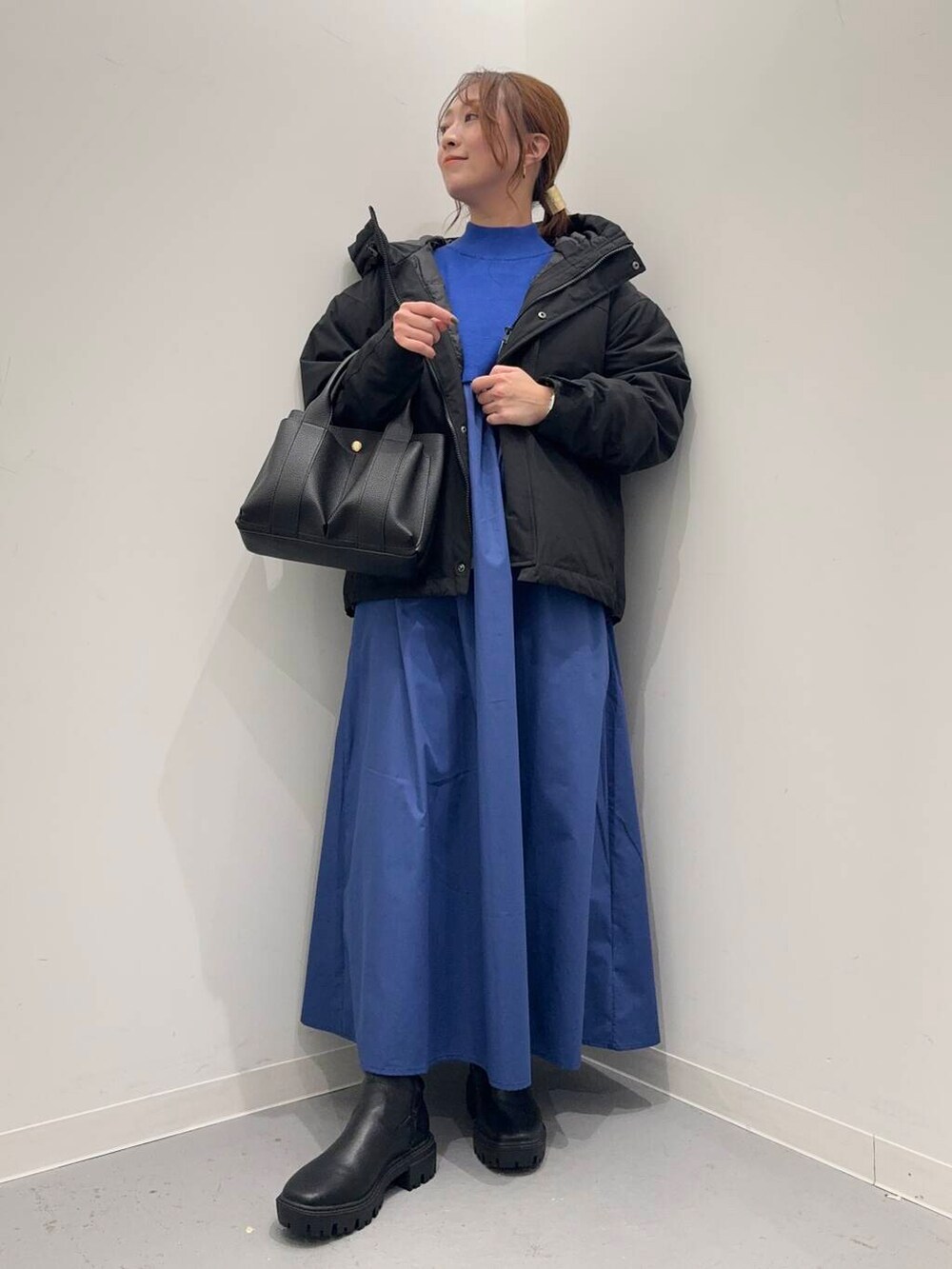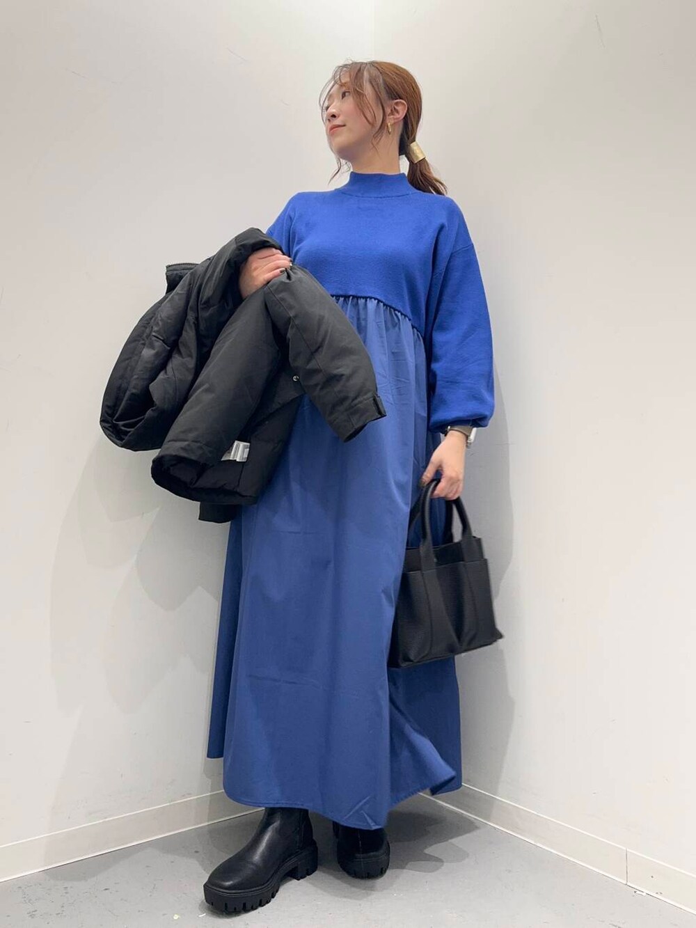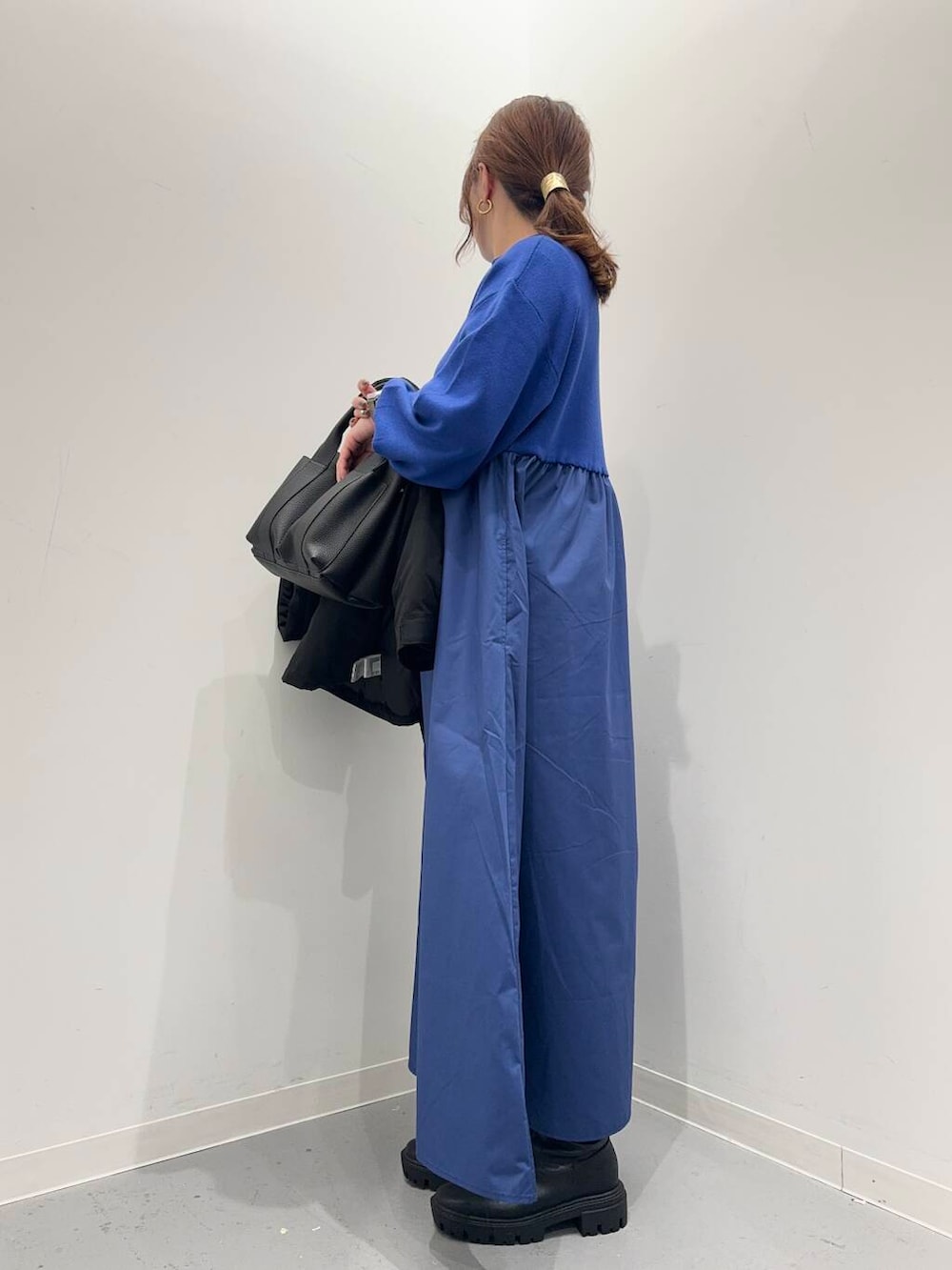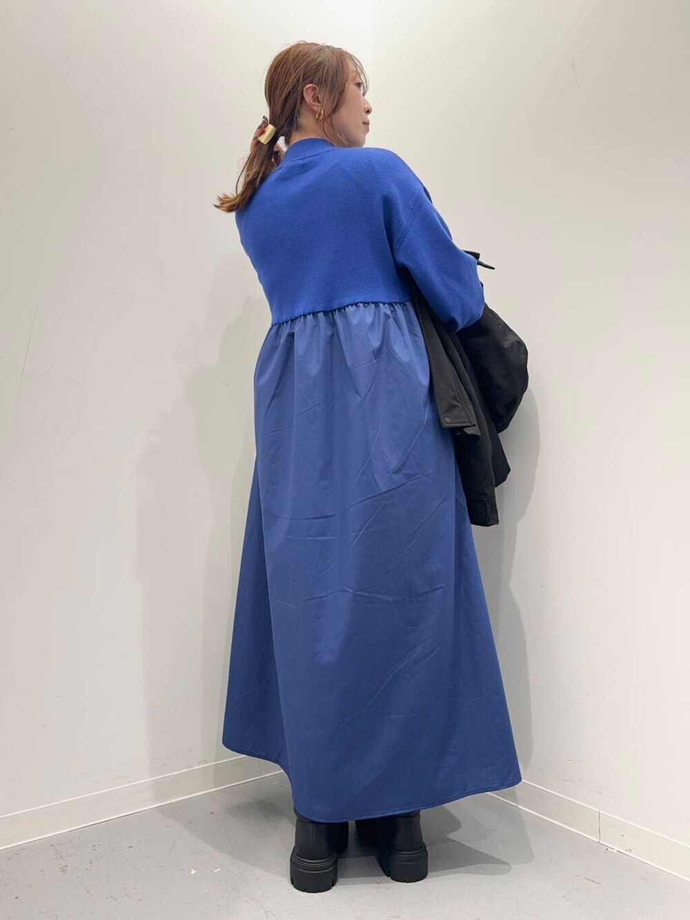ワンピースは異素材のドッキングデザインで、
