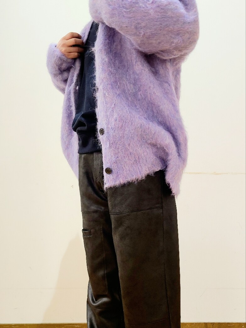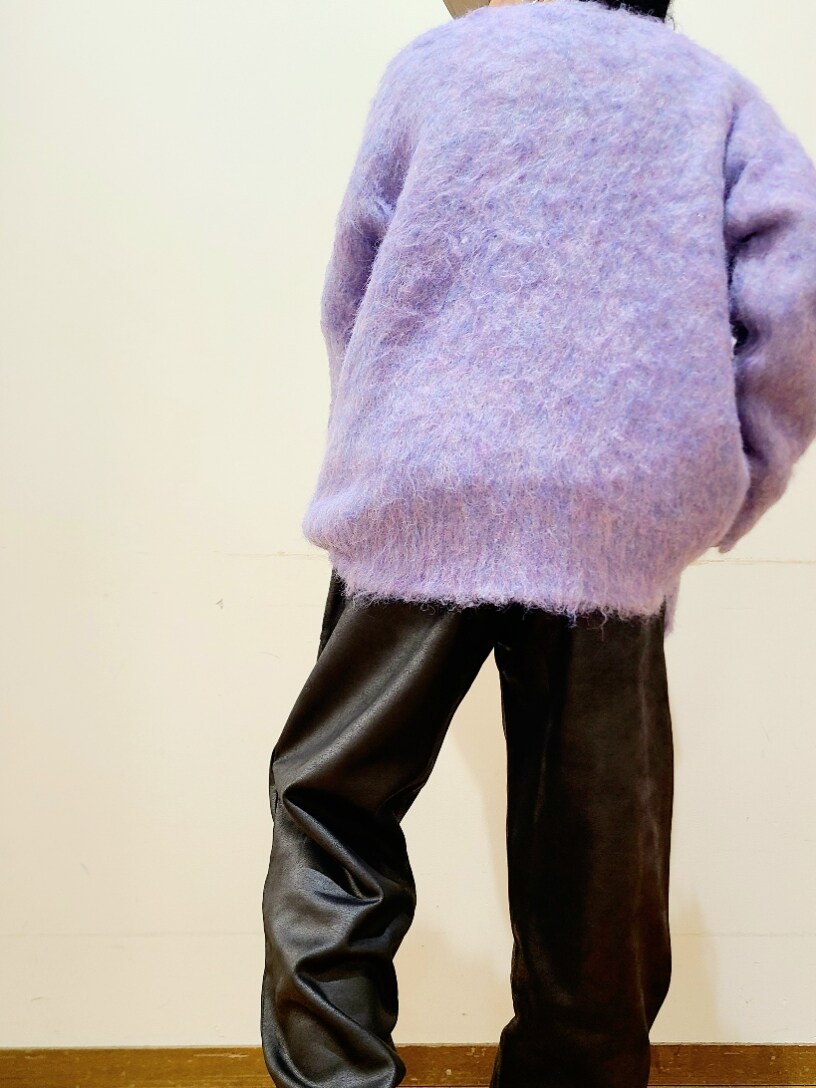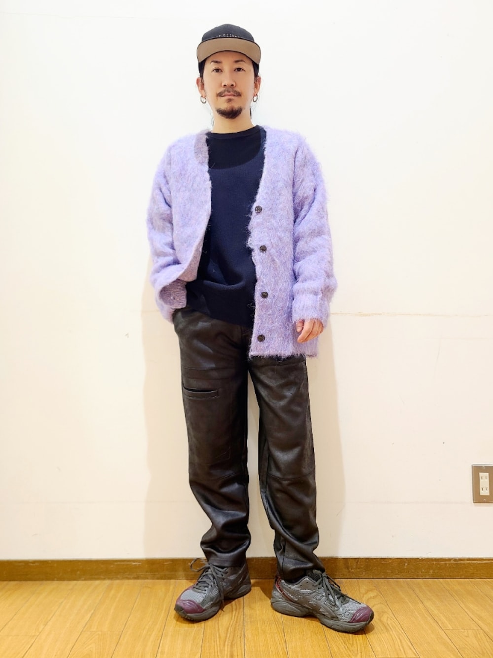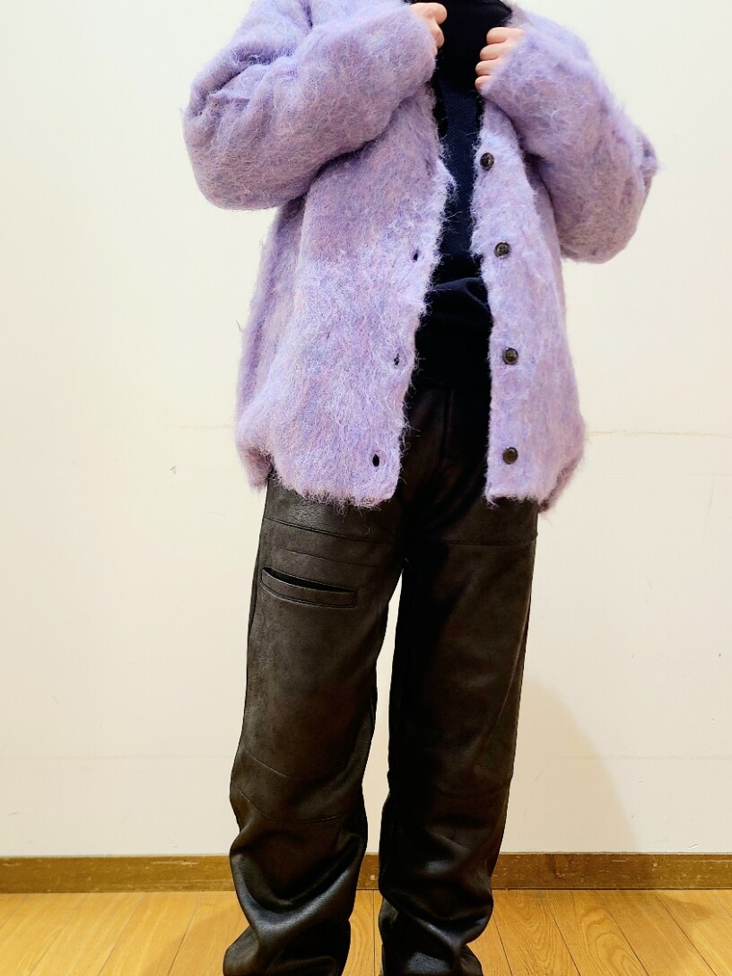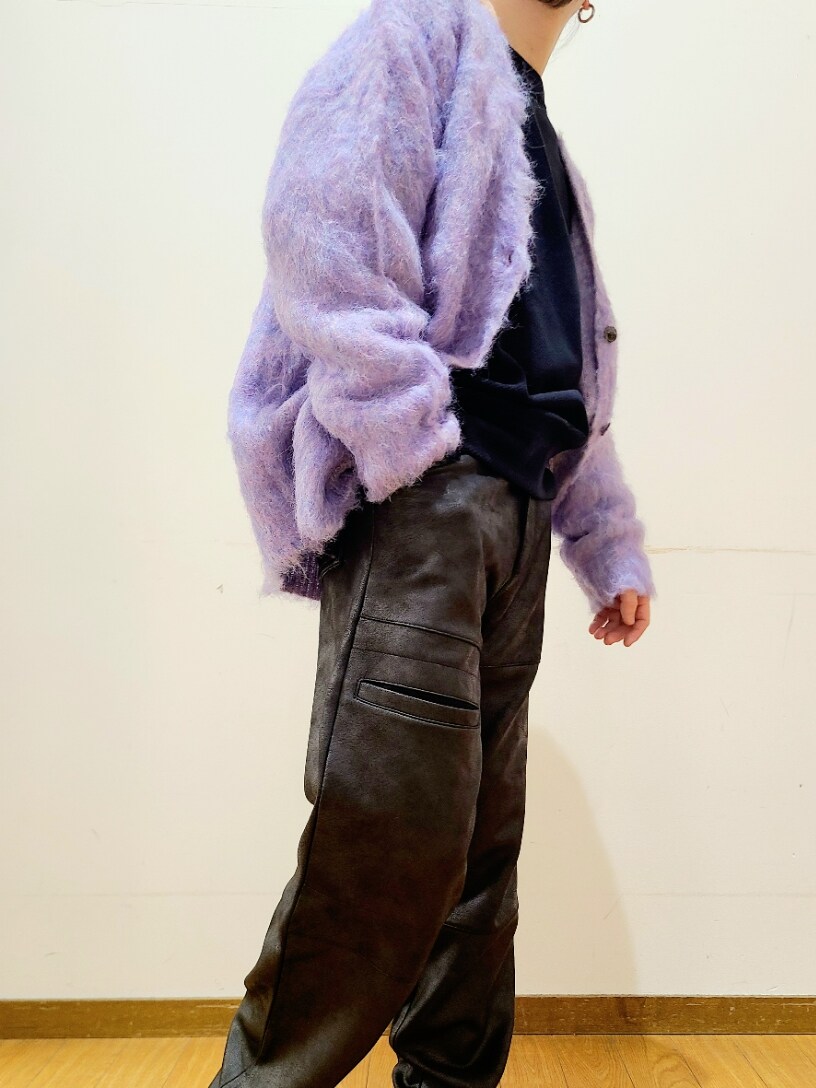 フェイクレザーパンツは一見強めの印象ですが、すっきりシルエットでどんなコーディネートにもマッチします。
