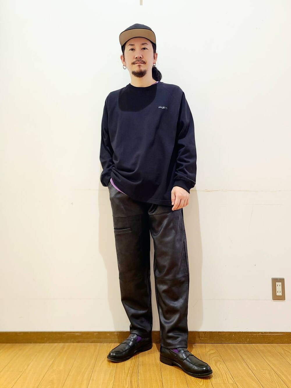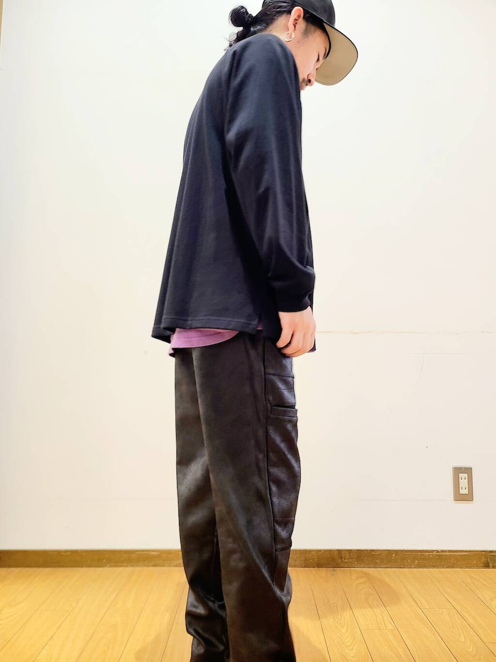 フェイクレザーパンツは一見強めの印象ですが、すっきりシルエットでどんなコーディネートにもマッチします。