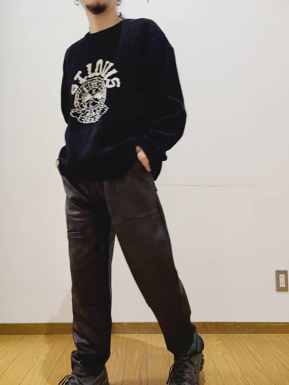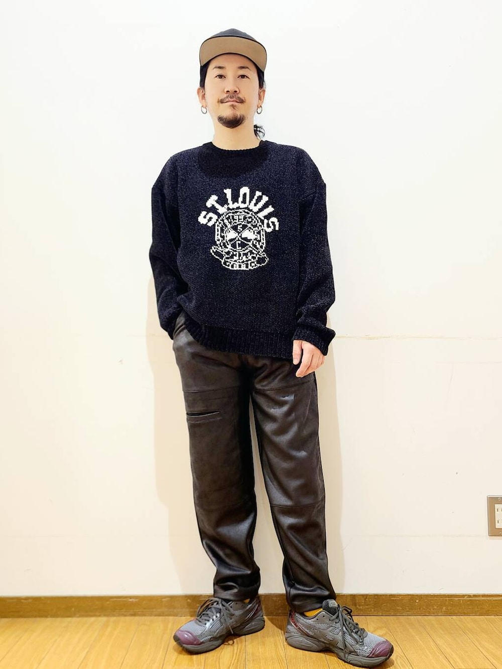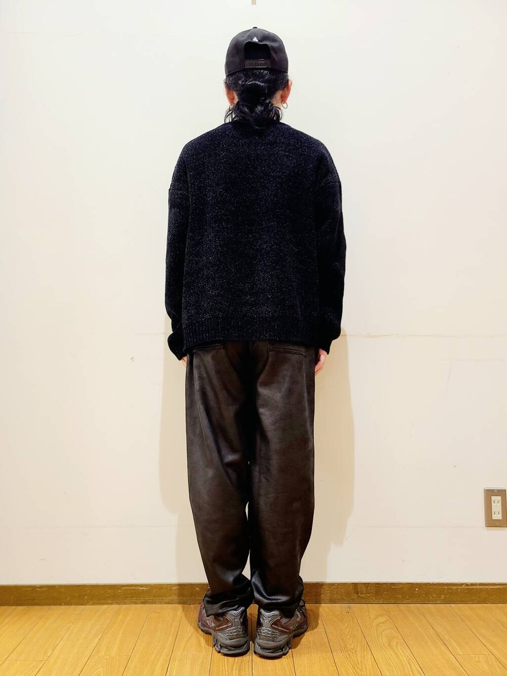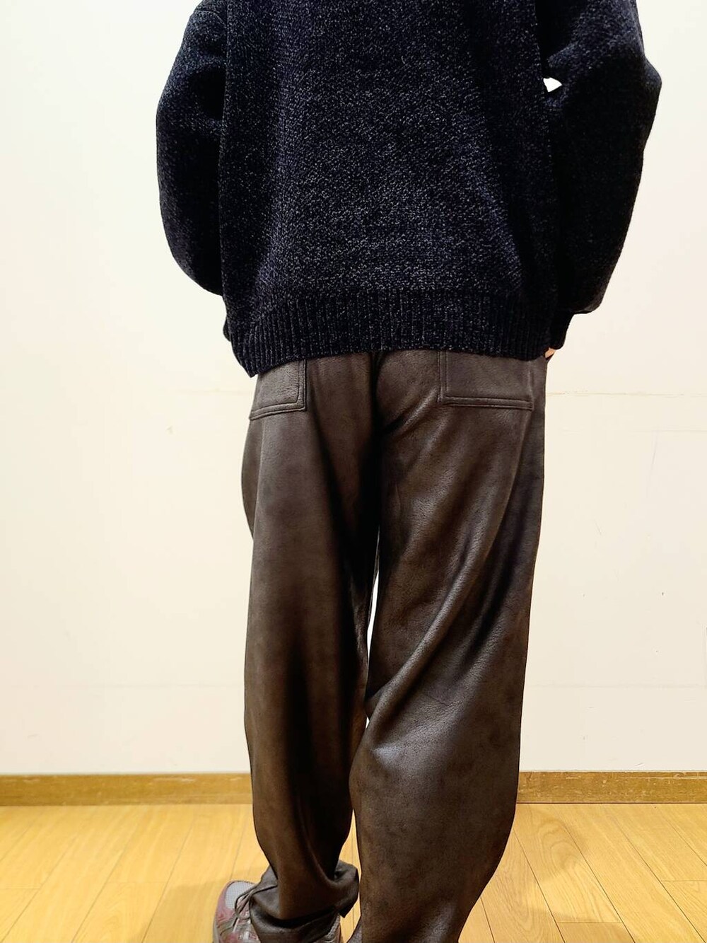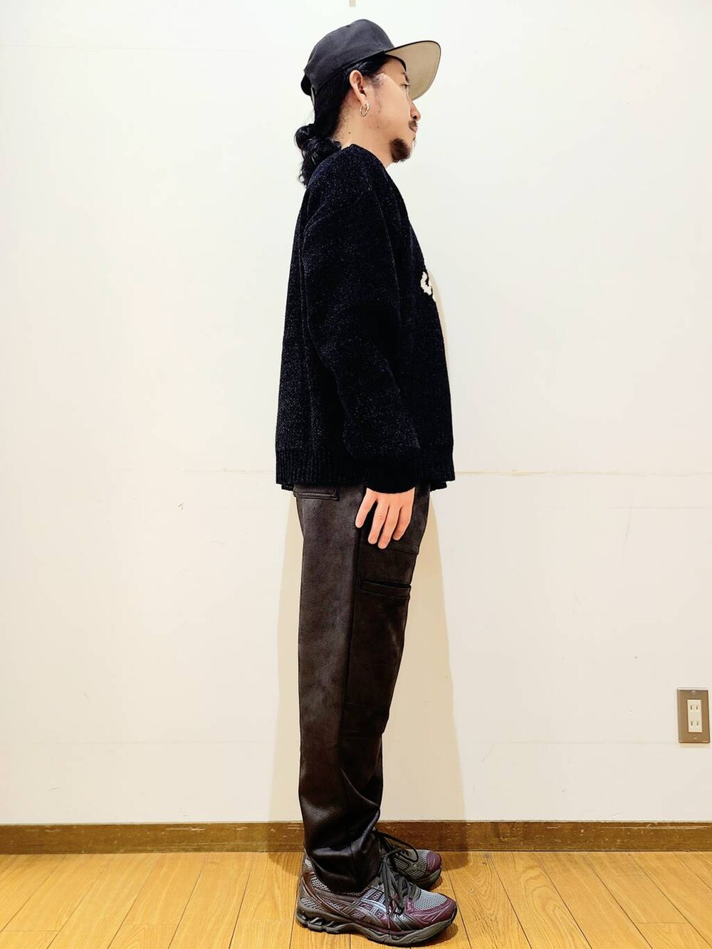 フェイクレザーパンツは一見強めの印象ですが、すっきりシルエットでどんなコーディネートにもマッチします。