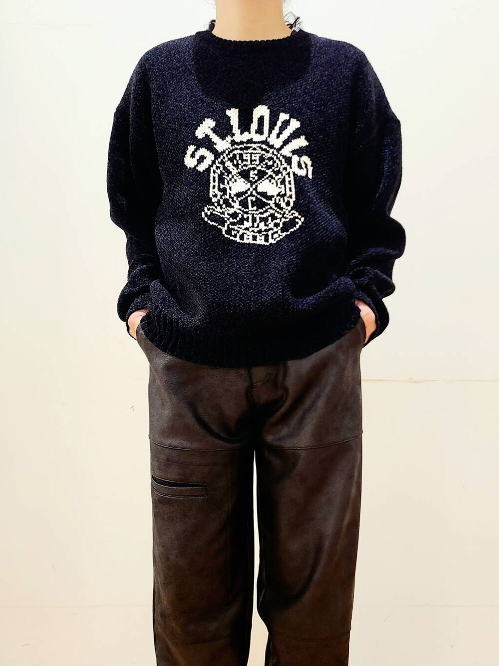 肌当たりが柔らかく、温かみのあるモール糸を使用したロゴクルーネックニット。