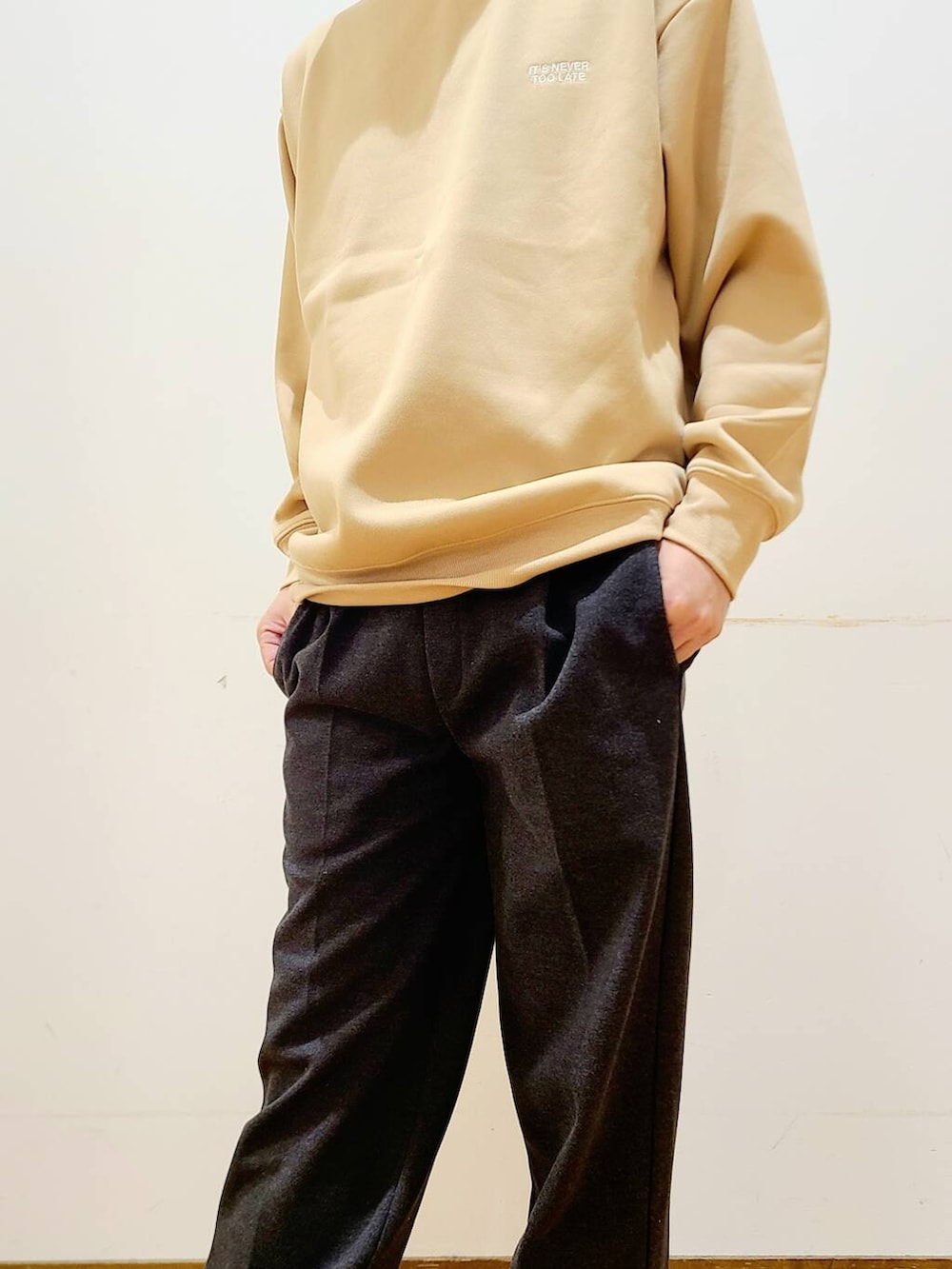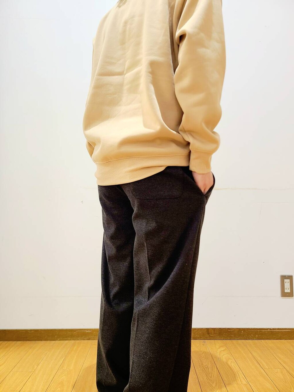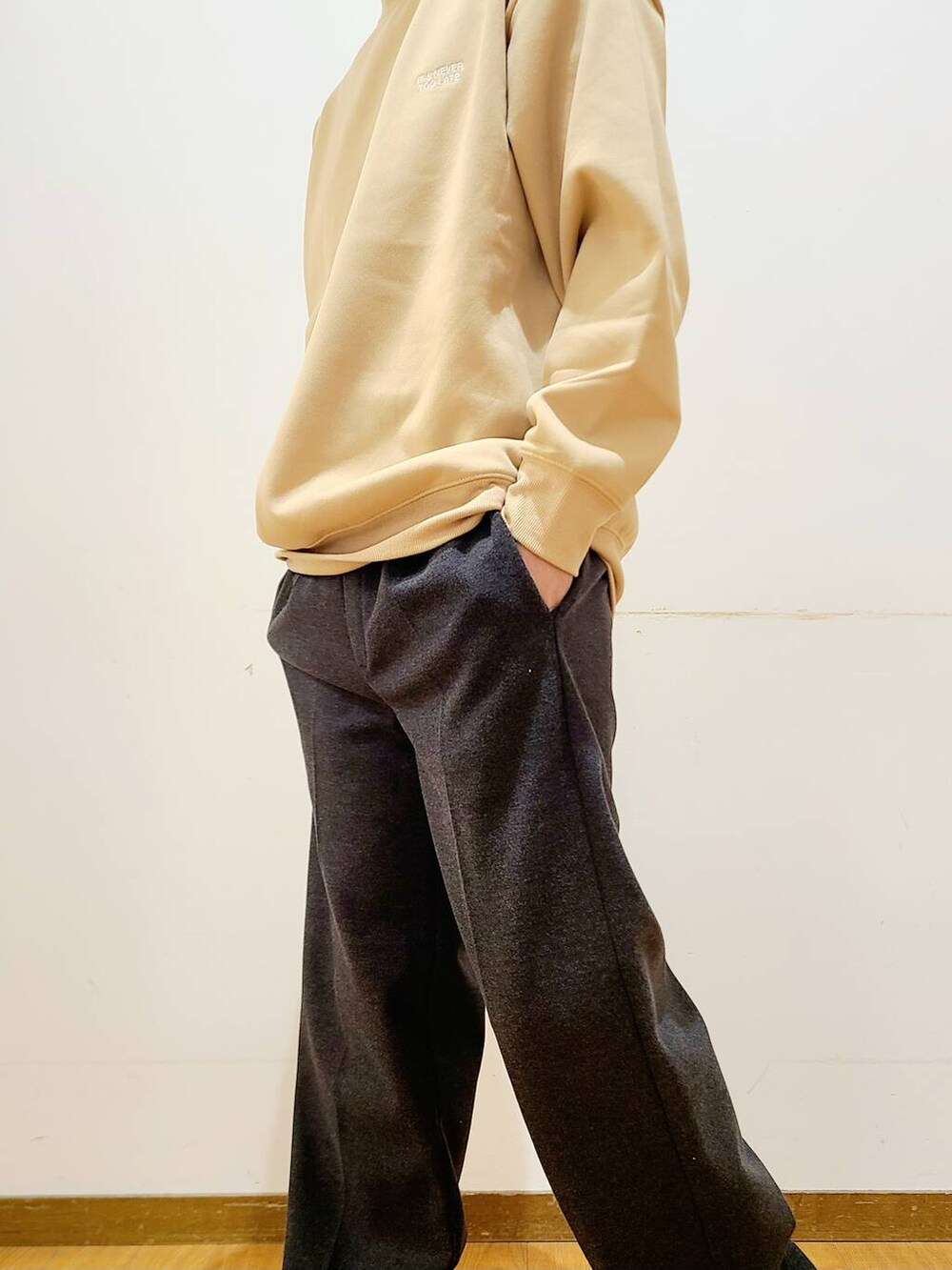 センタープレスを施し、やや細身のスルエットに仕上げることで、気兼ねなく履けるきれい見えボトムスに仕上げっています。