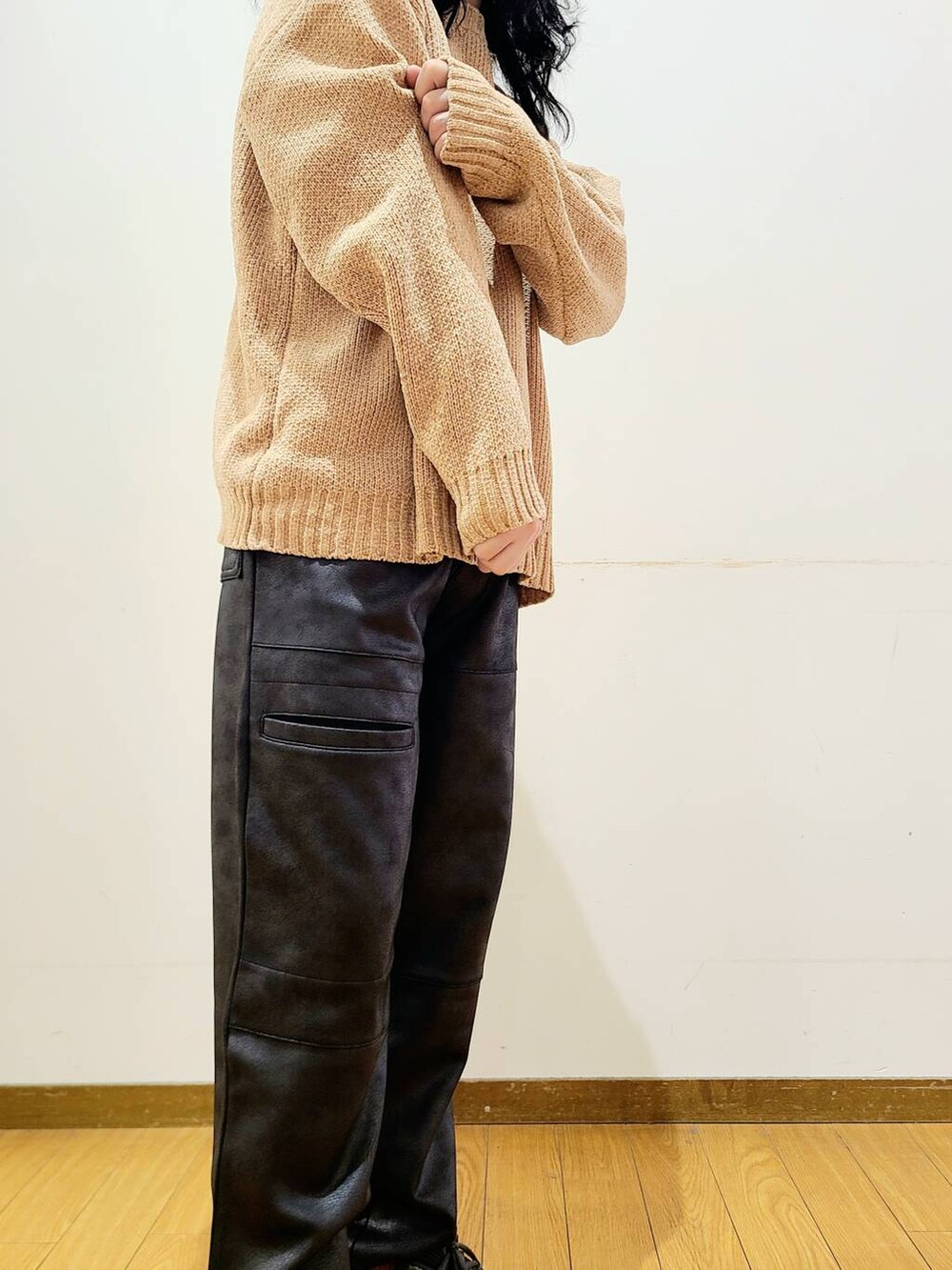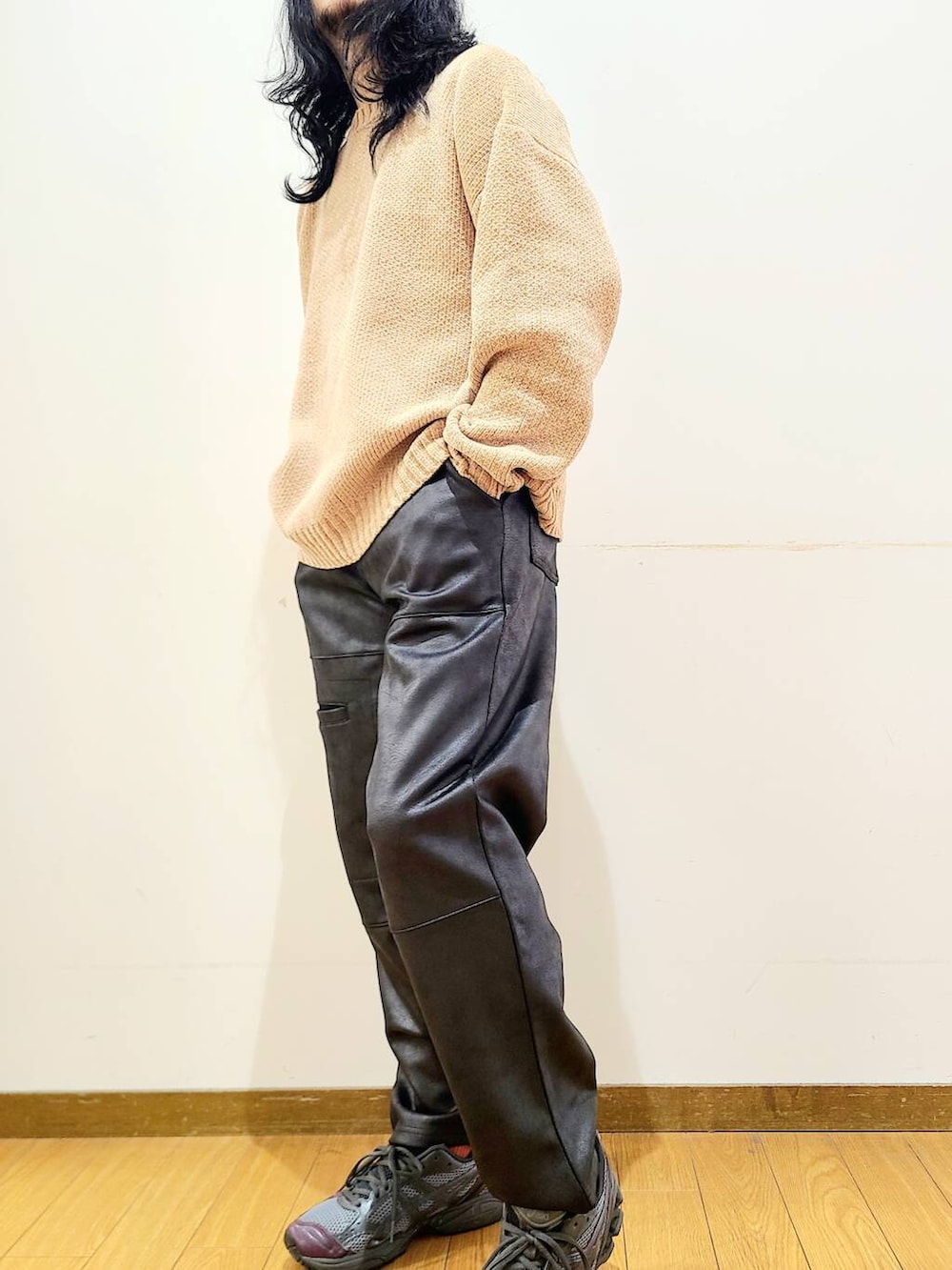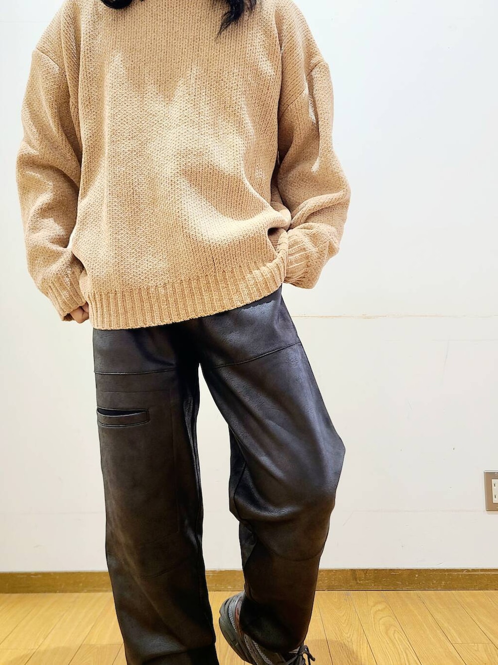 フェイクレザーパンツは一見強めの印象ですが、すっきりシルエットでどんなコーディネートにもマッチします。