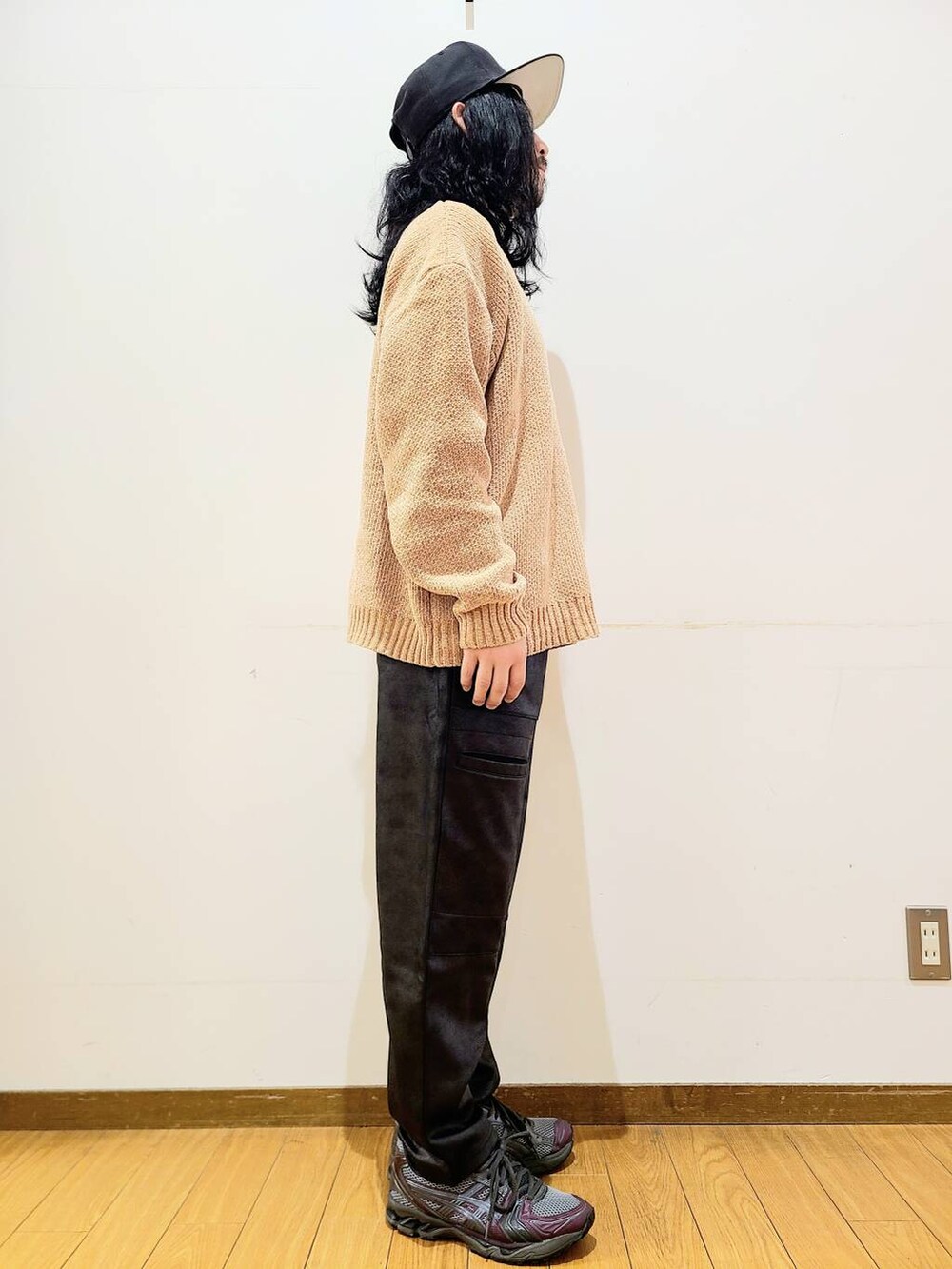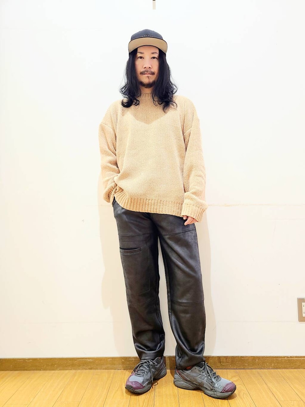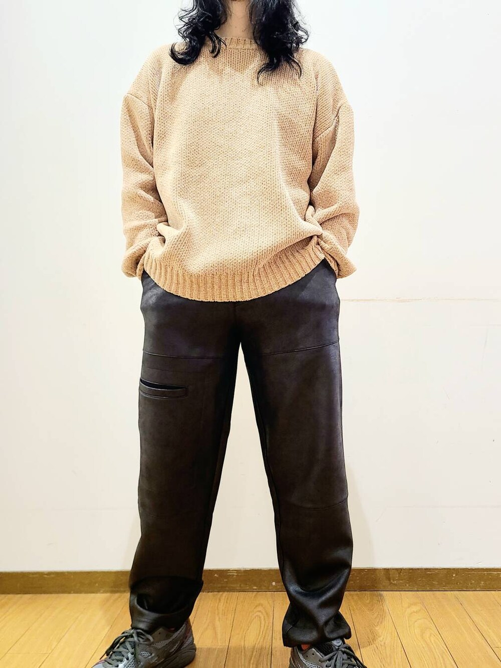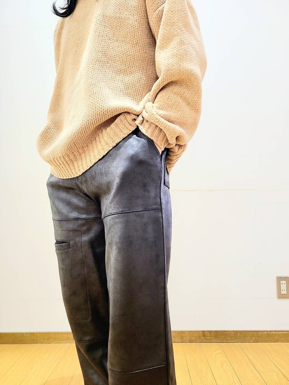フェイクレザーパンツは一見強めの印象ですが、すっきりシルエットでどんなコーディネートにもマッチします。