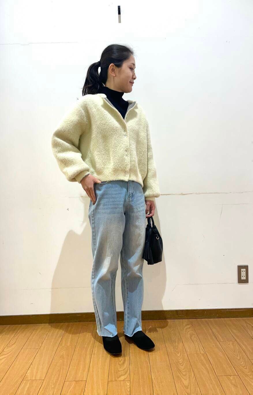 表面がシャギーのふわふわで可愛らしい+裏地のニット素材が違う色になっているのがとてもオシャレになっています♪
