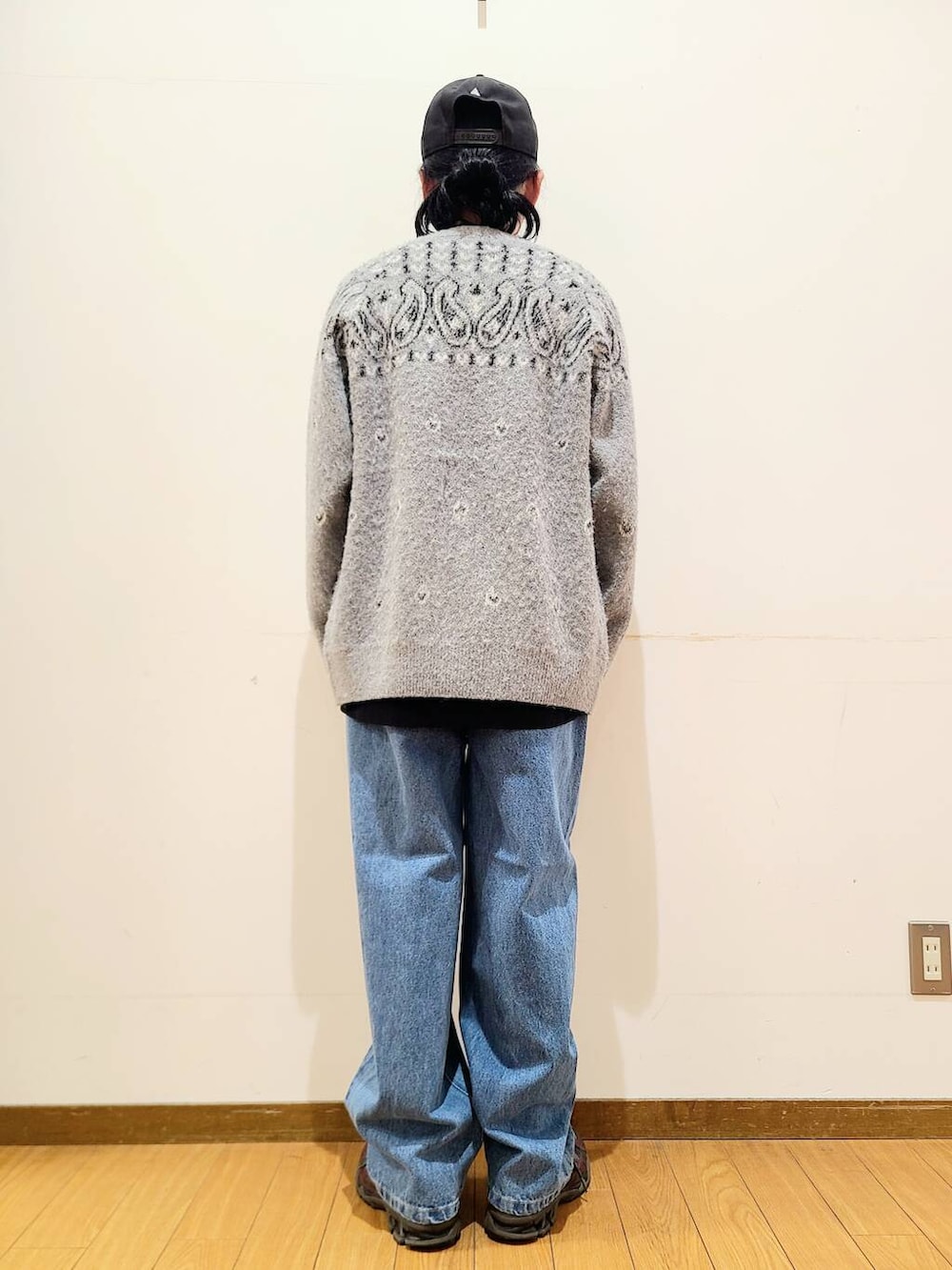 ペイズリー柄のクルーネックカーディガン。