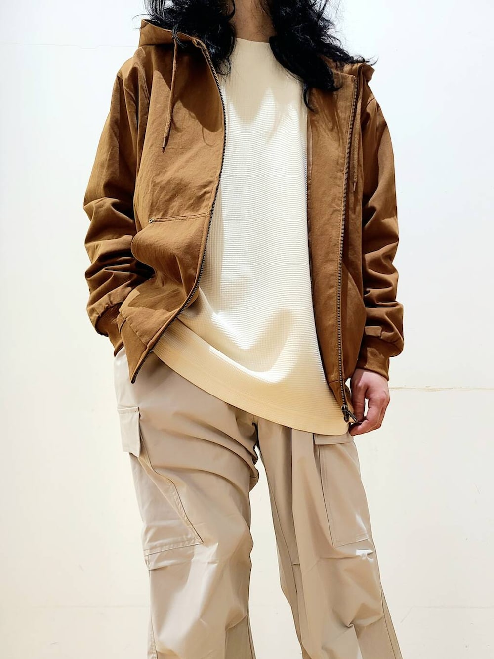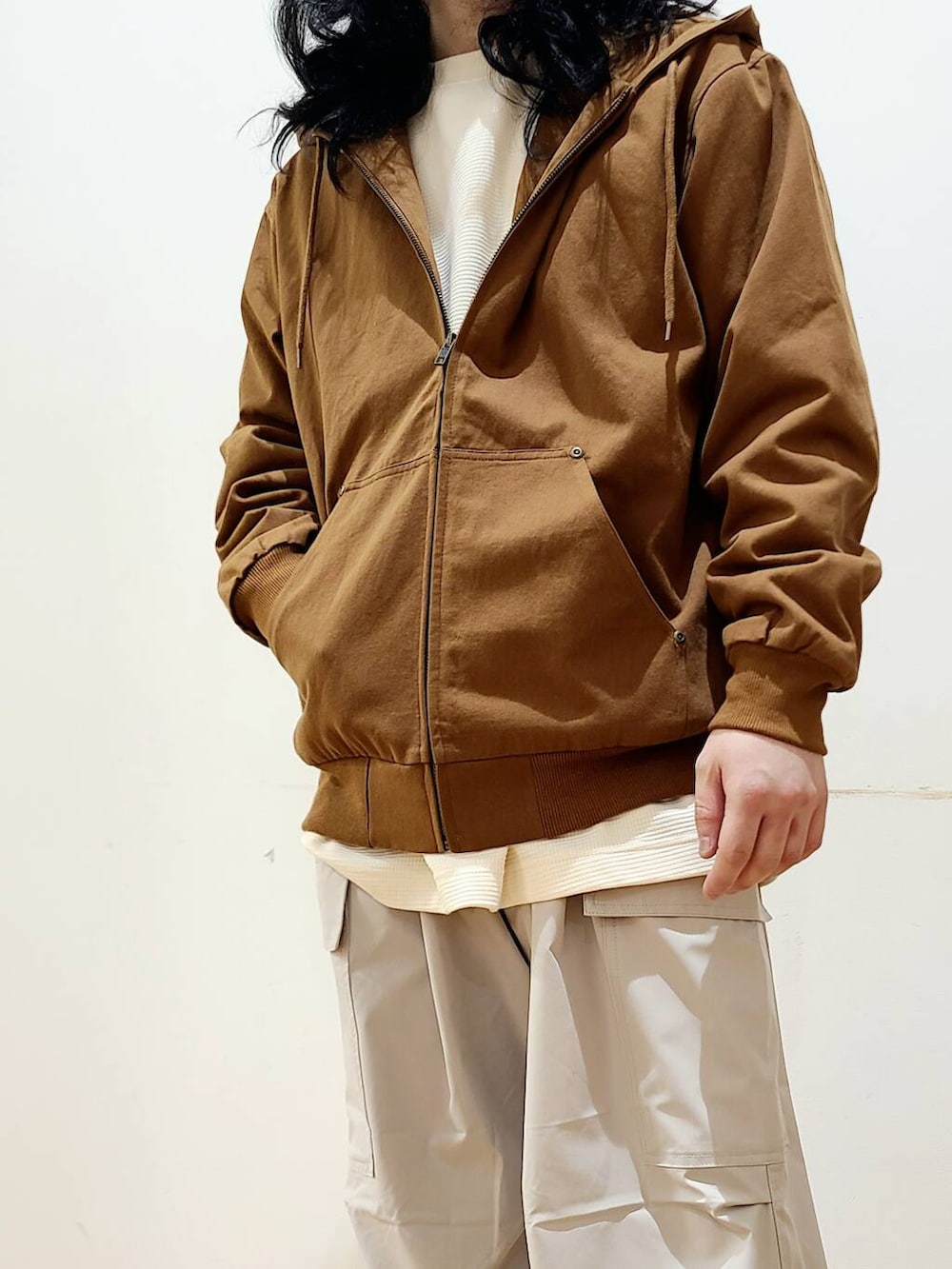 コットン素材が柔らかな着心地のジップアップフードジャケット。