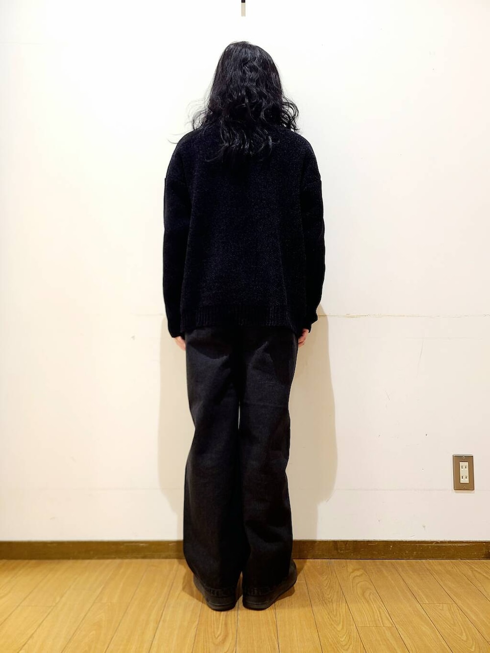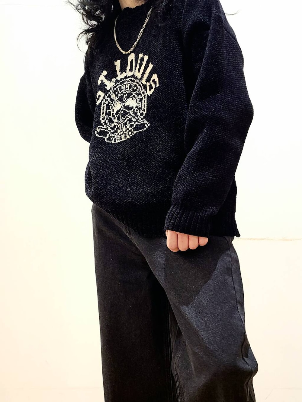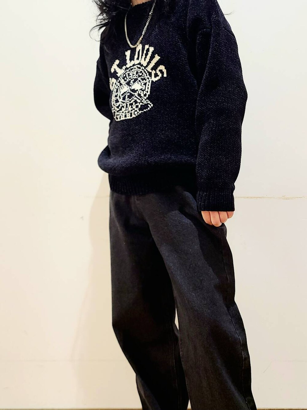肌当たりが柔らかく、温かみのあるモール糸を使用したロゴクルーネックニット。