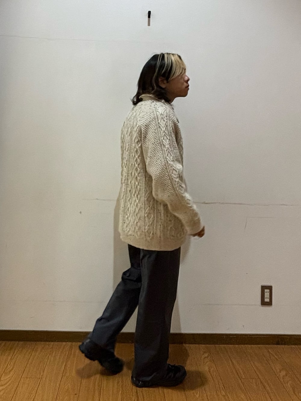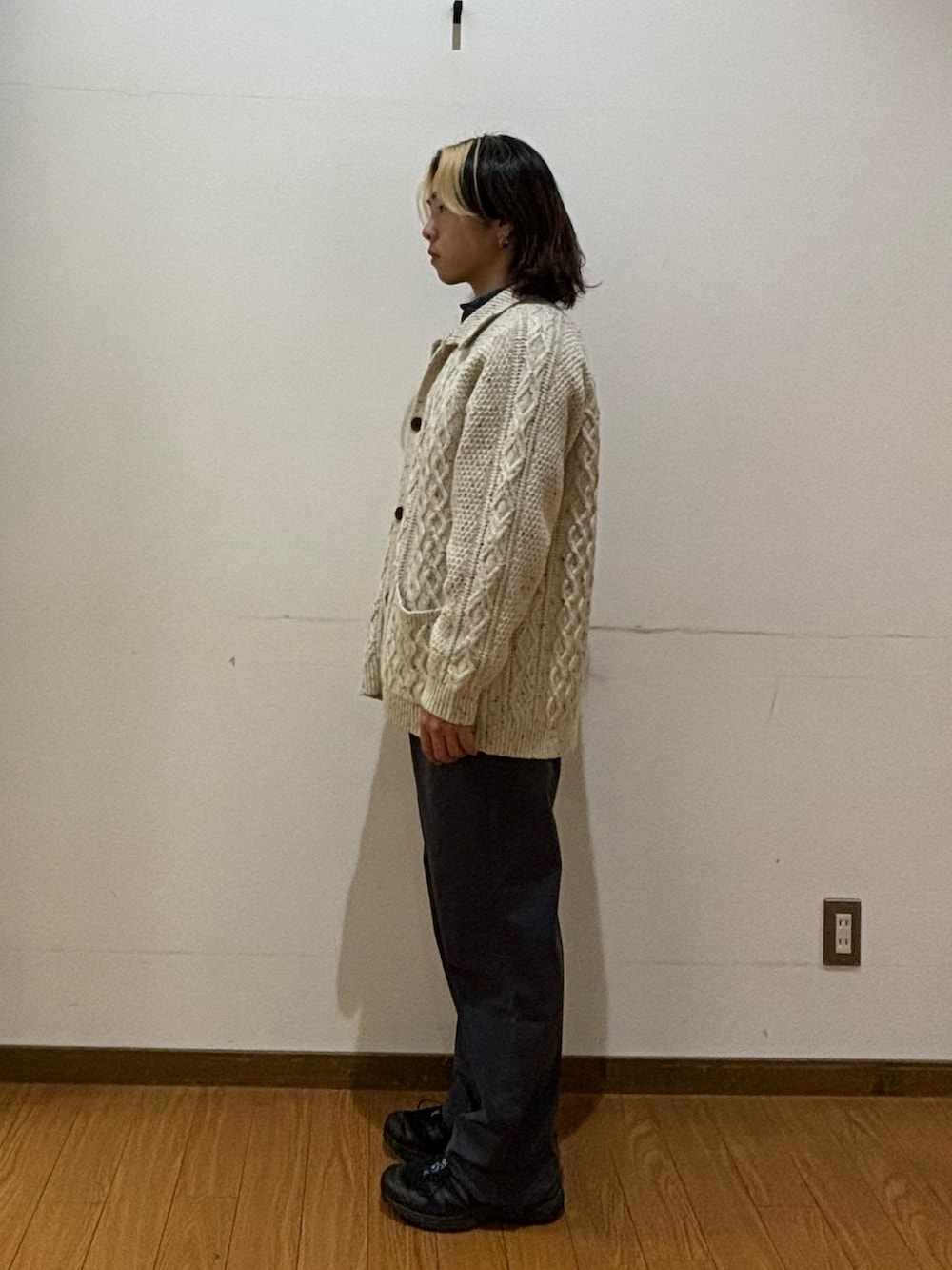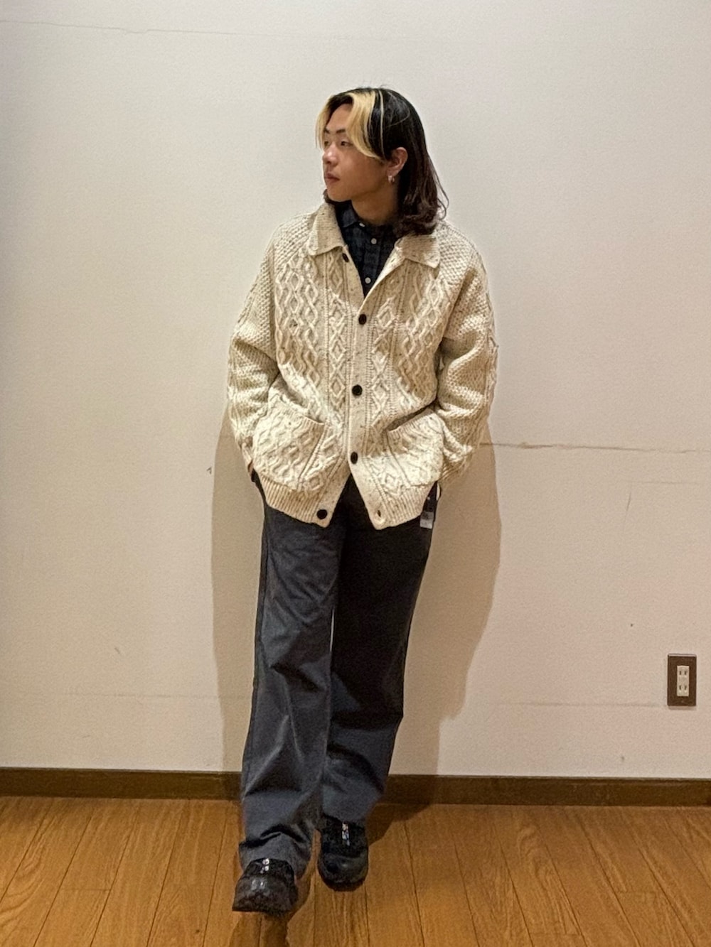 トップスはウール混で生地が厚めのカーディガンです!ゆとりがあるサイズ感なので幅広い年齢の方が着やすいと思います!