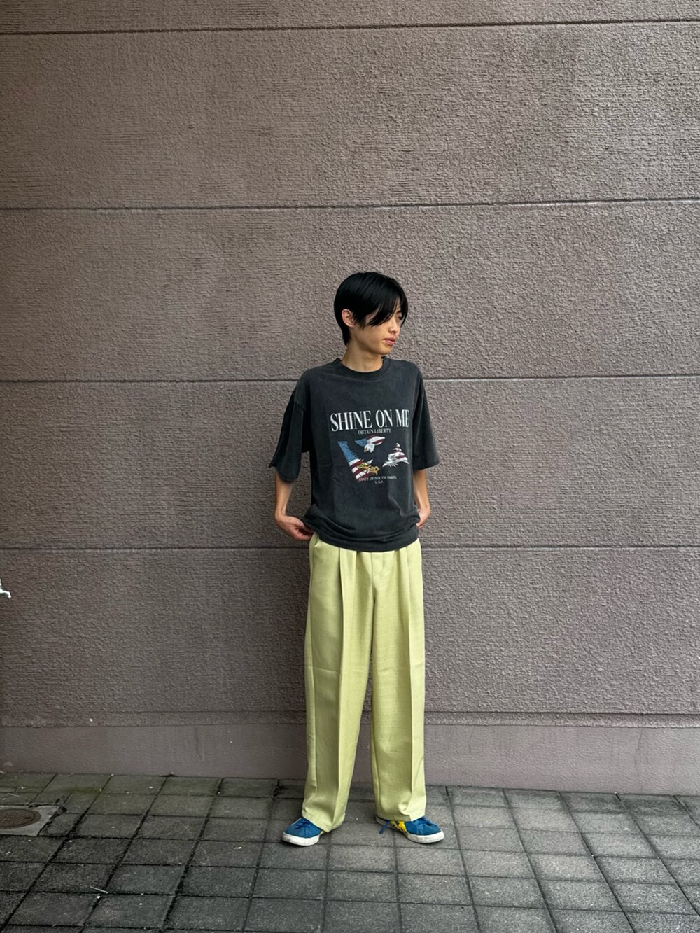 黄緑のスラックスなのでトップスはシンプルにTシャツを合わせました!黒と黄緑の相性はいいと思います!