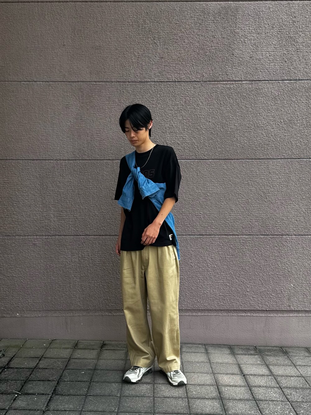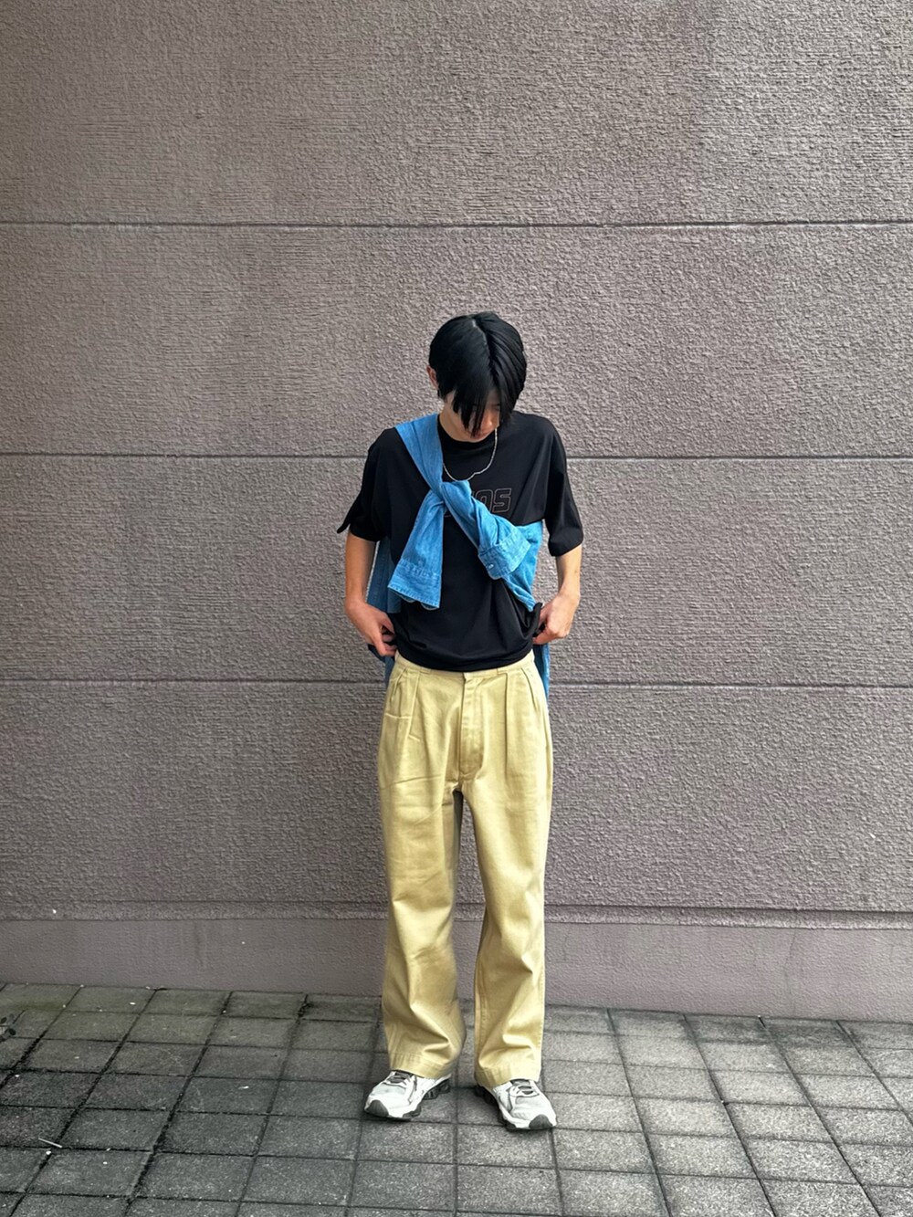 今回のコーディネートはチノパンに黒Tを着て肩からデニムシャツを肩に巻いたコーデです!