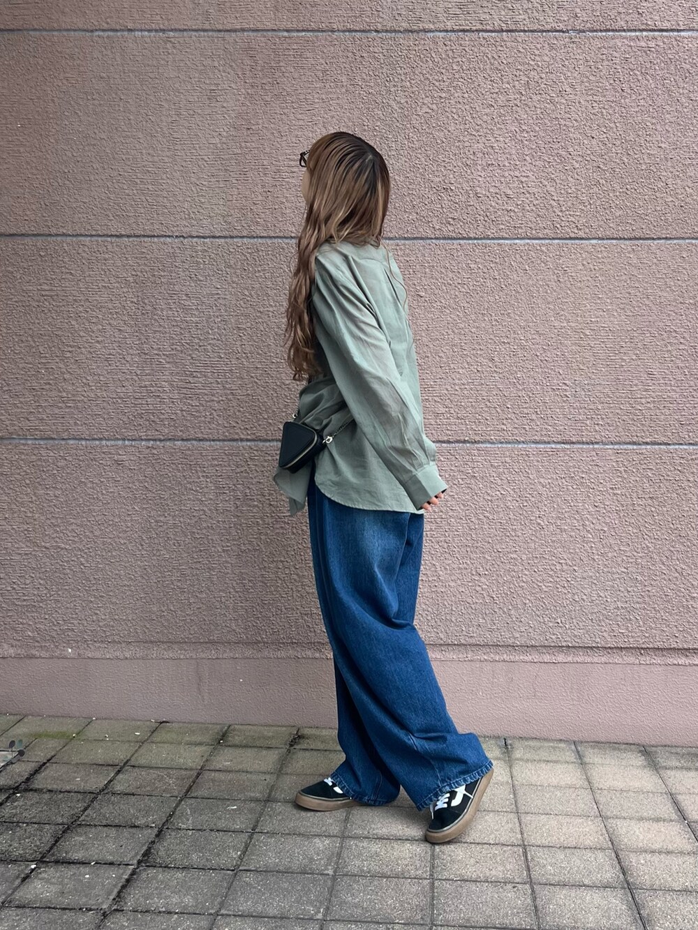 トップスはリネンビックシャツで大きめになっているのでゆったりと着ることが出来ます!カーキの色味かとても可愛いアイテムです!