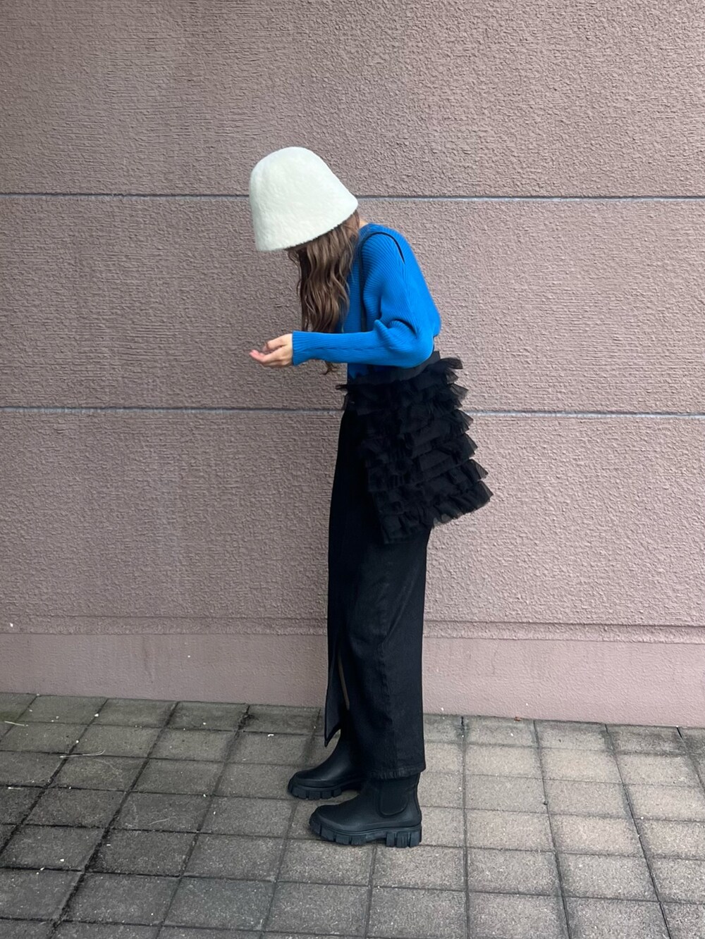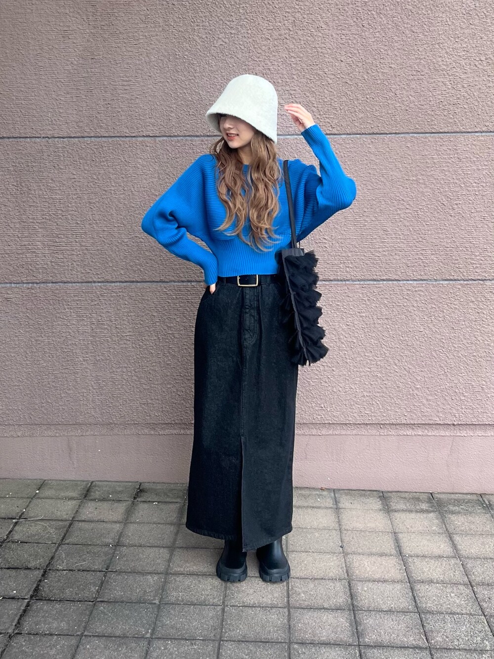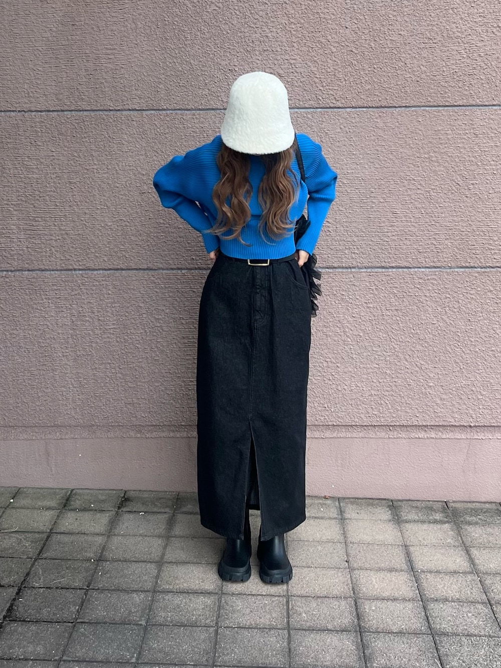 ボトムスはデニムスカートで前にスリットが入っている可愛いアイテムです!タイトスカートなのでスタイルが良く見えて着回ししやすいのでおすすめです!♡
