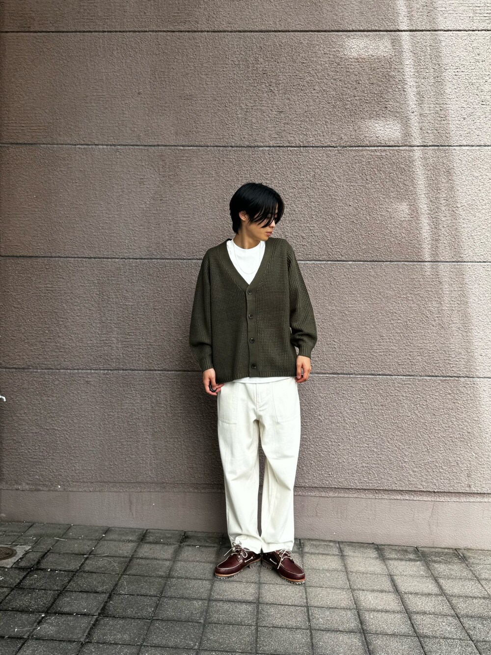 今回のコーディネートはシンプルなカーディガンにデニム生地のベイカーパンツを合わせたコーデです!カーディガンは秋は1枚でオシャレに着れて、冬はインナーとしても活躍します!