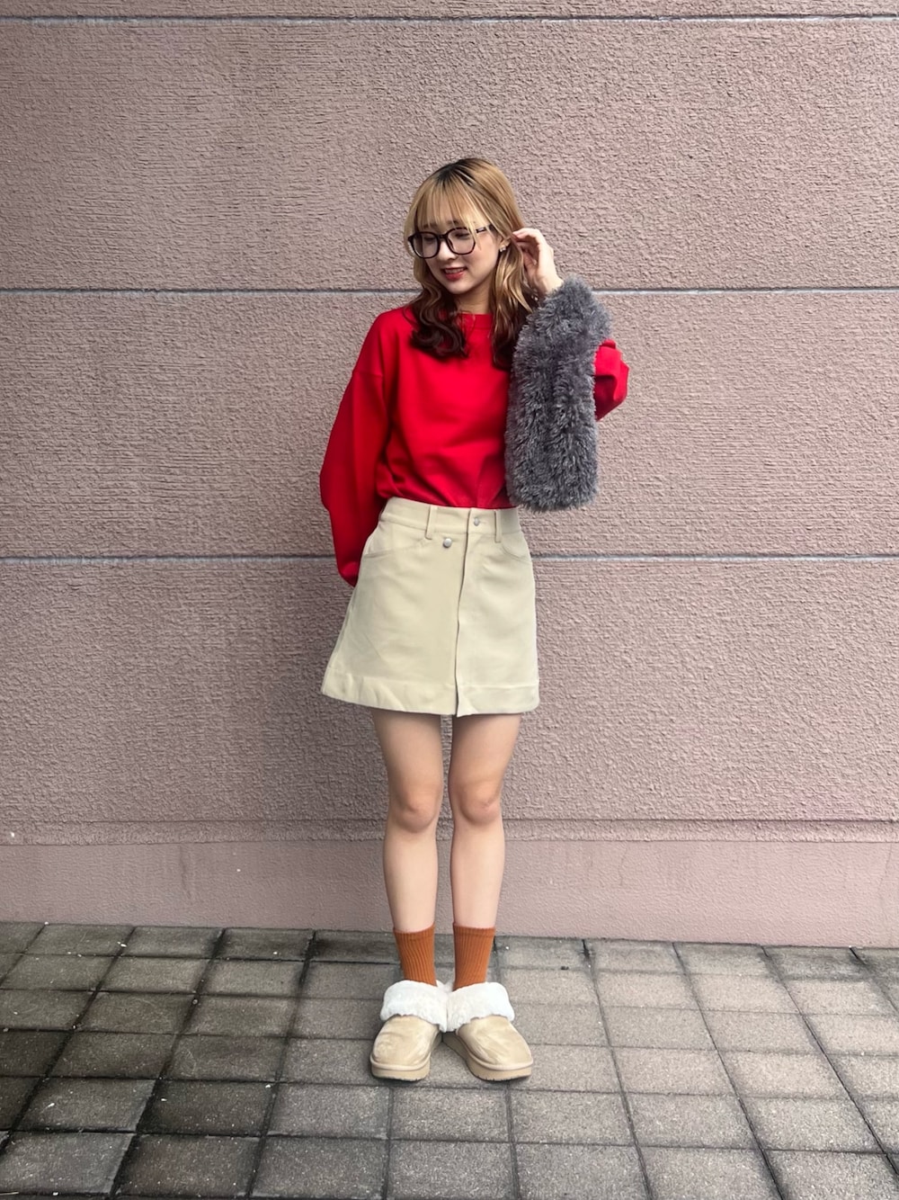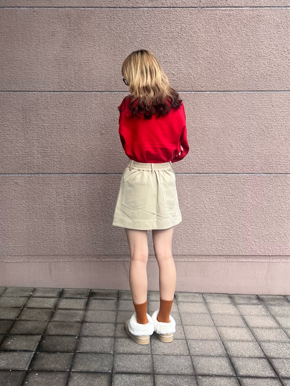 トップスは赤ニットでとても肌触りが良くて着心地が良いアイテムになっています!着回しもしやすく色味がとても可愛いです!