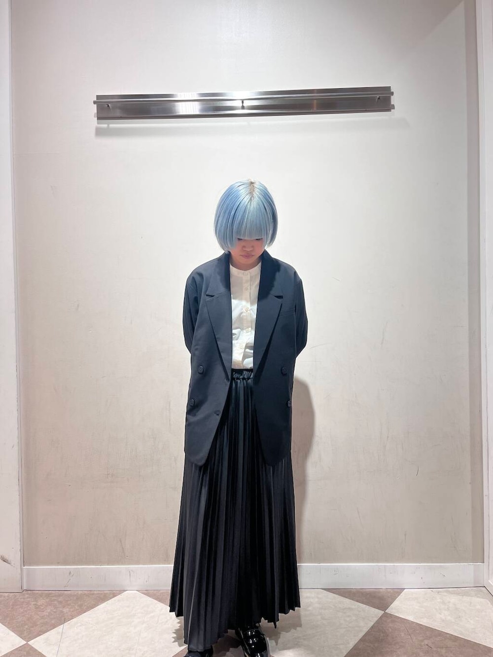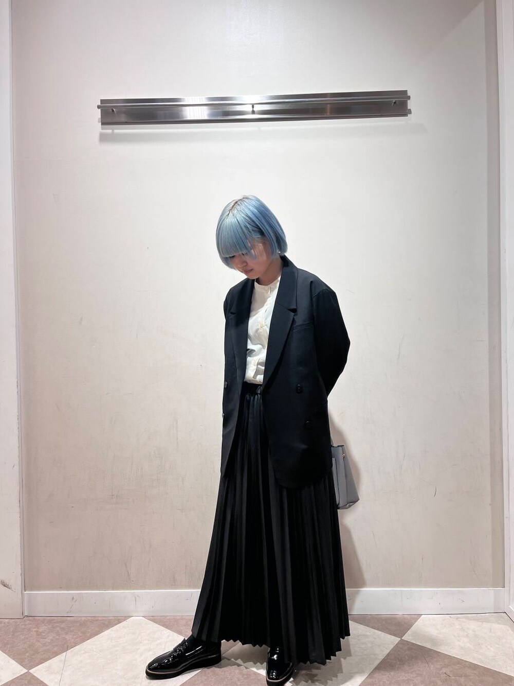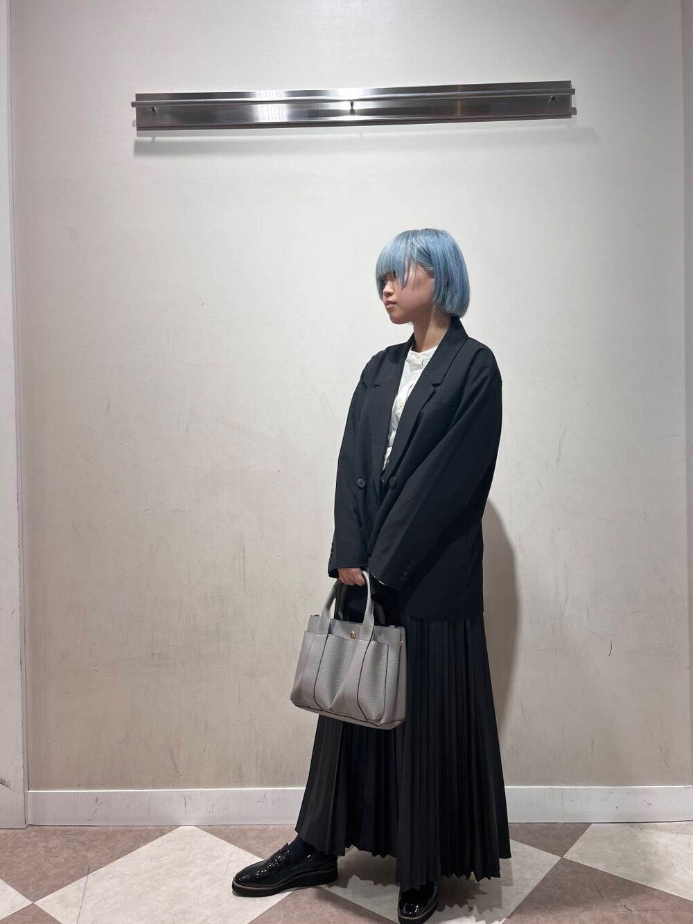 オフィス感が加わり、ボトムスをフェイクレザーのプリーツスカートをもってくることによって