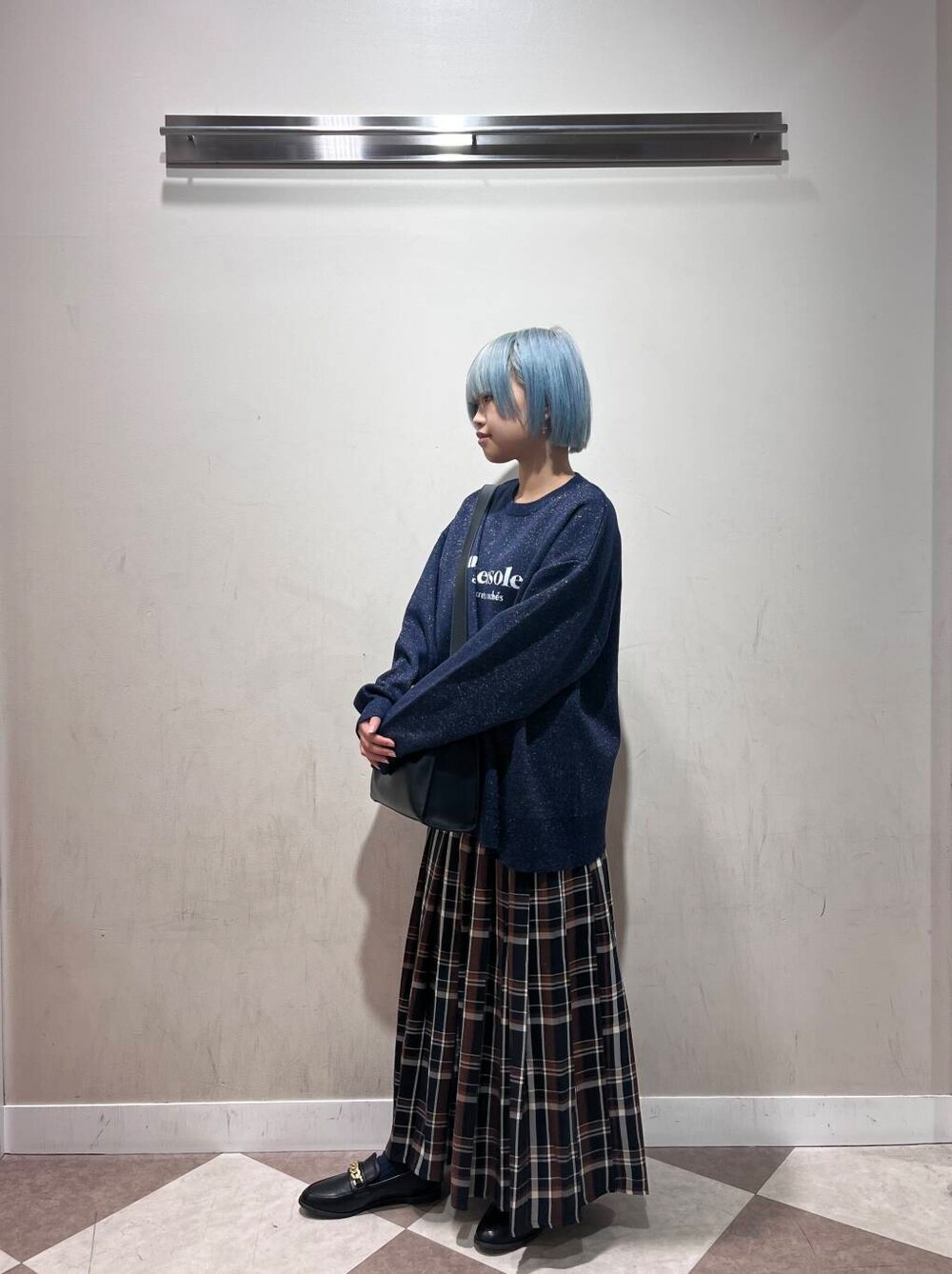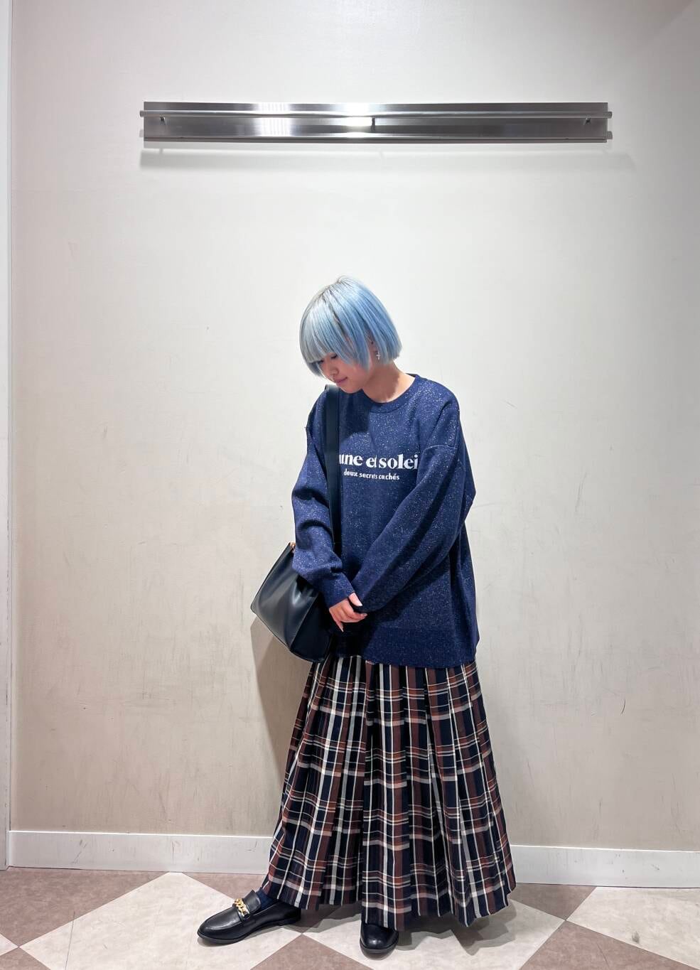 プリーツの青とニットのネイビーであわせることで統一感も◎