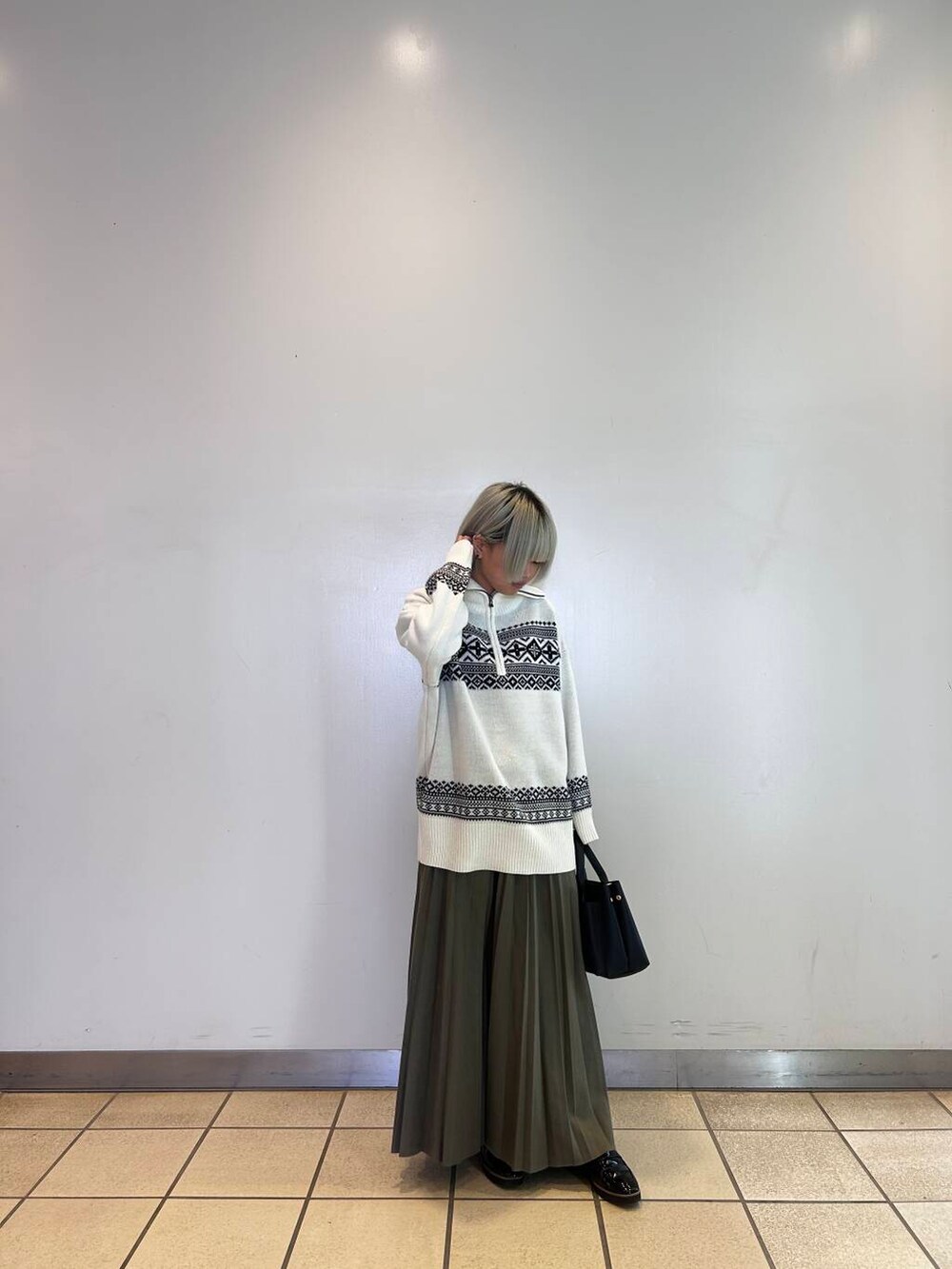 カーキのプリーツスカートを差し色に使用しました!こちらも重みがあまりなくおすすめです!