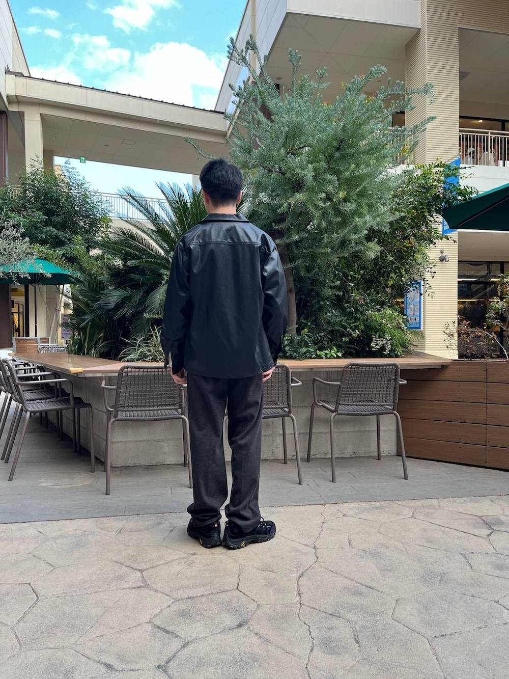 レザー素材のシャツジャケットを主役にした、シンプルコーデ。