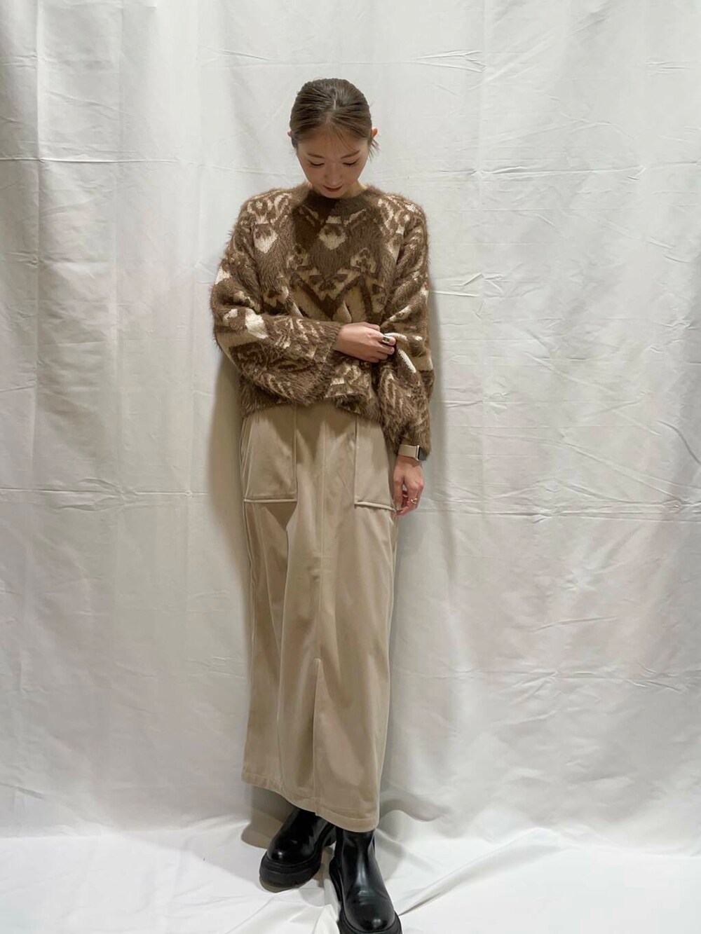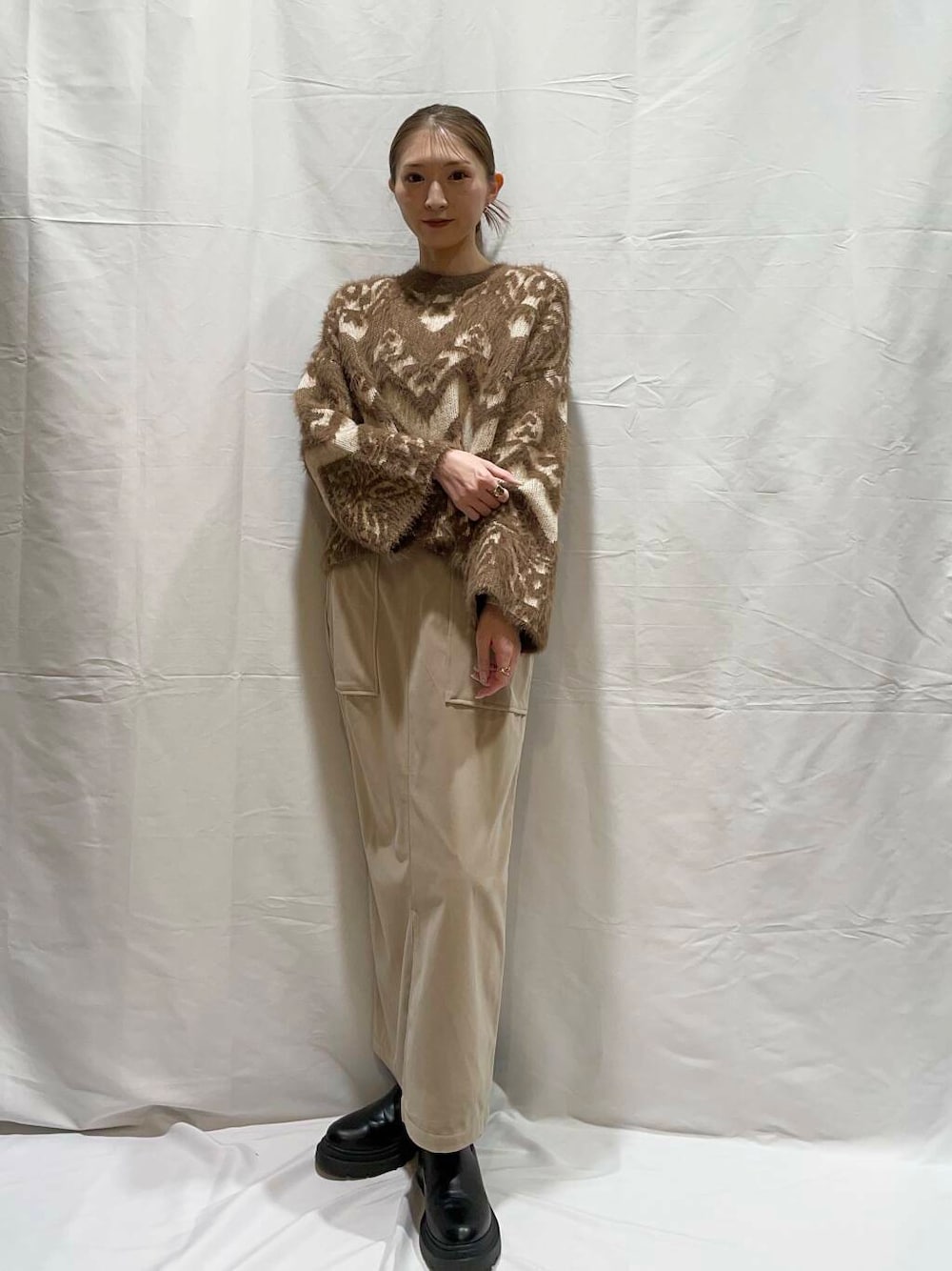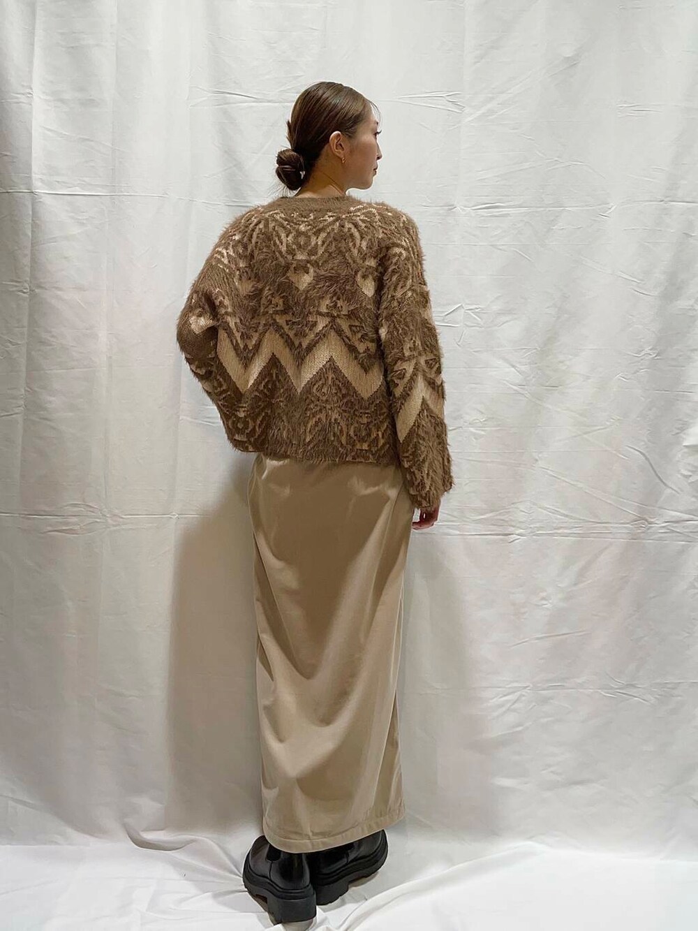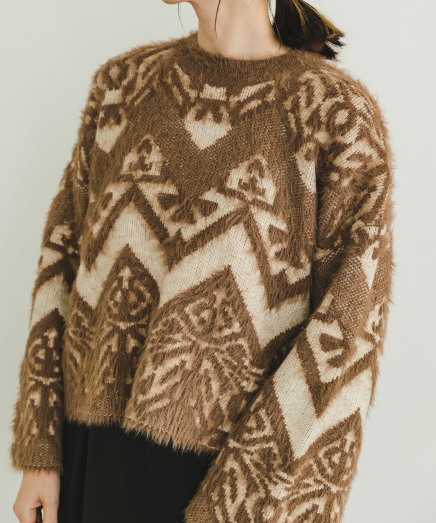 ふわふわとした毛足が特徴のフェザー素材で仕立てたシーズンムード高まるニット。パッと目を引く大胆なジャガード柄が、スタイリングを一気に華やかにしてくれます。大人っぽさ漂うコンパクト丈がスタイルアップ効果も発揮してくれますよ♪