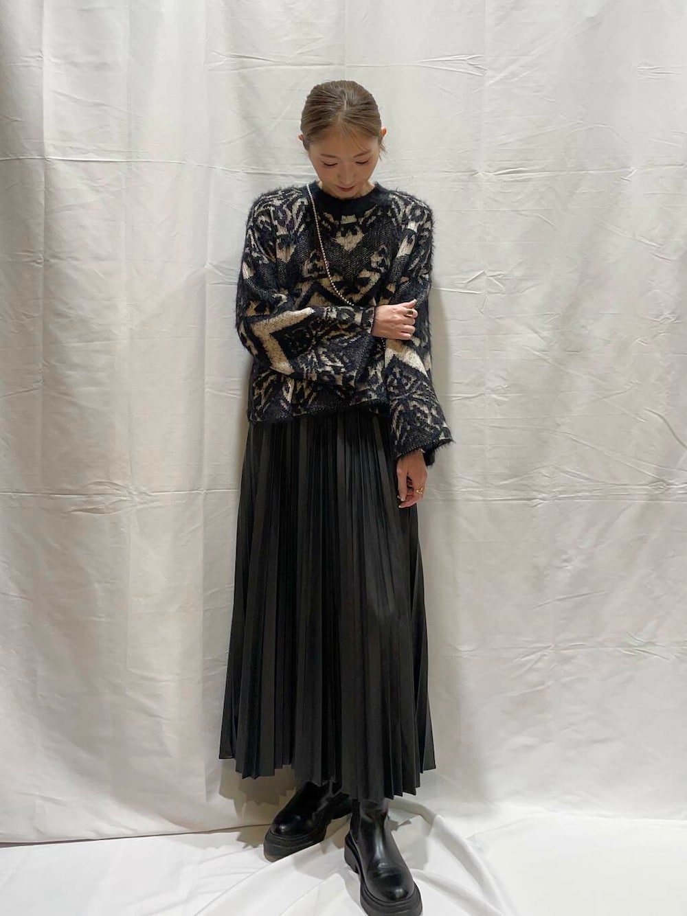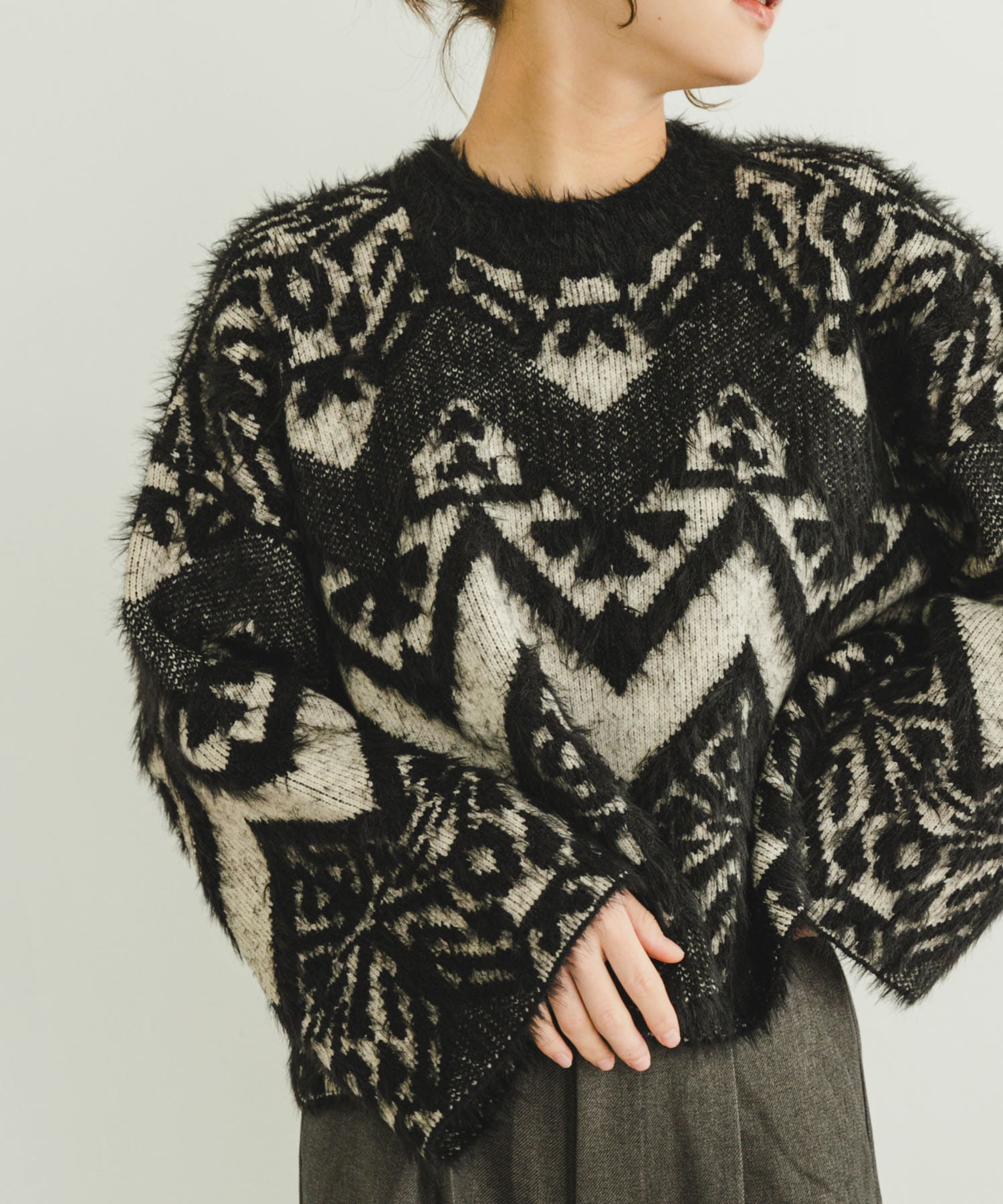 ふわふわとした毛足が特徴のフェザー素材で仕立てたシーズンムード高まるニット。パッと目を引く大胆なジャガード柄が、スタイリングを一気に華やかにしてくれます。大人っぽさ漂うコンパクト丈がスタイルアップ効果も発揮してくれますよ♪