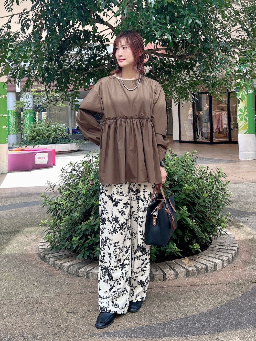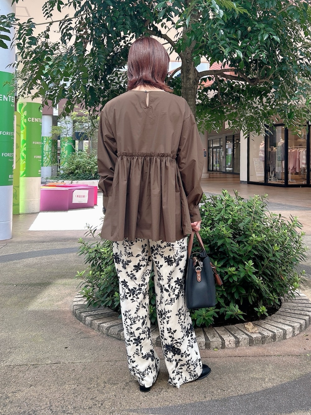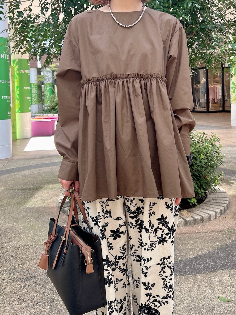 ✔︎ ふんわりシルエットが可愛いウエストギャザーデザイン。落ち着いたブラウンカラーで、甘さを抑えた大人な印象に。