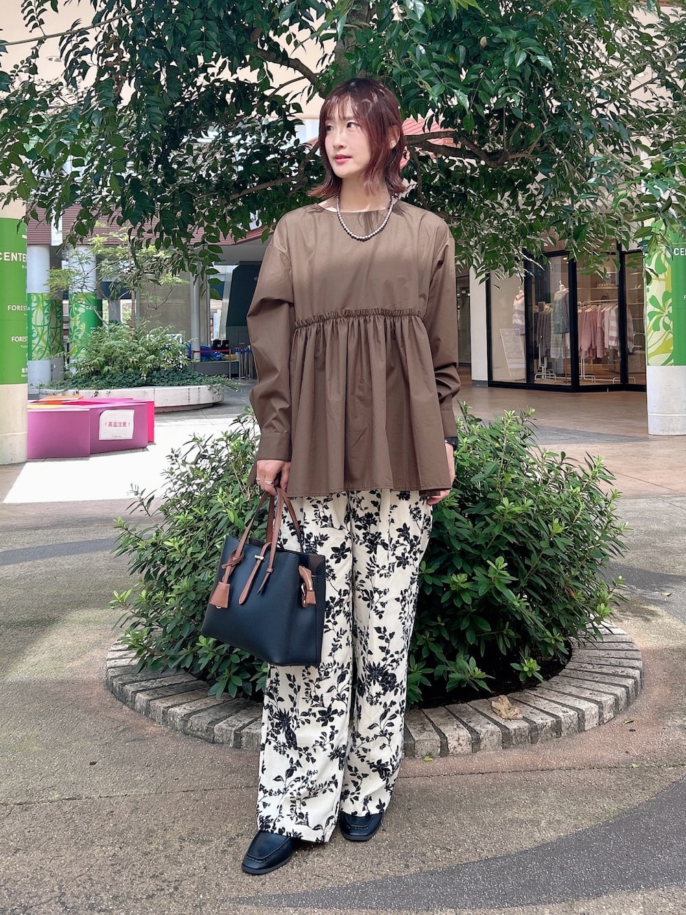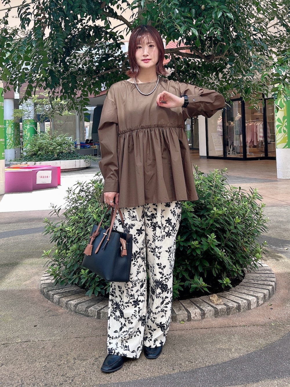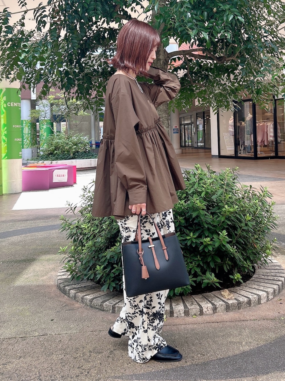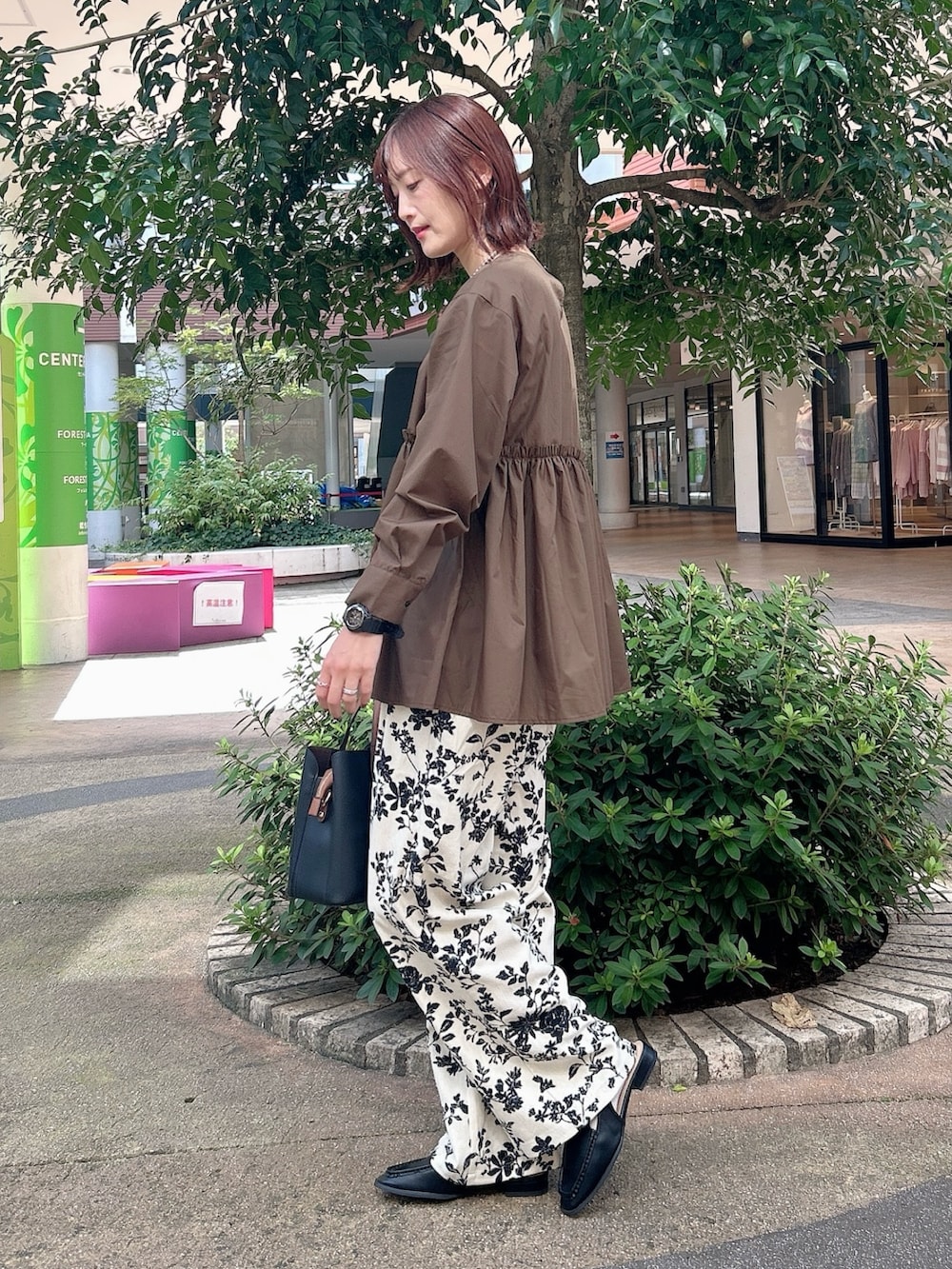 ✔︎ ふんわりシルエットが可愛いウエストギャザーデザイン。落ち着いたブラウンカラーで、甘さを抑えた大人な印象に。