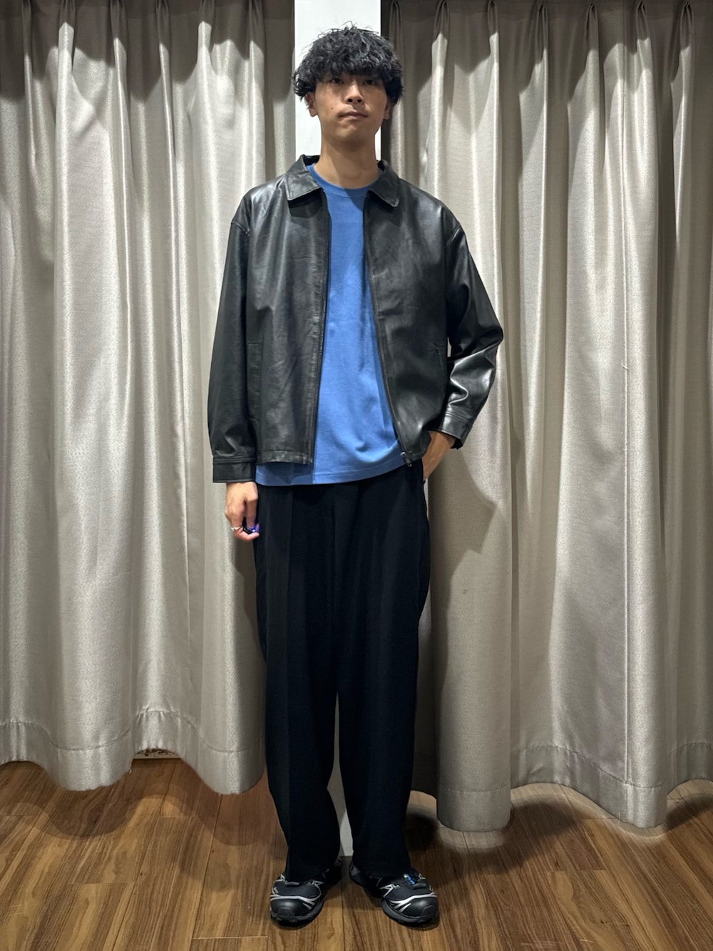 フェイクレザーのジャケットを使ったミリタリー感のあるスタイル。