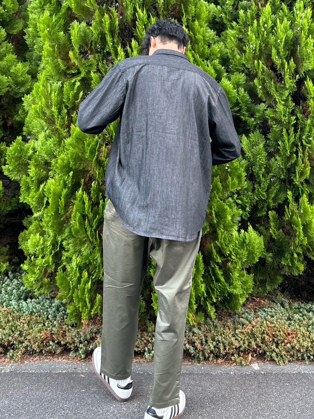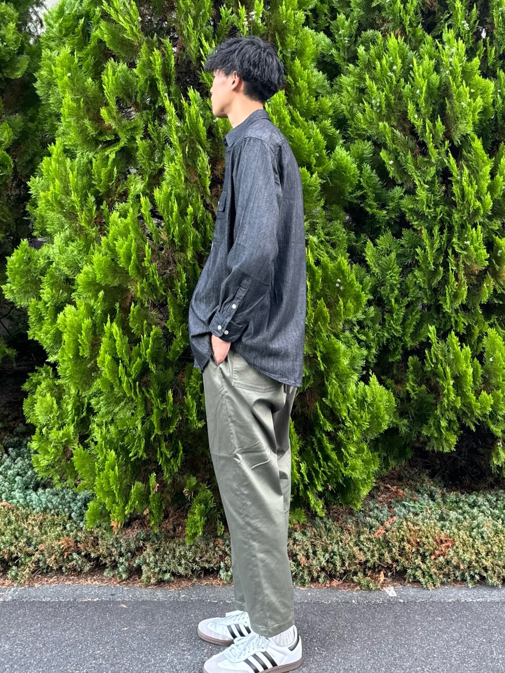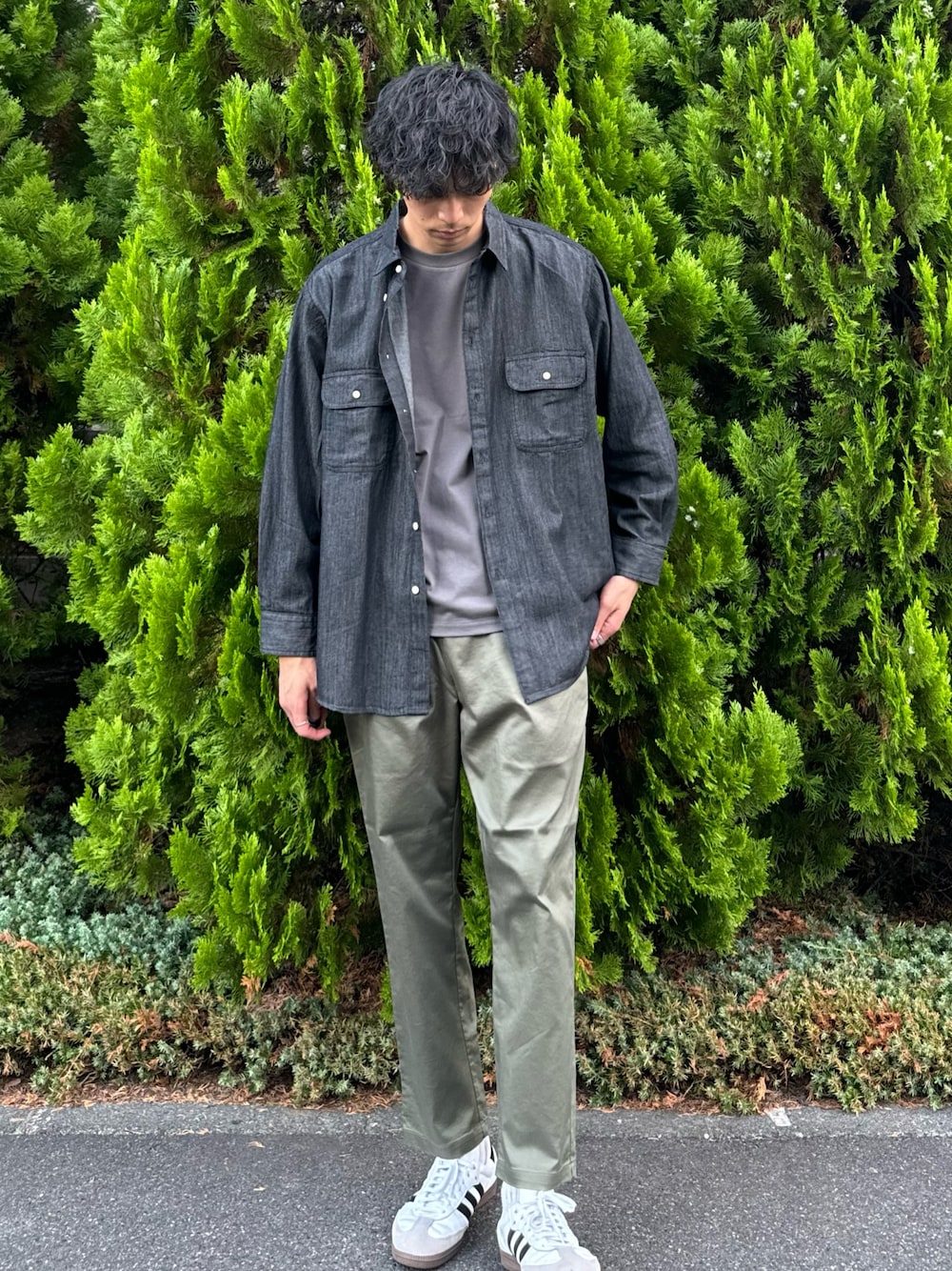王道カラーでまとめて、シンプルになり過ぎないよう、洗い加工のデニムシャツでワンアクセント。