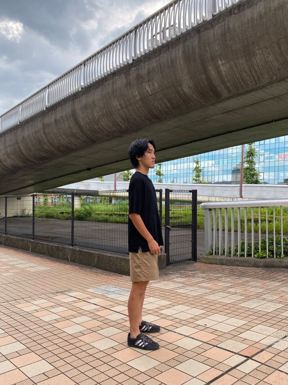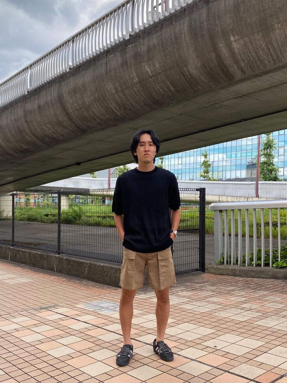 ショーツは膝上の丈で幼く見えがちですが、ベージュで大人っぽさを演出できます。