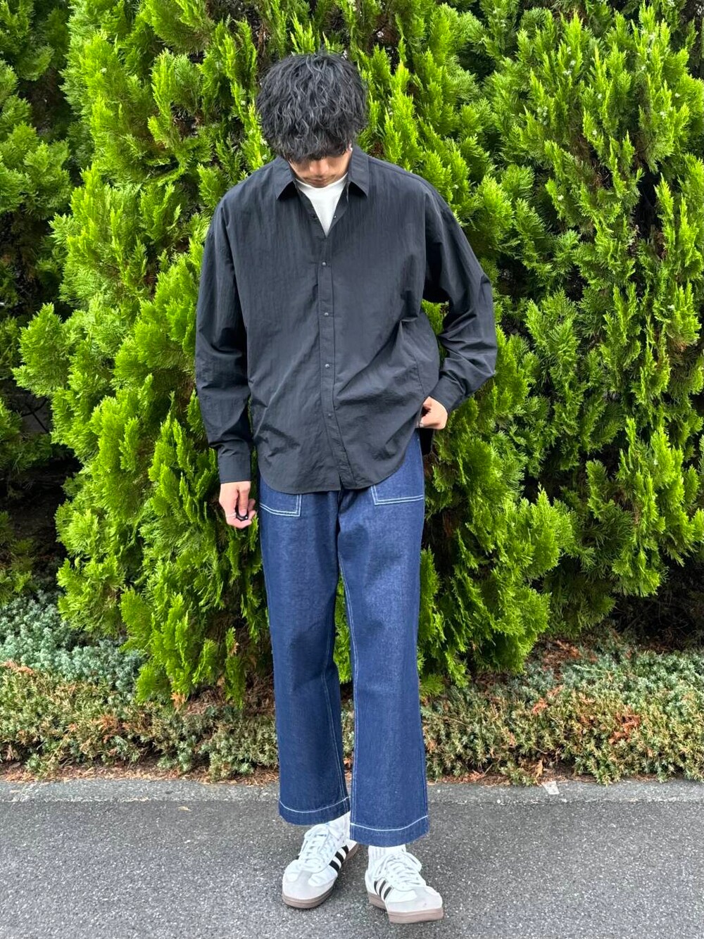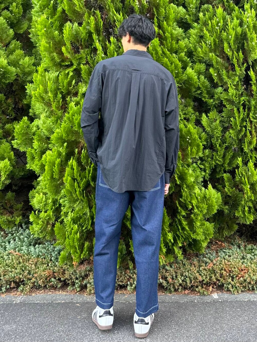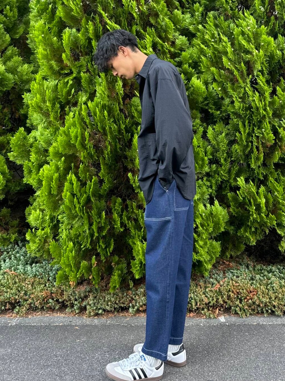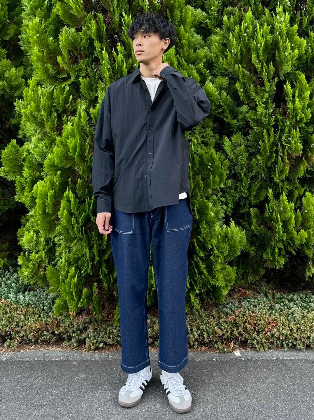 デニム×黒シャツで秋カラー入れつつ、インナーに白入れることで誰でも楽しめるスタイリングに。