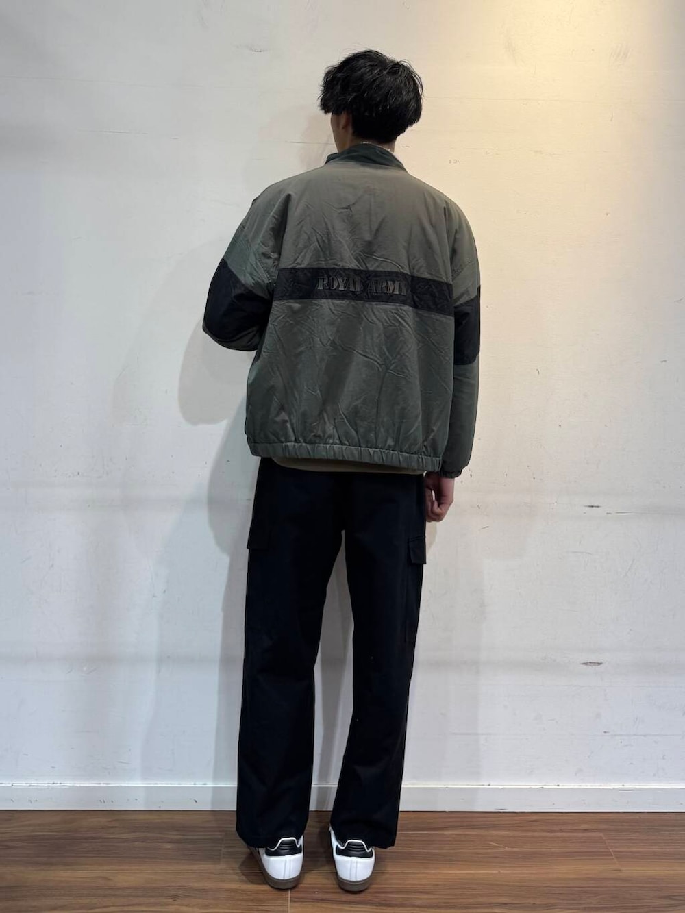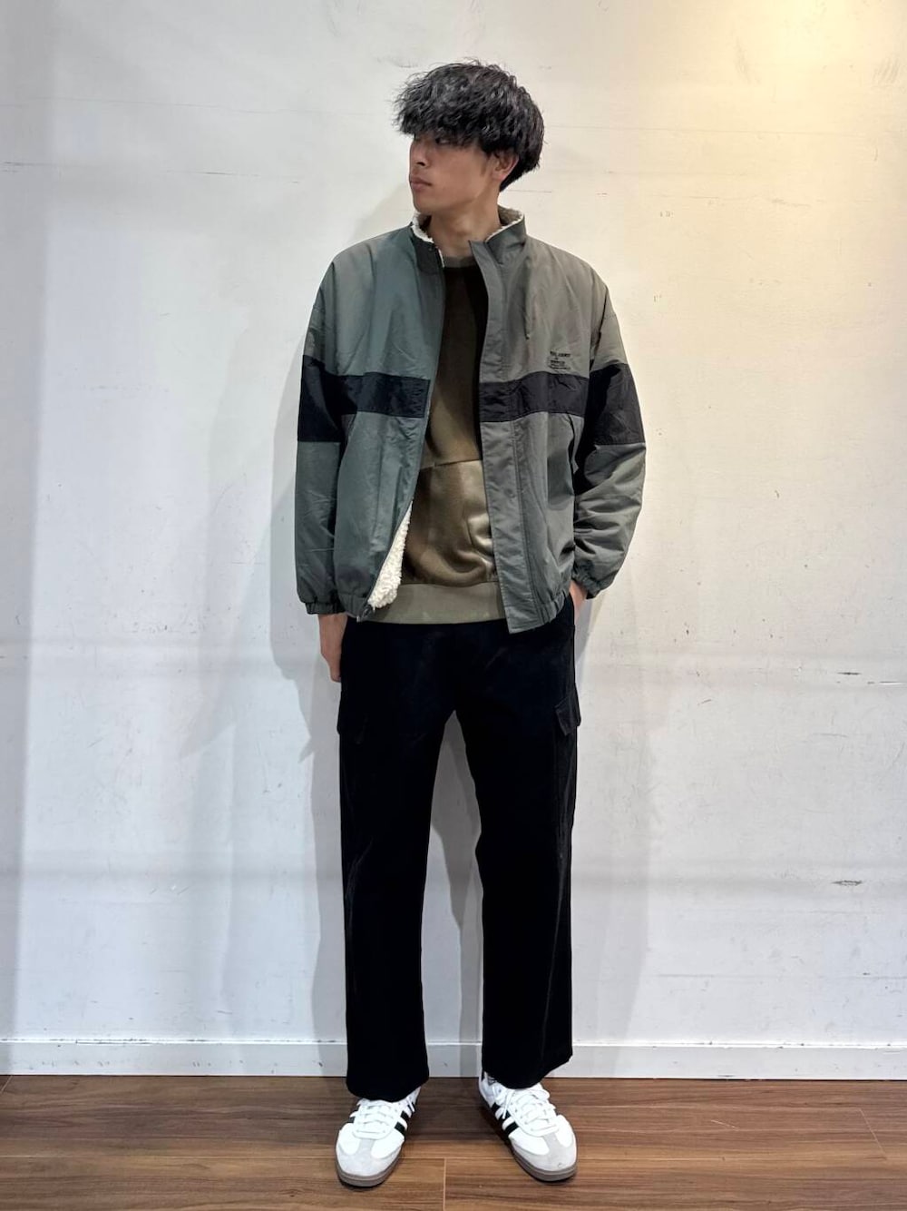 雰囲気合わせで、フェイクスエードスウェットとカーゴパンツで。