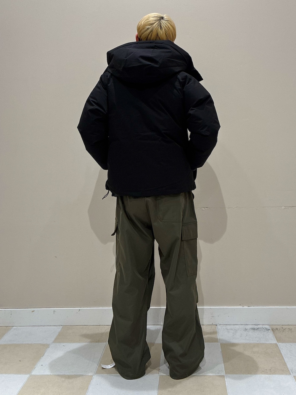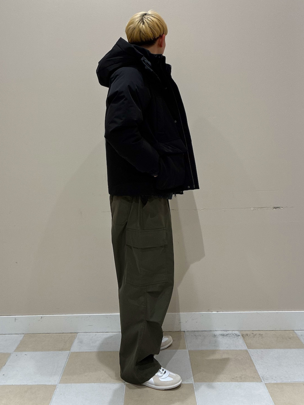 ボリュームのある黒のパフジャケットを主役に、無骨なカーゴパンツを合わせた、冬のストリートスタイル。