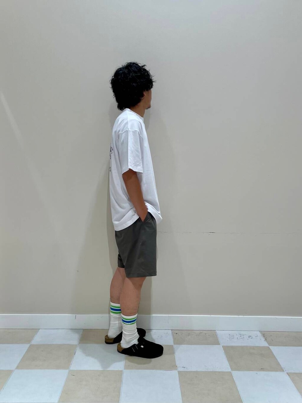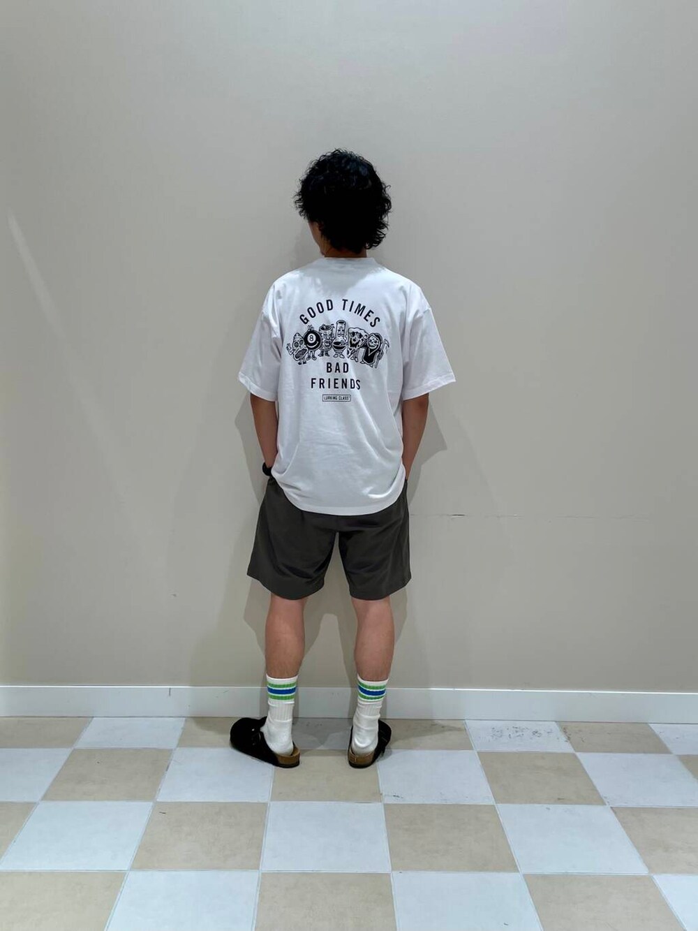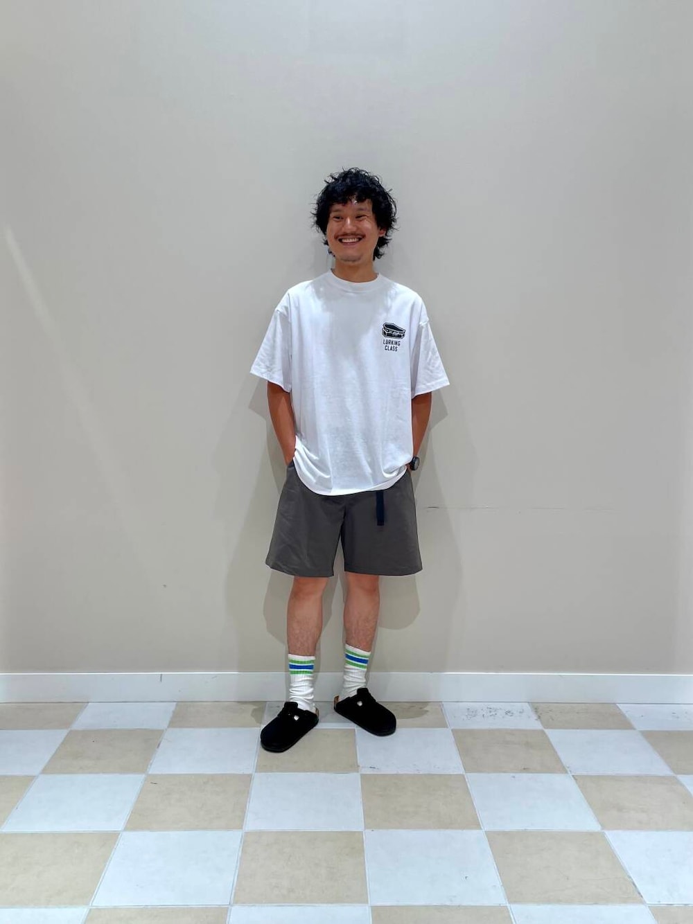 LURKING CLASSのTシャツを使ったコーディネートです!サイズ感はゆったりとしていて、ショートパンツとも相性良いです!