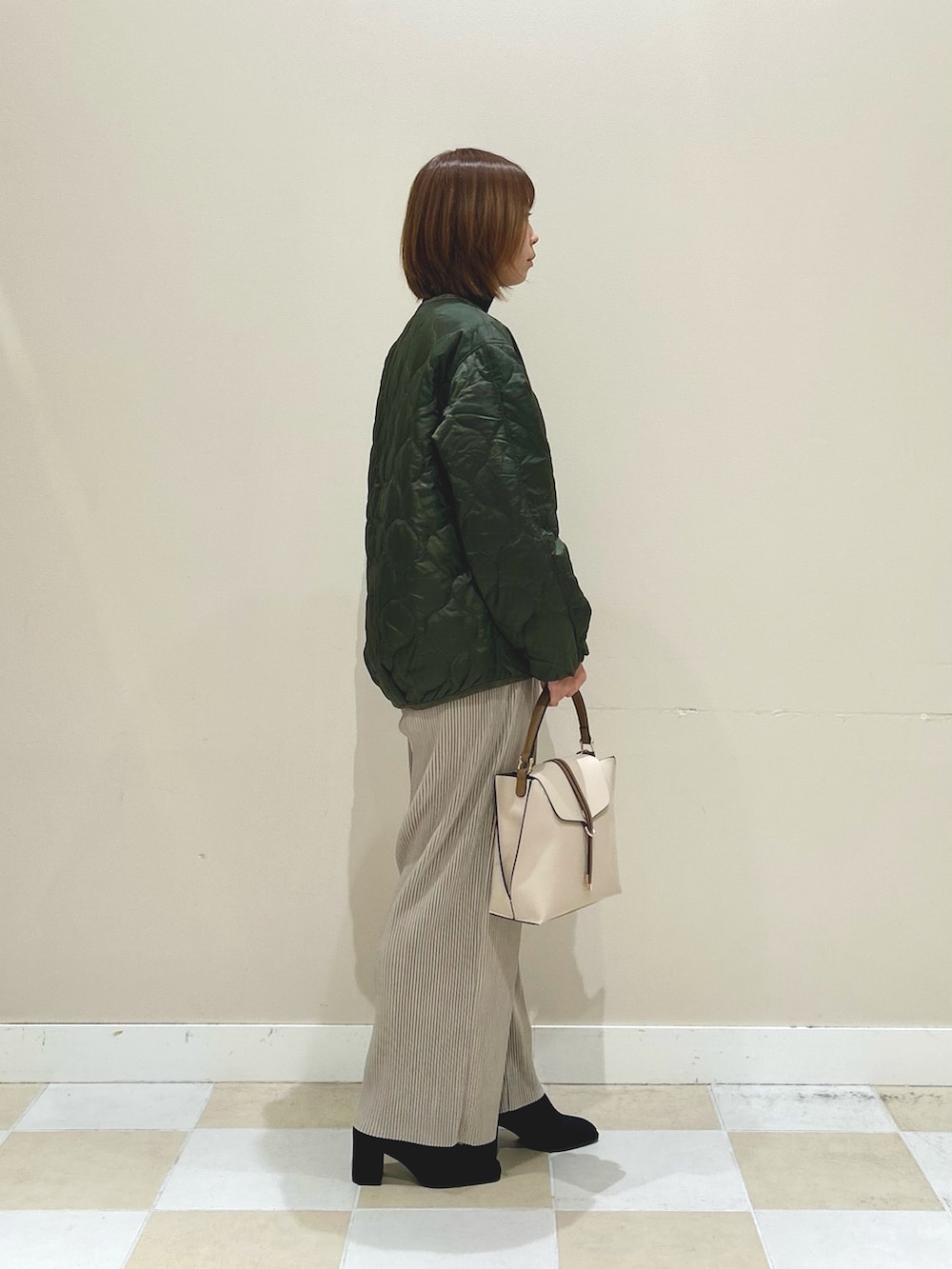 インナーはハイネックの薄手のニット、パンツはベロア素材のプリーツパンツでさらっとカジュアルに合わせました!