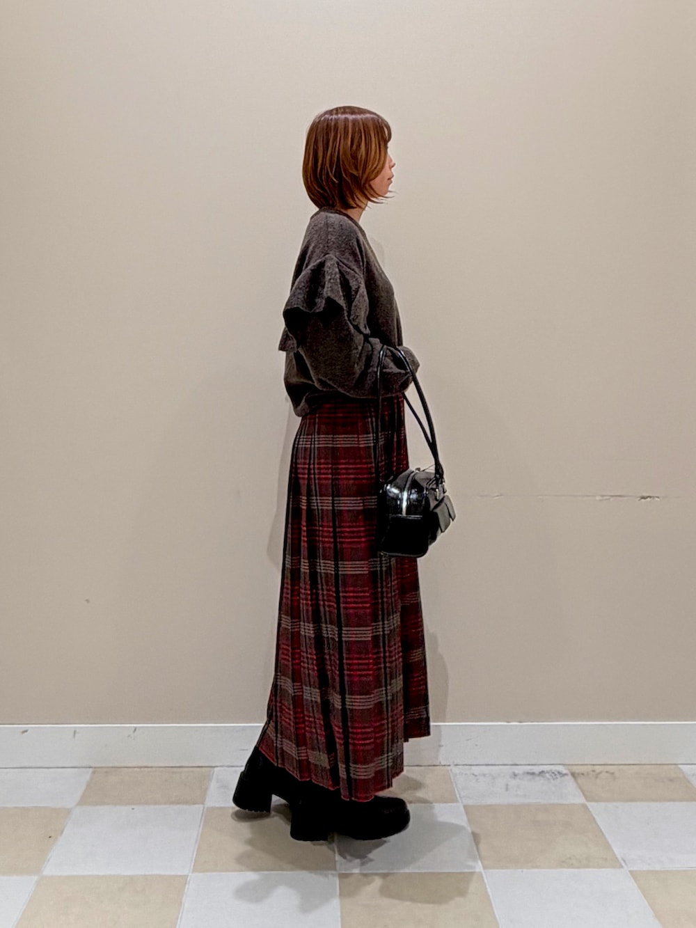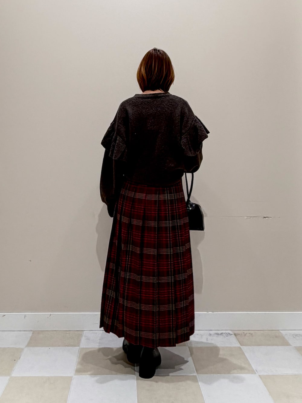 フリルスリーブがポイントのニットにチェックプリーツスカートとブーツでガーリーなスタイルにしました!