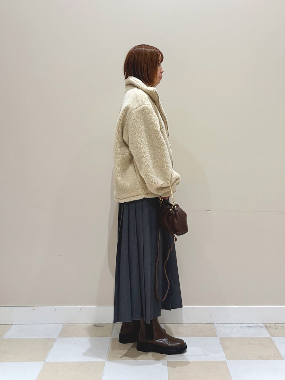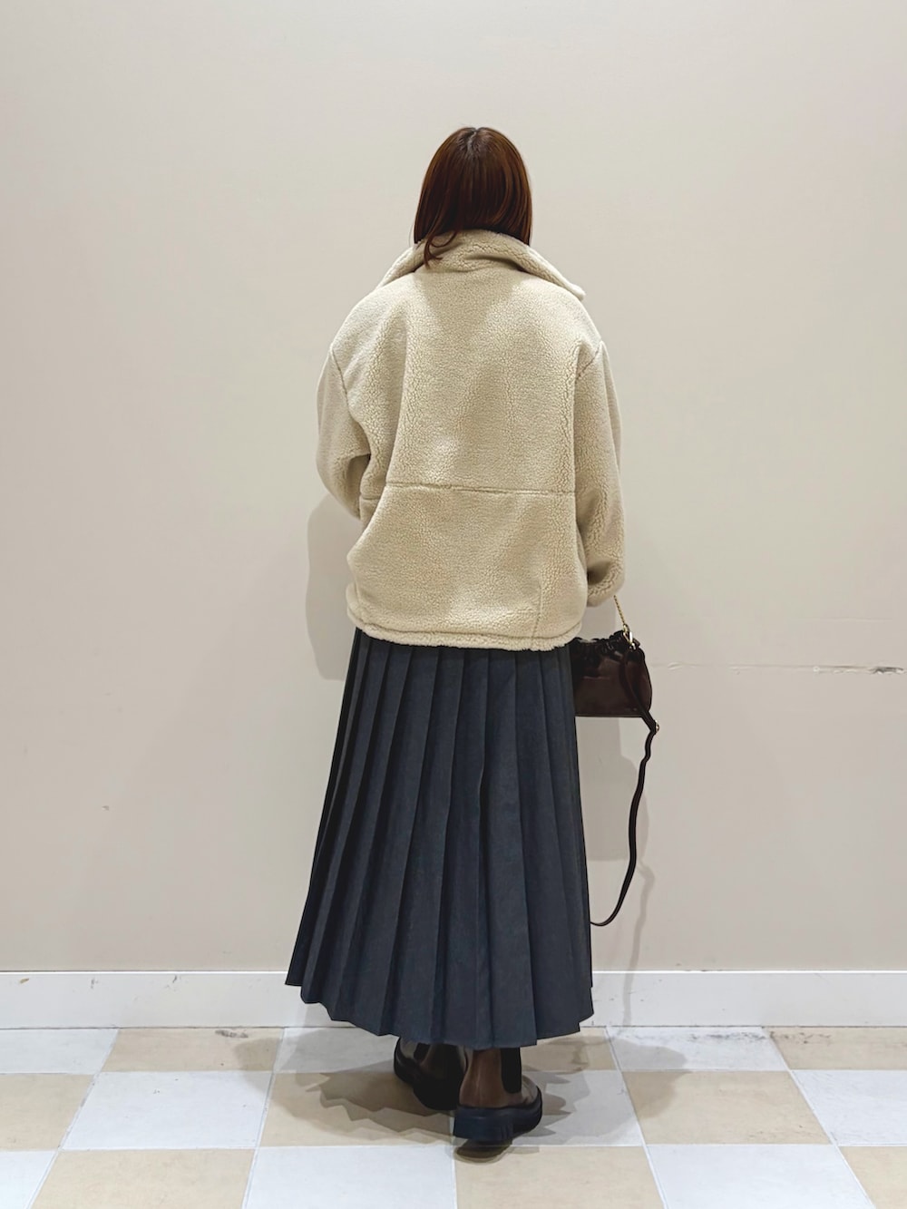 ボリューム感のあるボアが暖かく羽織れるジップブルゾンにボーダーニットにプリーツスカートでシンプルなコーディネートに。