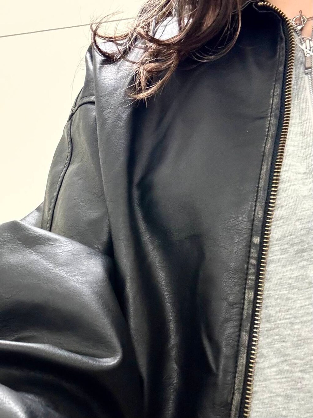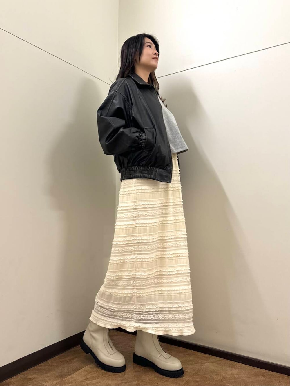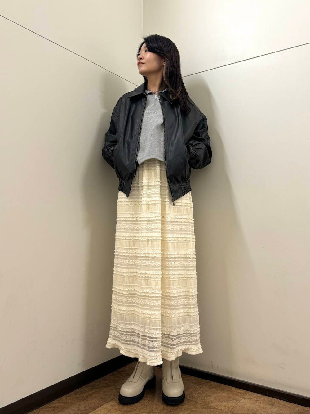ハードな印象になりやすいですがスカートや女性らしいアイテムと合わせると着こなしやすいです◎