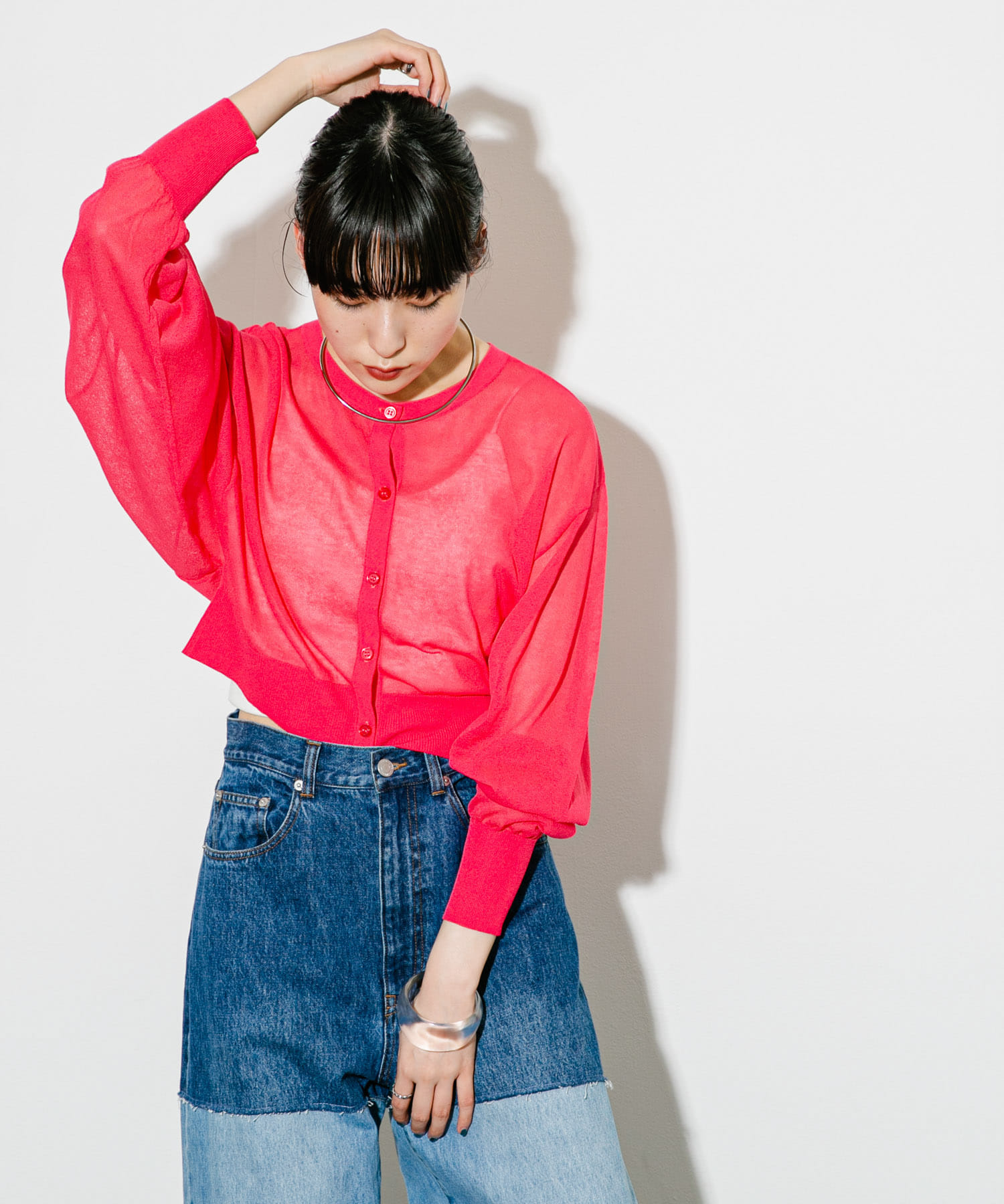 ついつい手に取りたくなるパキッとしたピンクカラー。透け感があるのでプリントTを合わせたりキャミソールを合わせてヘルシーにしても可愛いですよ^^